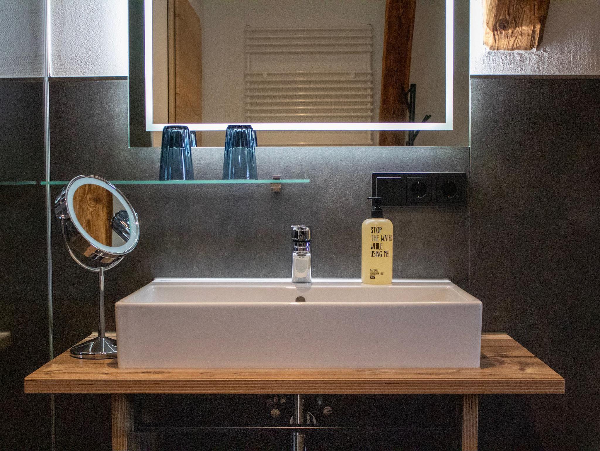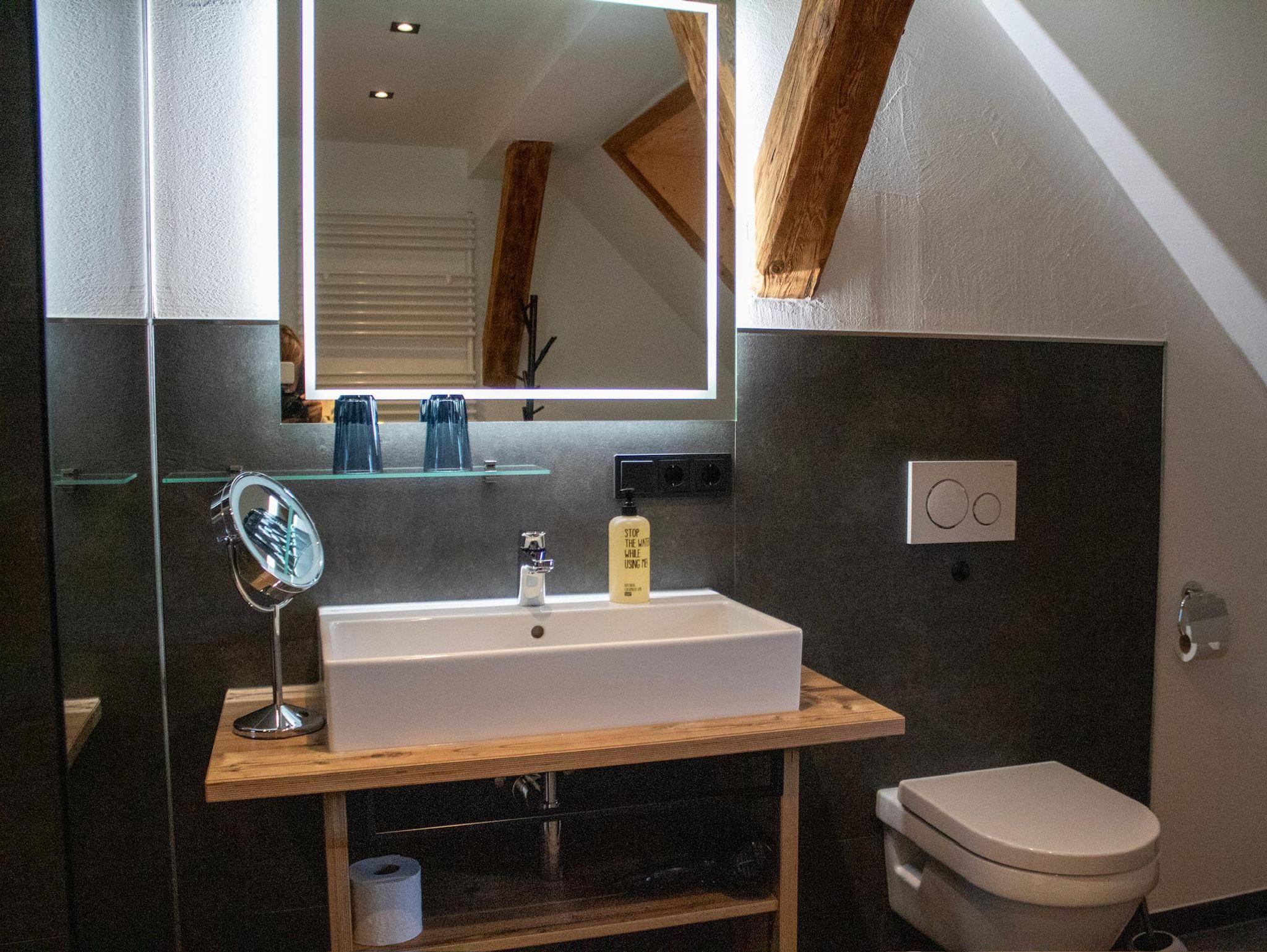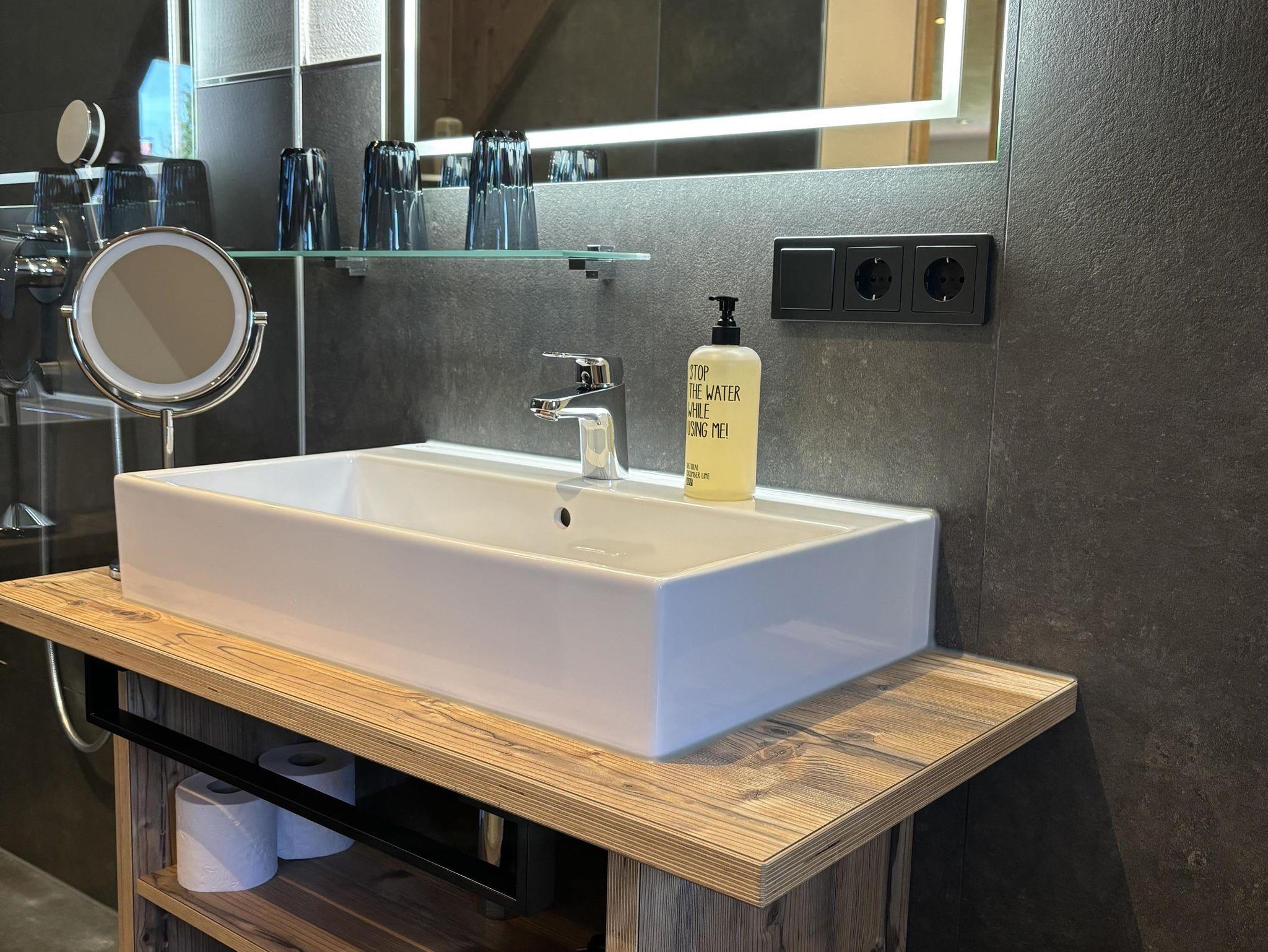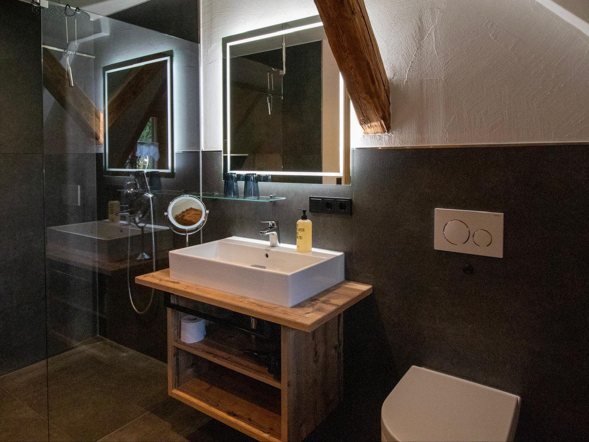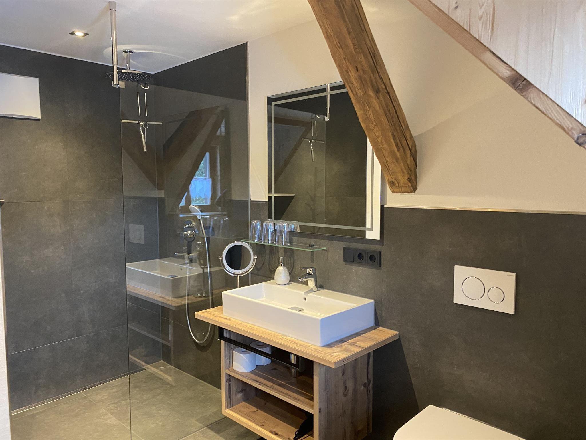 - einem Tageslichtbad mit Regendusche, Spiegel beheizt, Kosmetikspiegel, Fön, Radio mit Bluetooth