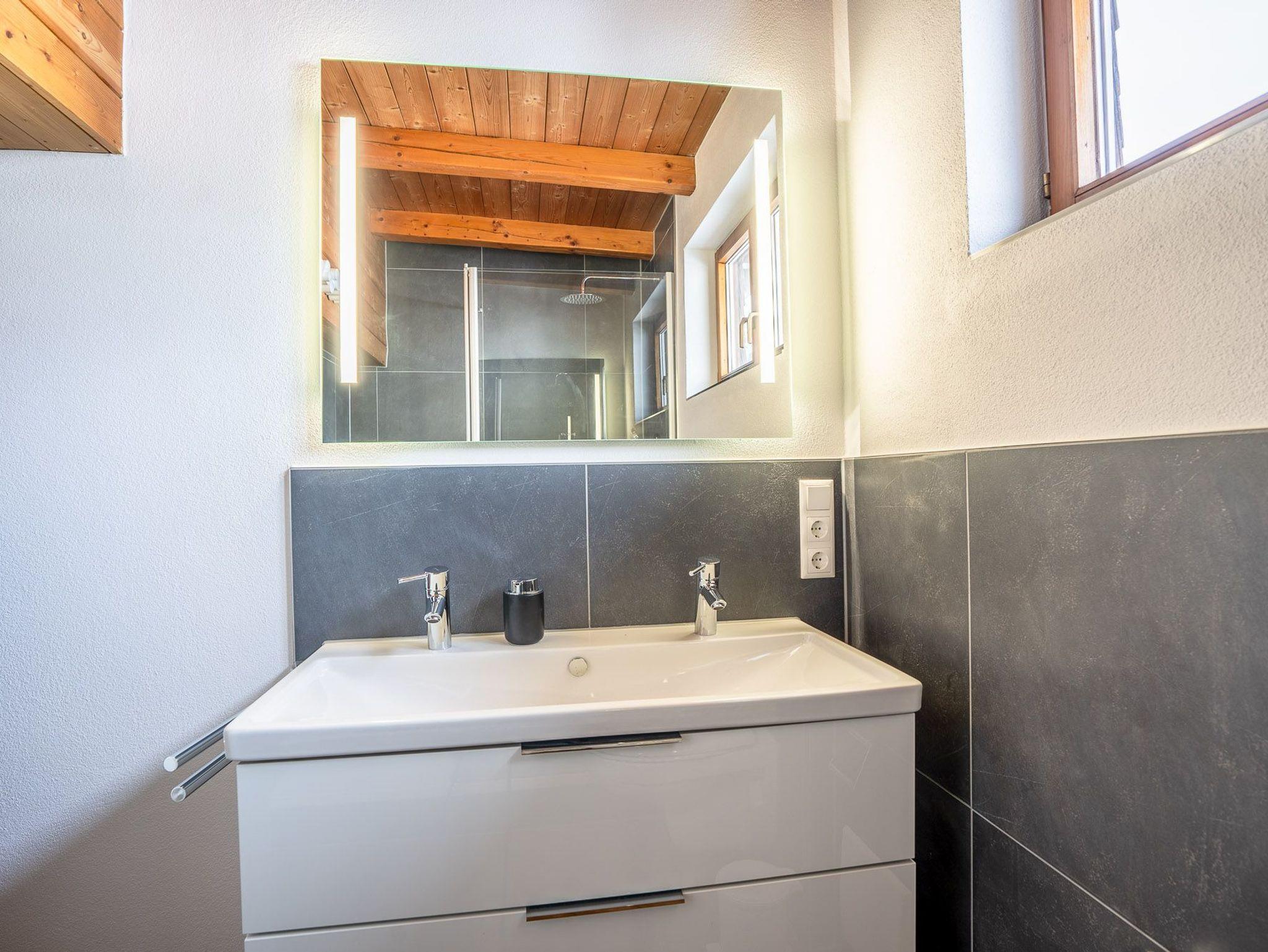 Im freundlich und modern gestalteten Bad befindet sich eine große Dusche, ein WC und ein Föhn. Nebenan finden Sie ein extra WC.