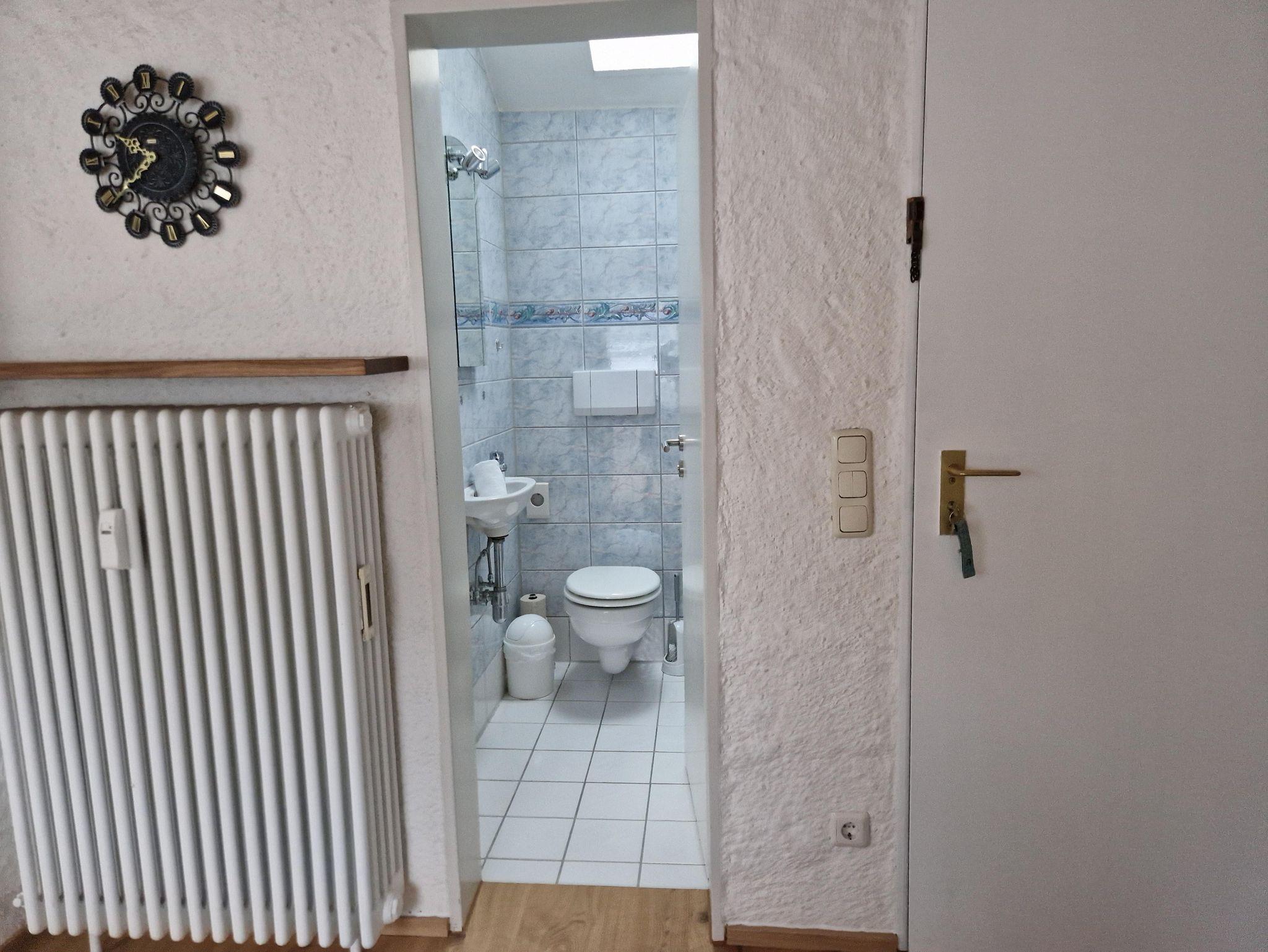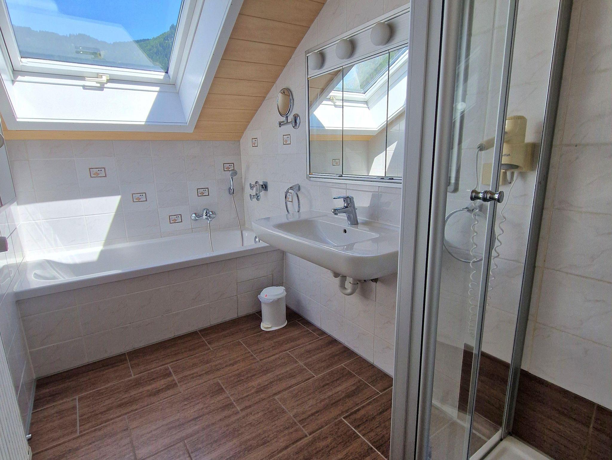 Badezimmer mit Badewanne und Dusche, separates WC.