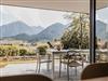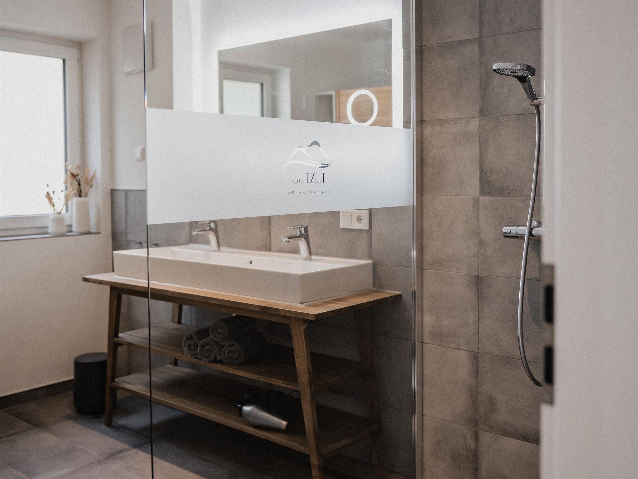 Das Appartement im Erdgeschoss befindet sich auf der Süd Westseite des Hauses und verfügt über eine wunderschöne Terrasse mit eigenem Garten. Zwei Schlafzimmer sind mit komfortablen Zirbenholz-Doppelbetten ausgestattet, und im Wohnzimmer befindet sich zusätzlich eine Schlafcouch zum getrennt schlafen. Der Wohn- und Essbereich umfasst eine moderne, voll ausgestattete Küche mit Panoramasitzfenster und Ausblick auf die umliegende Bergwelt. Die Wohnung bietet ein Bad und ein separates WC sowie eine Infrarotkabine.