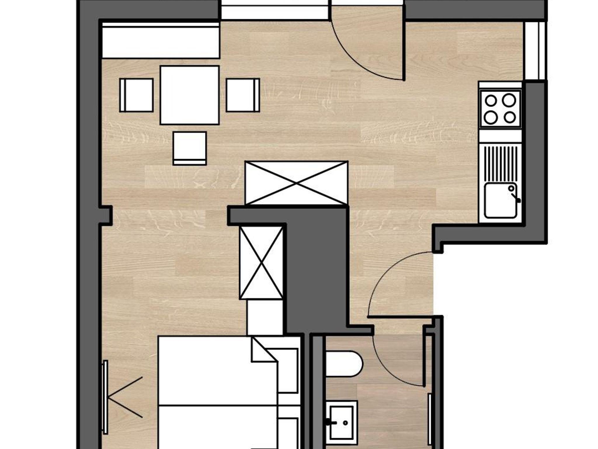 Kleines Appartement (40m²) für 2 Personen mit Wohnküche und offenem Schlafraum sowie Südbalkon mit Bergblick.