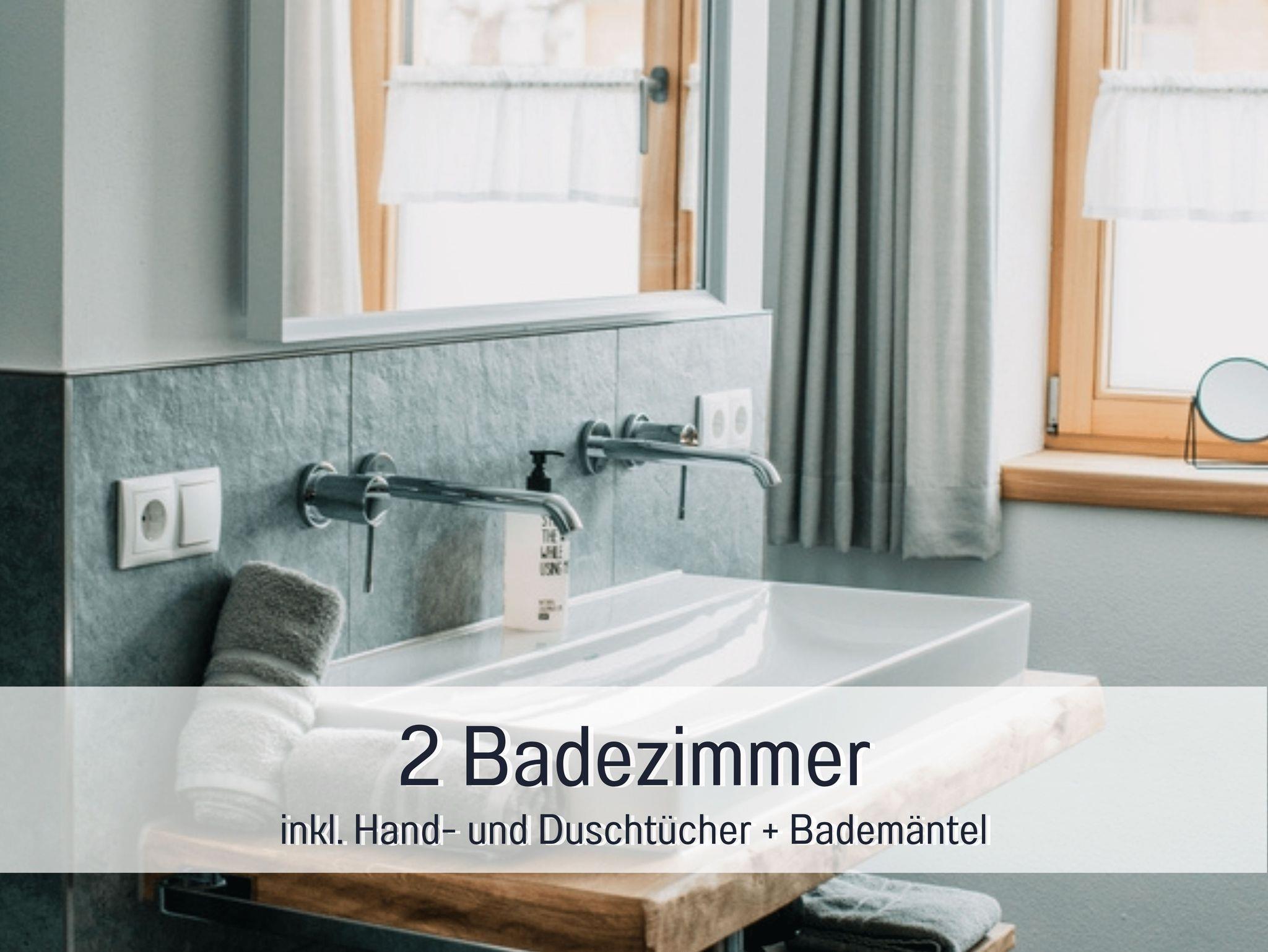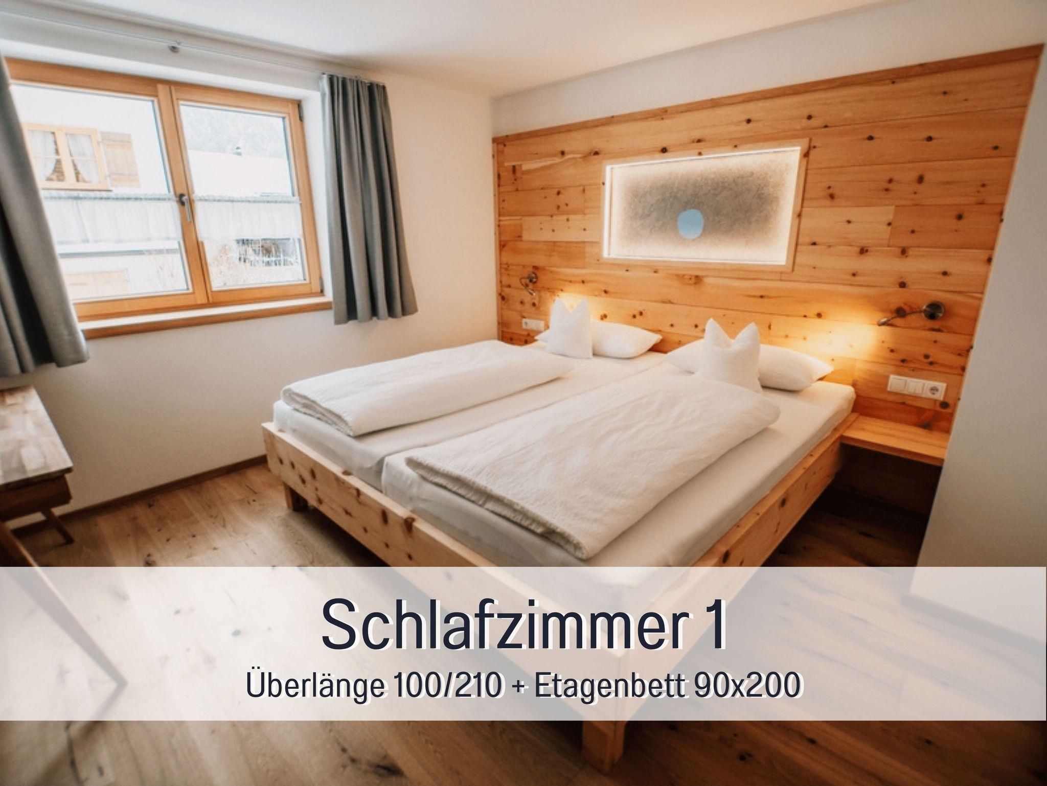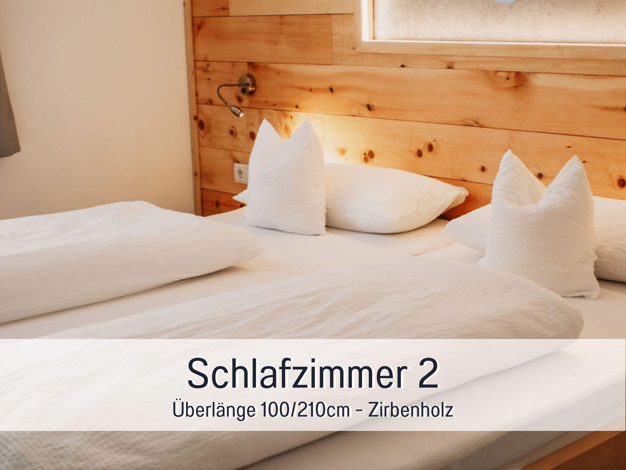 • zwei getrennte Schlafzimmer mit Doppelbetten aus Zirbe in Überlänge