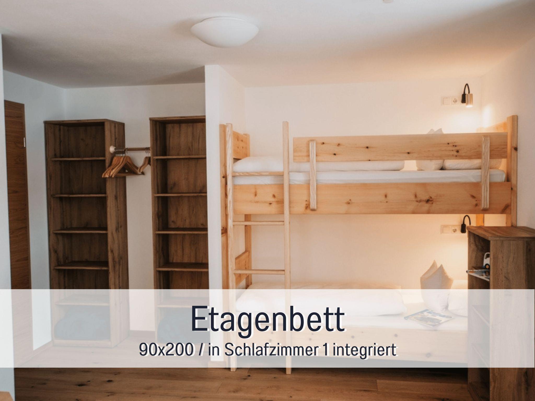 • zusätzliches Etagenbett (90x200cm) aus Zirbe in einem der Schlafzimmer