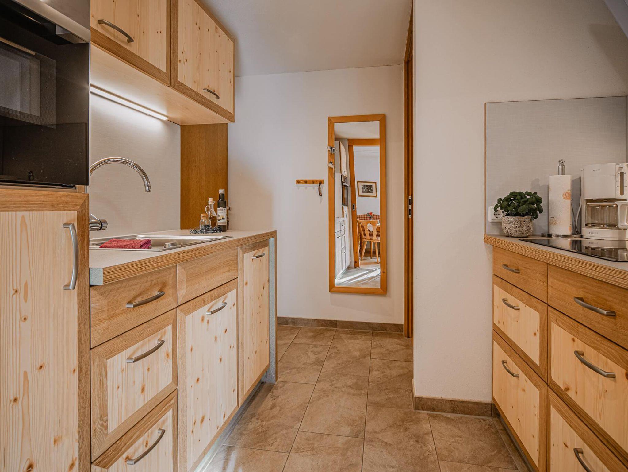Küche mit 4 Kochplatten, Backofen und Mikrowelle, Spülmaschine, Kaffeemaschine, Espressokocher, Wasserkocher, Toaster, Eierkocher, diverse Arbeitsgeräte, Kochtöpfe, Gläser und Geschirr.