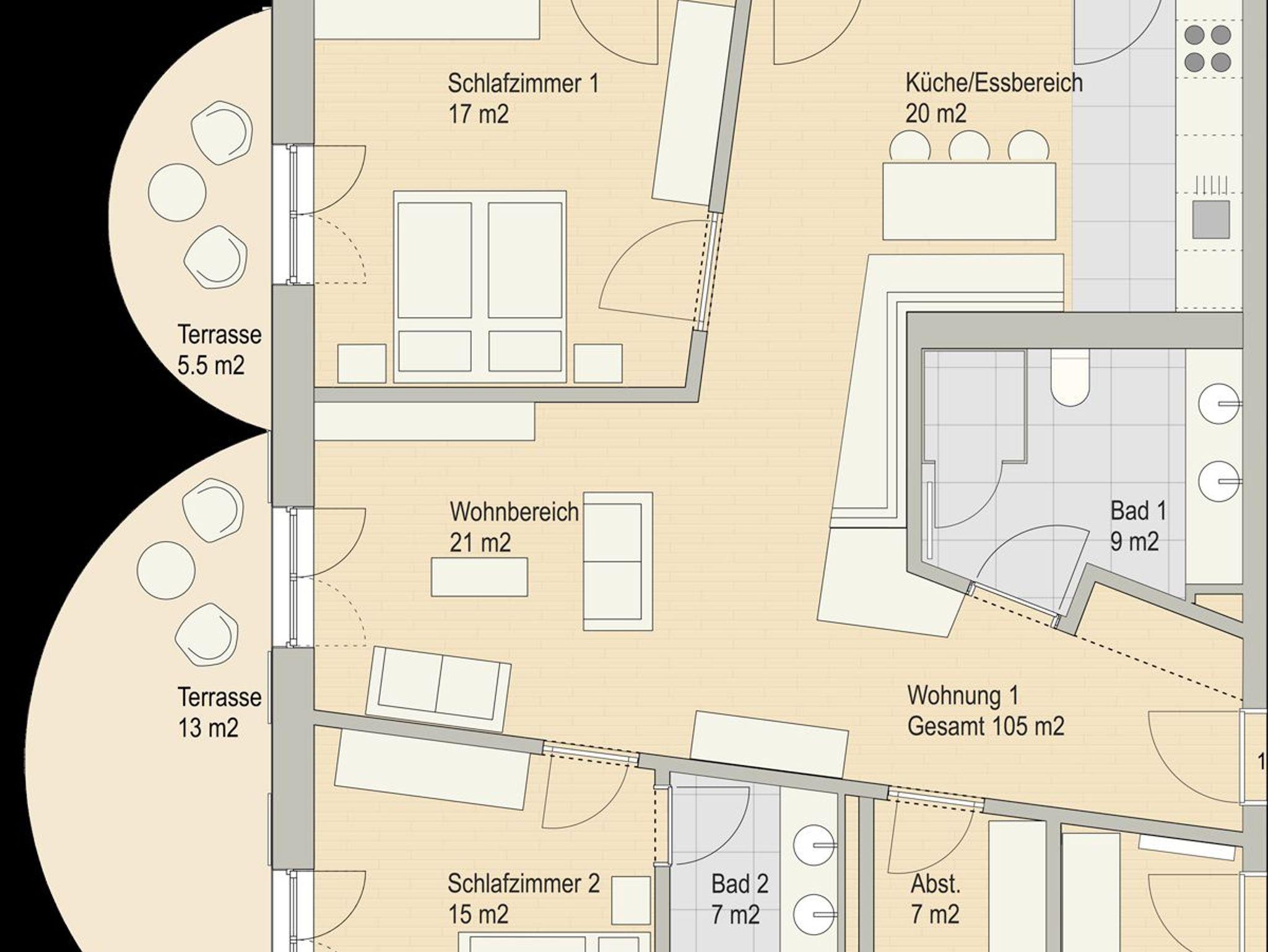 Unsere 110 qm große Wohnung 1 befindet sich im Erdgeschoss mit überdachten Südbalkon und eigenem eingezäunten Garten mit Ostterrasse, wo Sie Ihr Frühstück in der Morgensonne genießen können. Die Wohnung hat zwei Schlafzimmer mit hochwertigen Boxspringbetten und Fernseher. Ein Schlafzimmer hat ein 180x200cm großes Bett das andere ein 180x220cm großes Bett. Es gibt einen großzügigen Ess- und Wohnbereich, einen Infrarotofen mit Ofenbank, zwei Bäder und eine voll ausgestattete Küche.