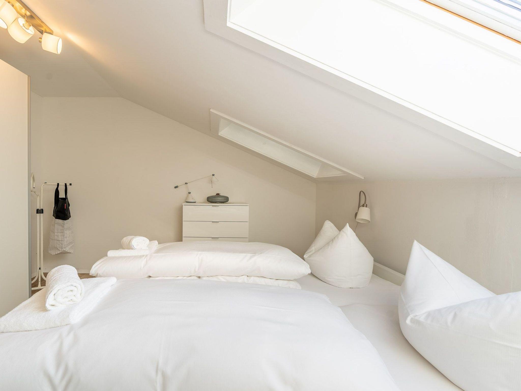 Die Ferienwohnung bietet 1 Schlafzimmer mit Doppelbett sowie 2 Einzelbetten im Wohnbereich ein Wohnzimmer mit Essbereich eine Küche sowie ein Badezimmer mit Duschwanne.