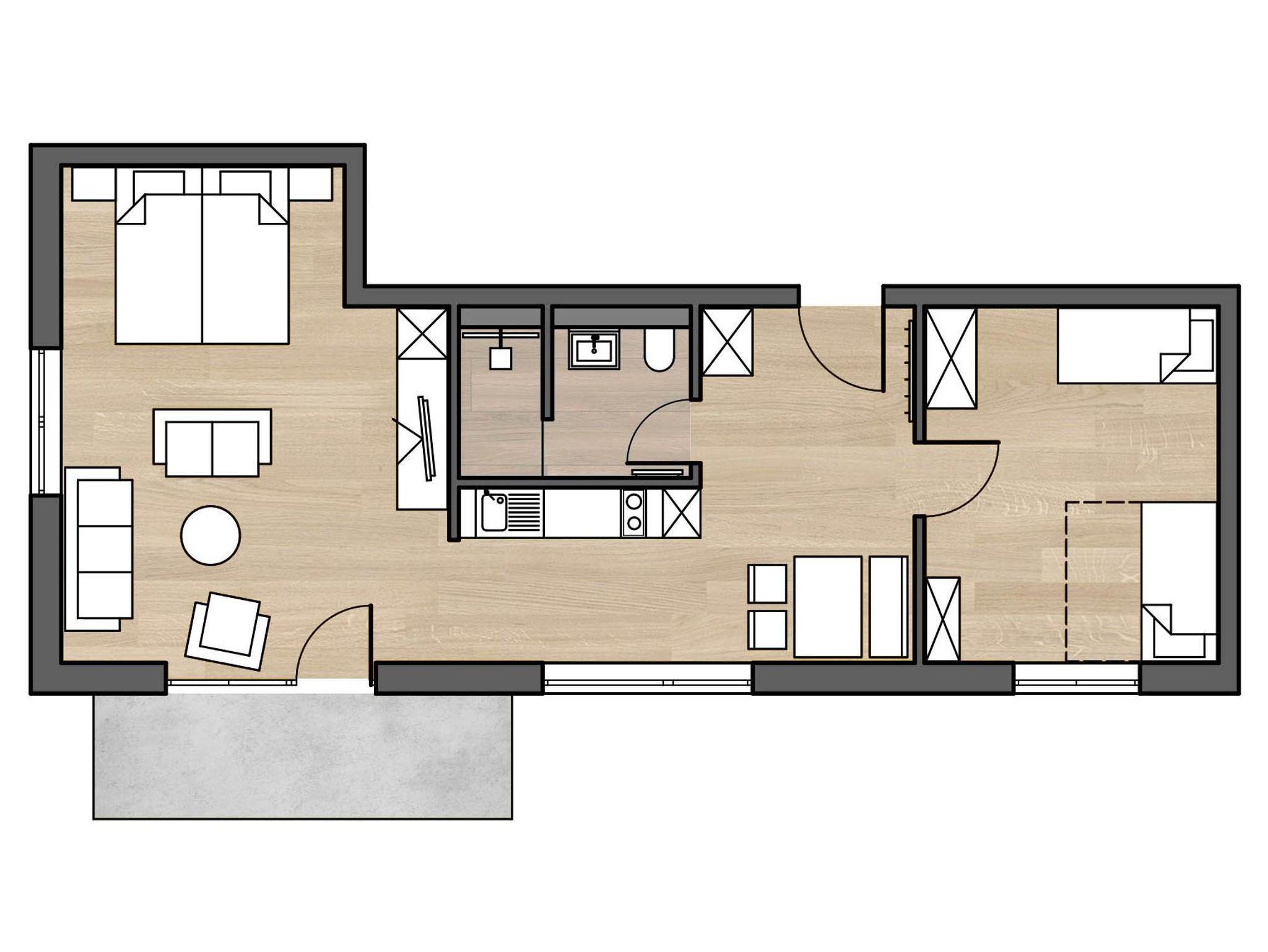 Geräumiges Appartement (65 m²) mit separatem Kinderzimmer für insgesamt 4-5 Personen. Wohnzimmerecke, Elternbett und Küche in einem offenen Raum. Im separaten Kinderzimmer ist inkl. einem Ausziehbett Platz für 3 Kinder. Voll ausgestattete Küche mit Geschirrspüler. Alle Leistungen des Hotels inklusive (Frühstück, Schwimmbad, Sauna, Fitnessraum, Hobbyraum).