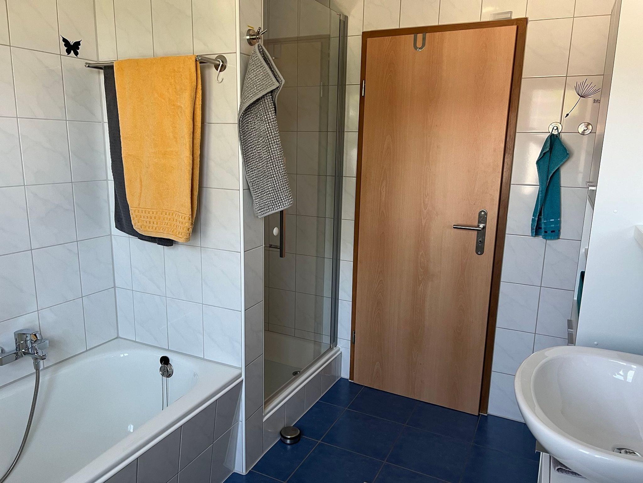 Das Badezimmer ist mit Wanne und separater Dusche ausgestattet.