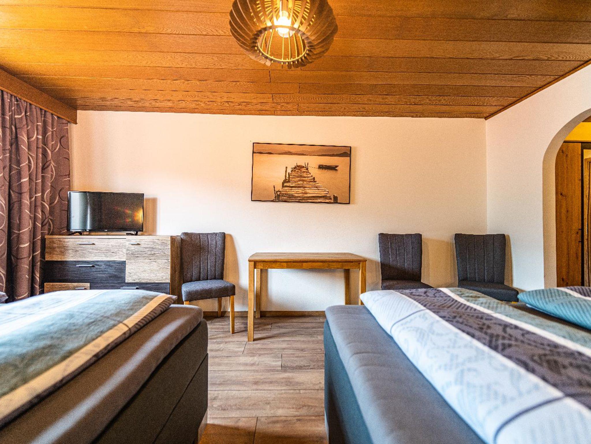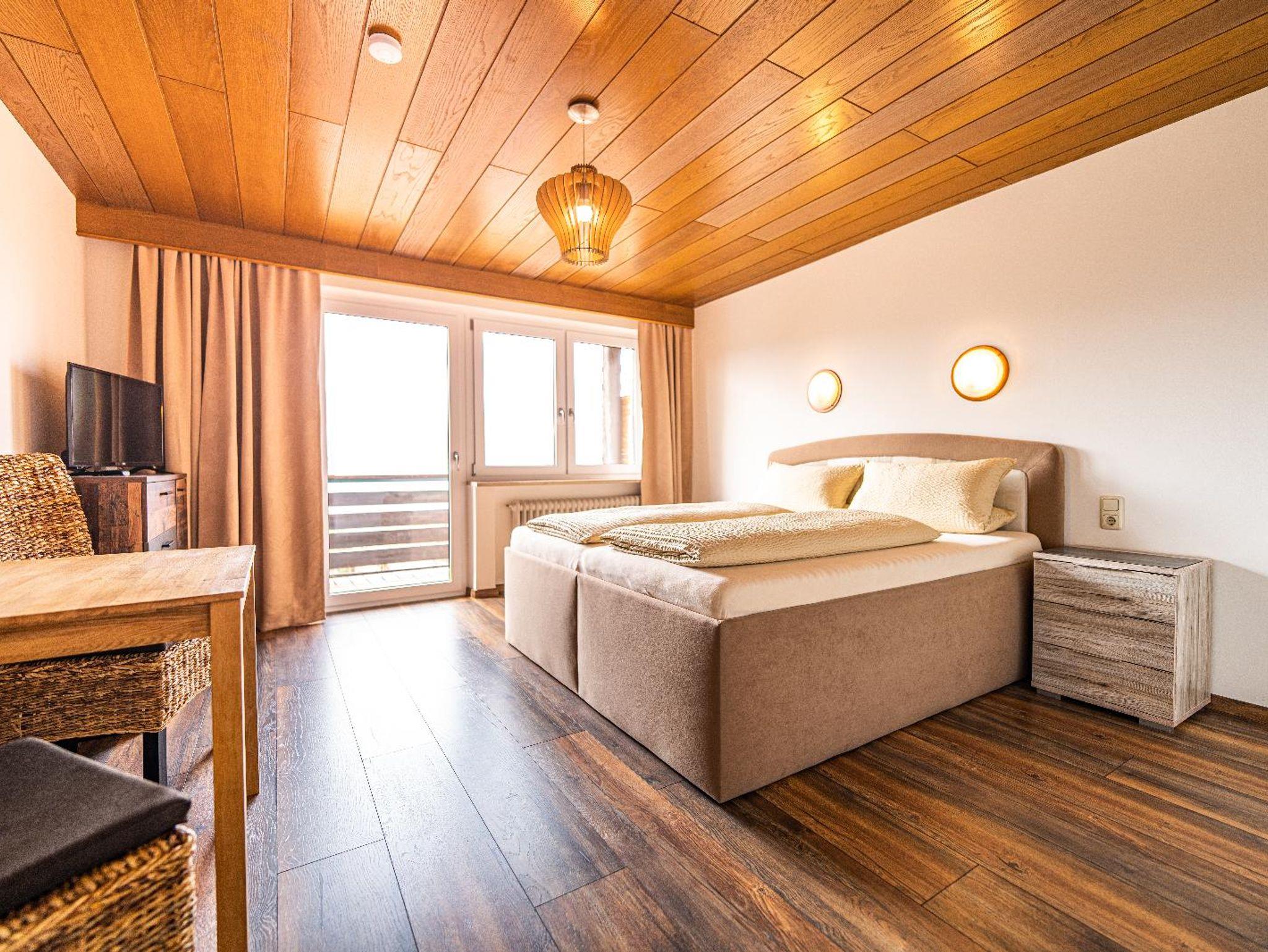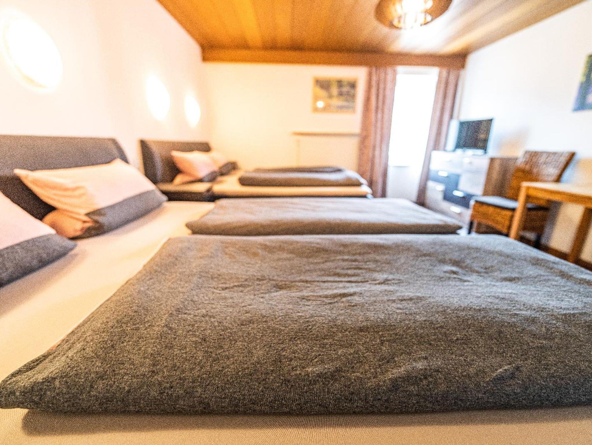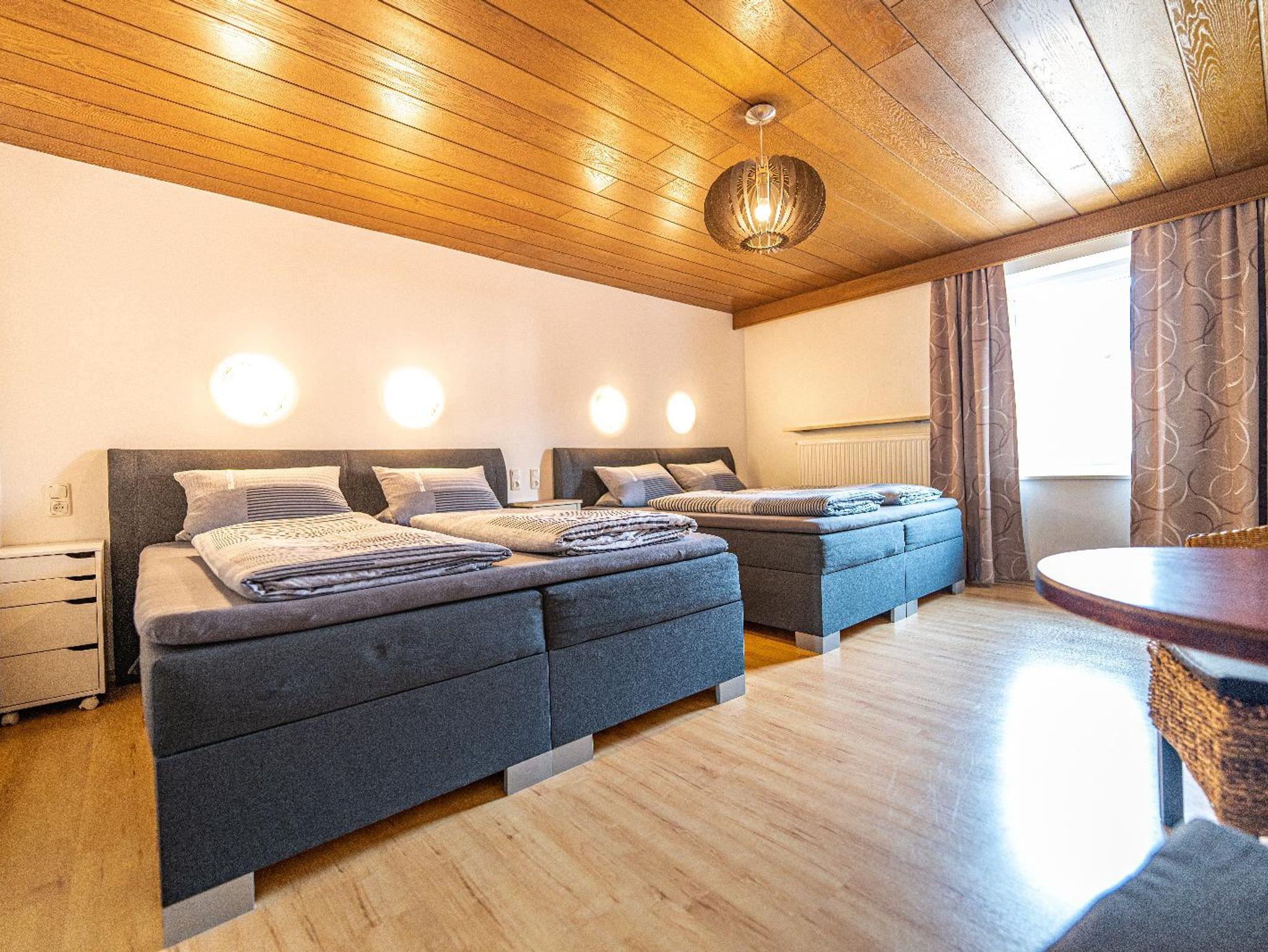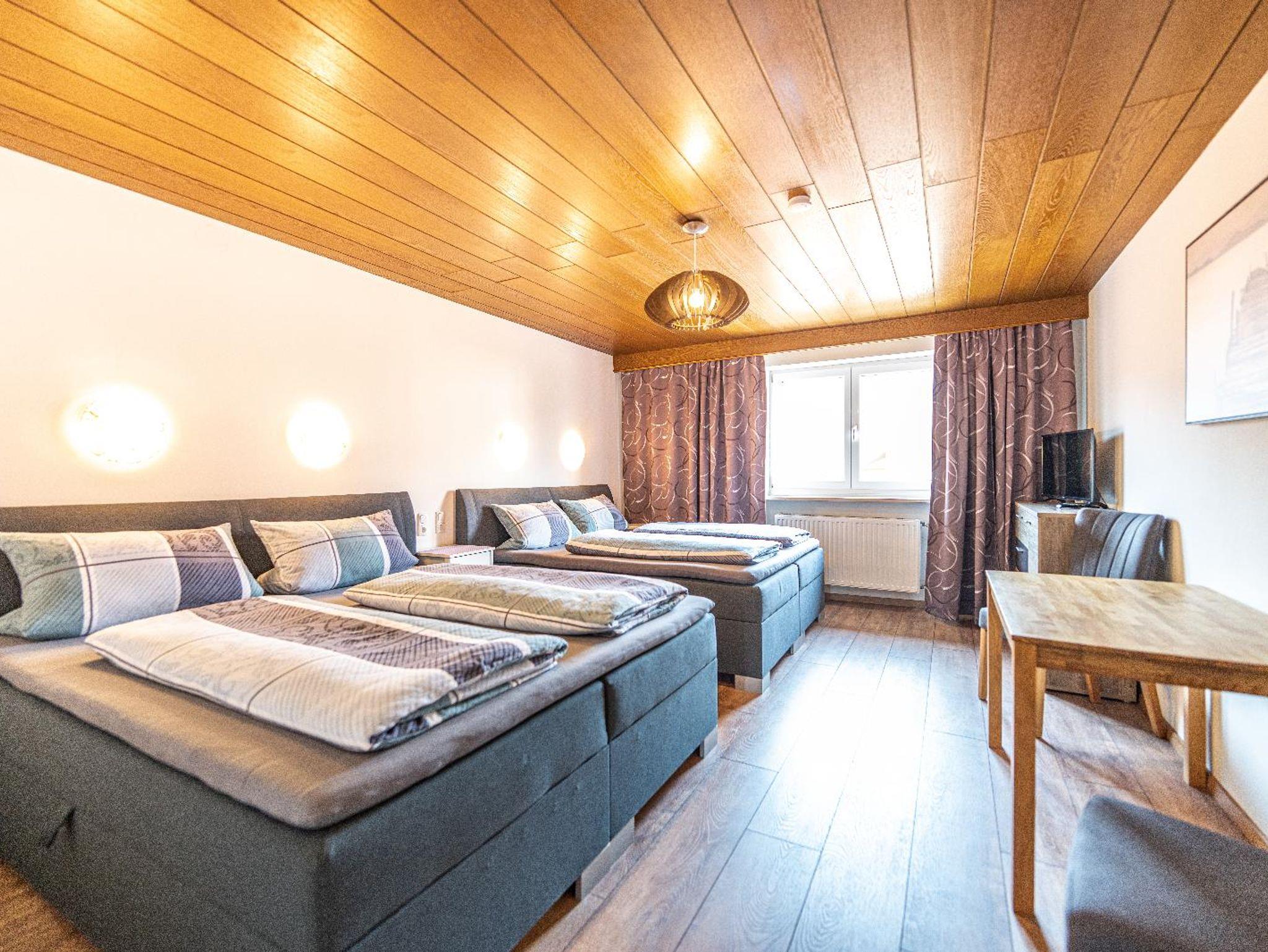 Lichtdurchflutetes Vierbettzimmer mit Holzboden und gemütlichen Komfort Boxspringbetten (180 cm x 200 cm, 180 cm x 200 cm). Ost-Blick auf die schönen bayrischen Berge. Helles Badezimmer mit begehbarer Dusche und WC.