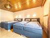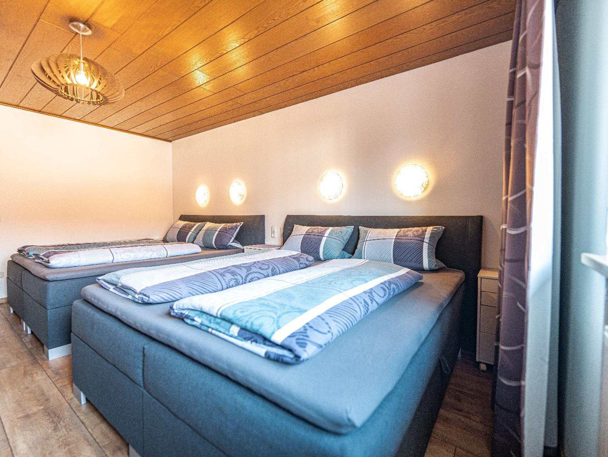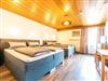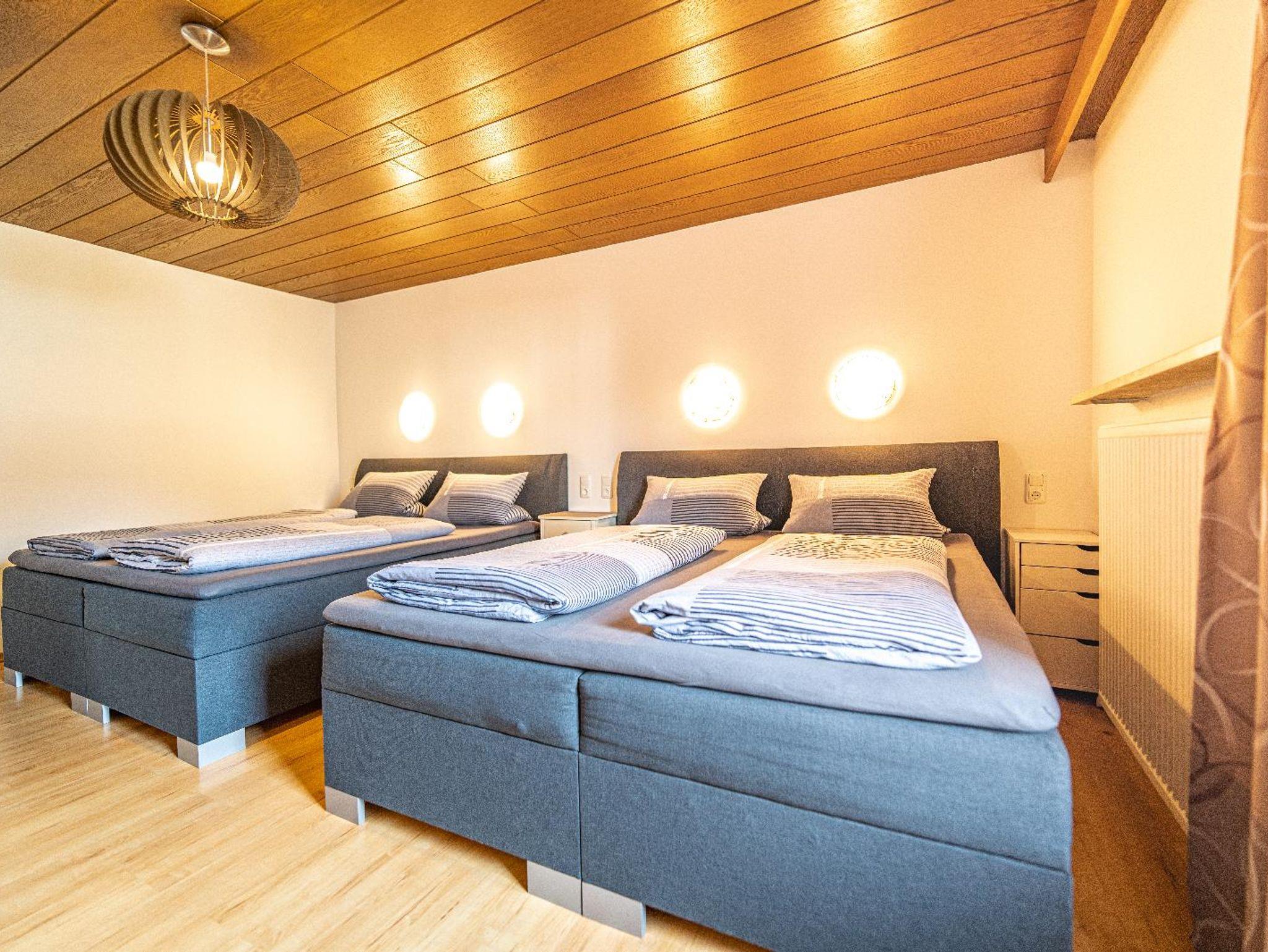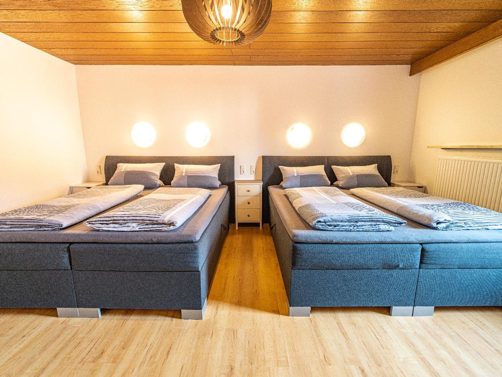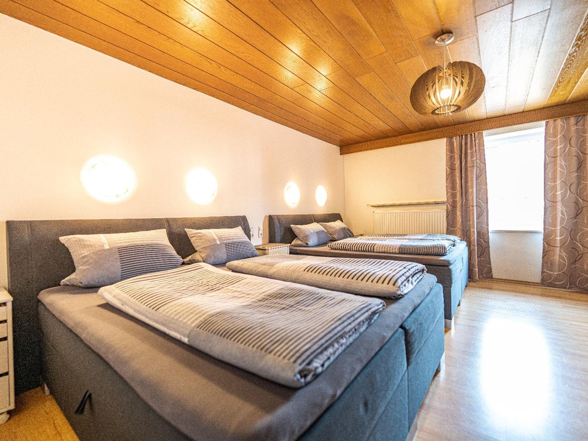 Lichtdurchflutetes Vierbettzimmer mit Holzboden und gemütlichen Komfort Boxspringbetten (180 cm x 200 cm, 180 cm x 200 cm). Ost-Blick auf die schönen bayrischen Berge. Helles Badezimmer mit begehbarer Dusche und WC.