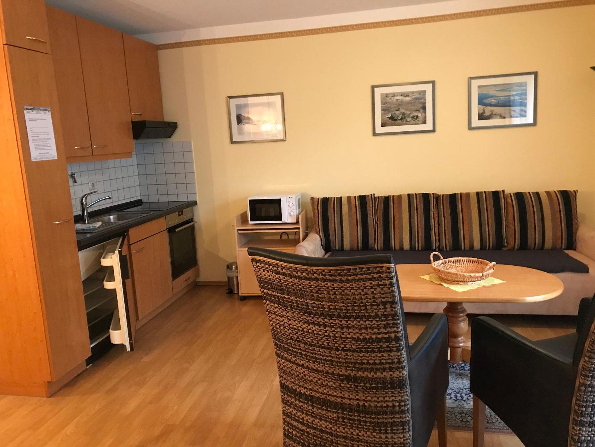 Wohnküche und Terrasse oder Balkon ohne Eintritt ins AQACUR. Das Appartement verfügt über ein Badezimmer mit Dusche/WC
