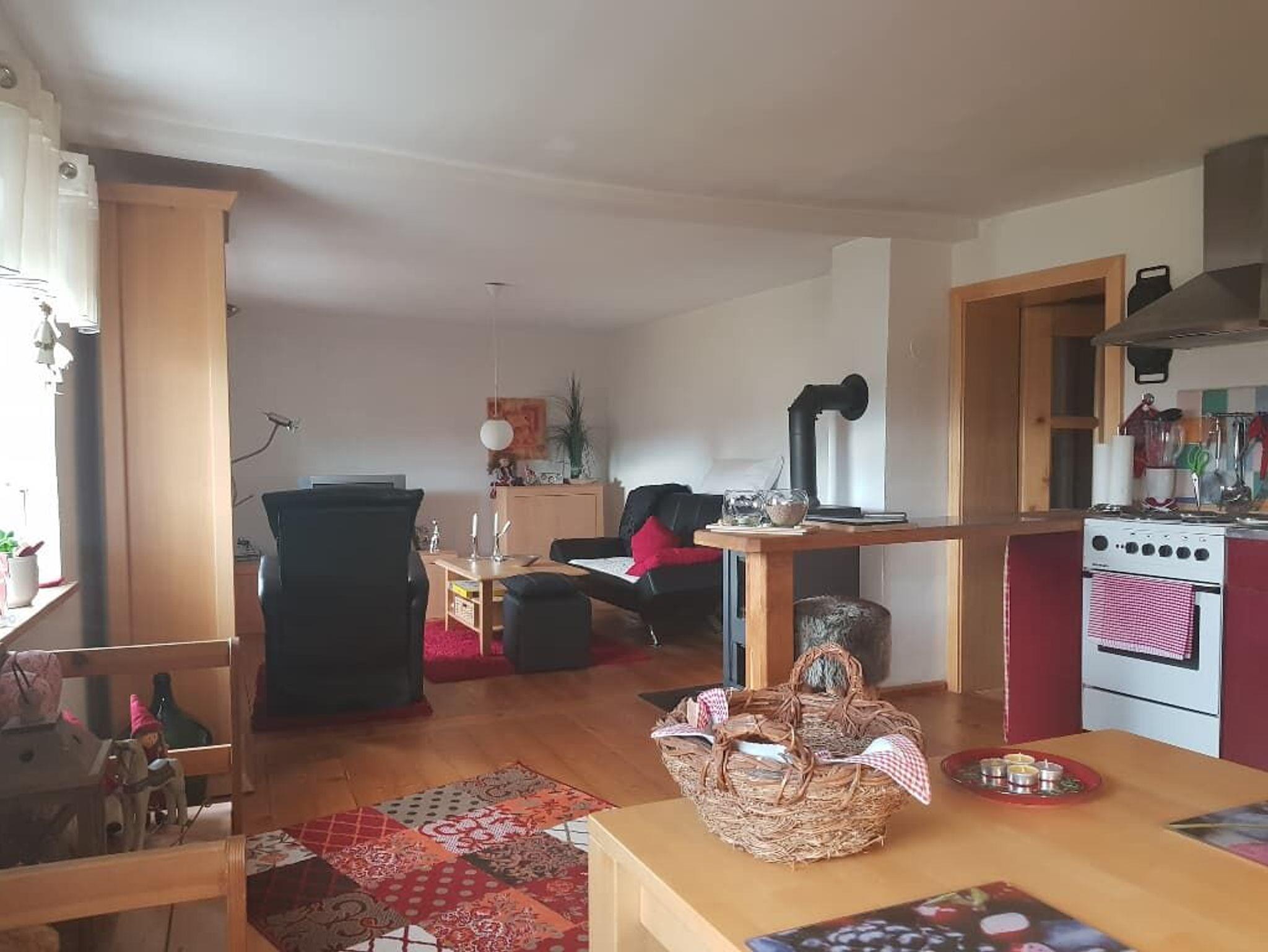Ferienwohnung (100 qm) für 1 bis 3 Personen: Nichtraucher-Ferienwohnung im 1. Stock (nicht barrierefrei), Flur mit Garderobe, zwei Schlafzimmer (1 Doppelbettzimmer und 1 Einzelbettzimmer), große Wohnküche mit Küchenzeile (Geschirrspülmaschine, Elektroherd mit Backofen, Kühlschrank mit Gefrierschrank, Kaffeemaschine, Wasserkocher, Mikrowelle, Toaster, Eierkocher), Kaminofen im angrenzenden, offenem Wohnzimmer mit Couchgarnitur und Sat-TV, Badezimmer mit Badewanne, Dusche, WC, Waschbecken, Fön und Kosmetikspiegel. Bettwäsche und Handtücher werden gestellt - Duschtücher und Hausschuhe bitte selbst mitbringen.