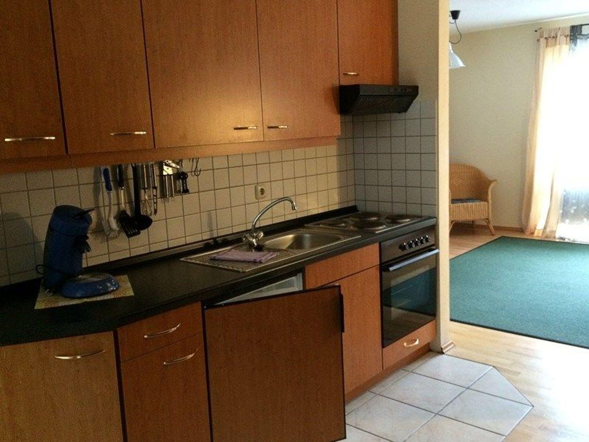 und Fön. Im Wohnraum befindet sich eine ausgestattete Küche sowie ein