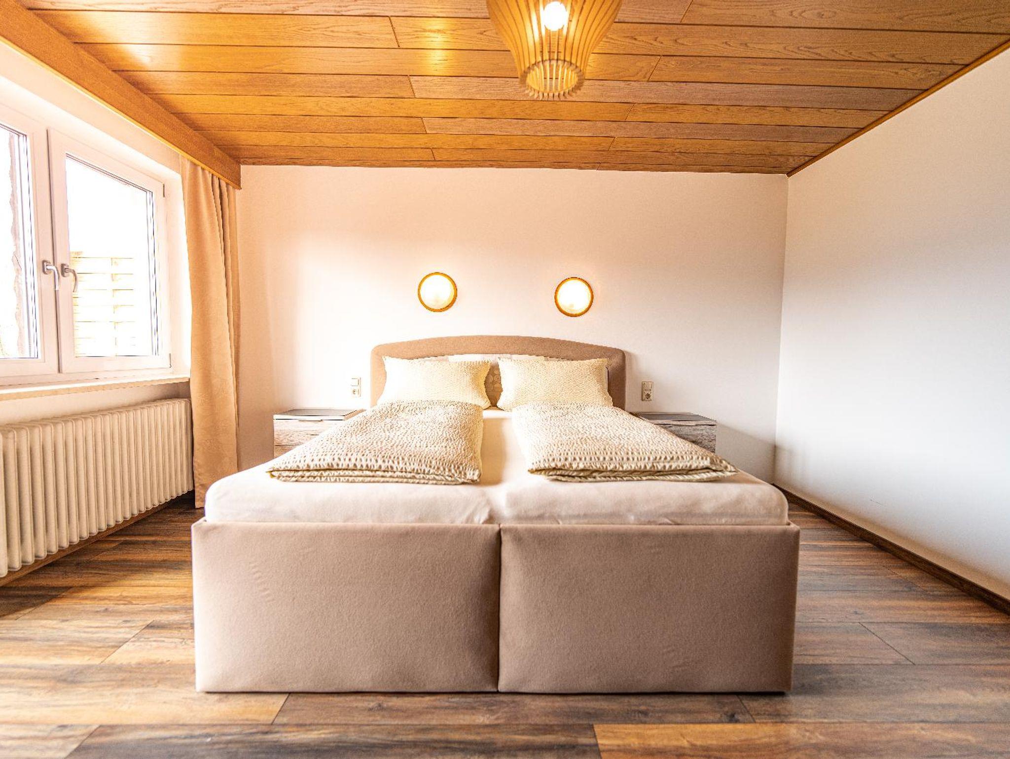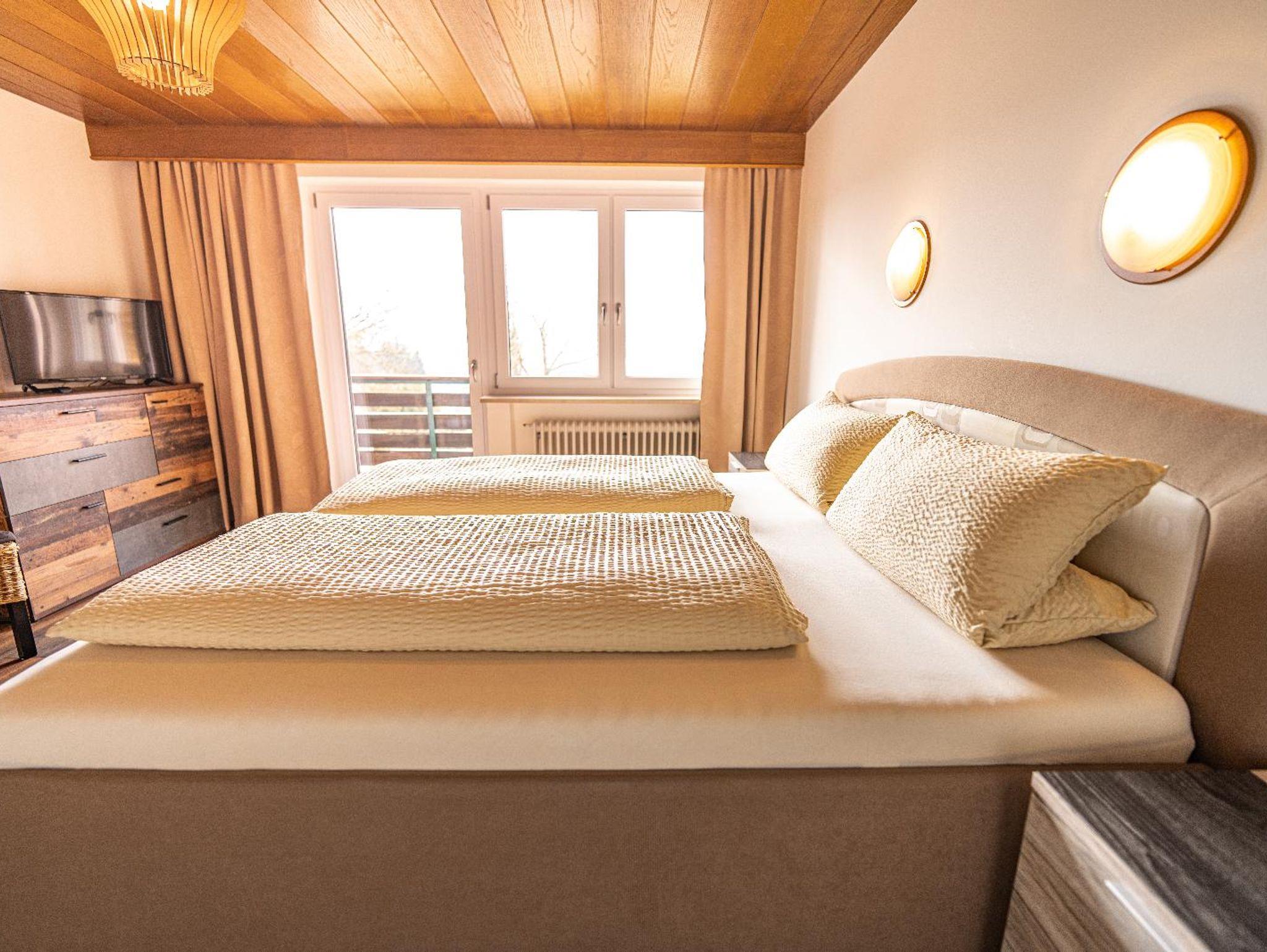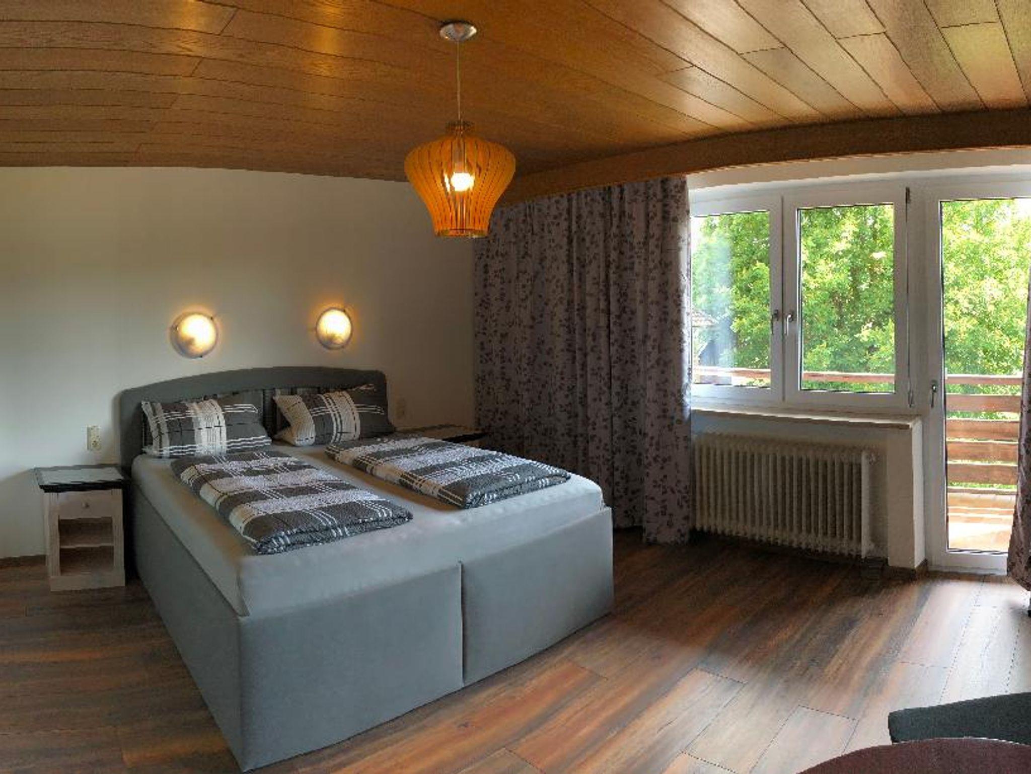Lichtdurchflutetes Doppelzimmer mit Holzboden und gemütlichen Komfort Boxspringbett (180 cm x 200 cm). Westbalkon mit Blick auf die schönen bayrischen Berge. Helles Badezimmer mit begehbarer Dusche und WC.