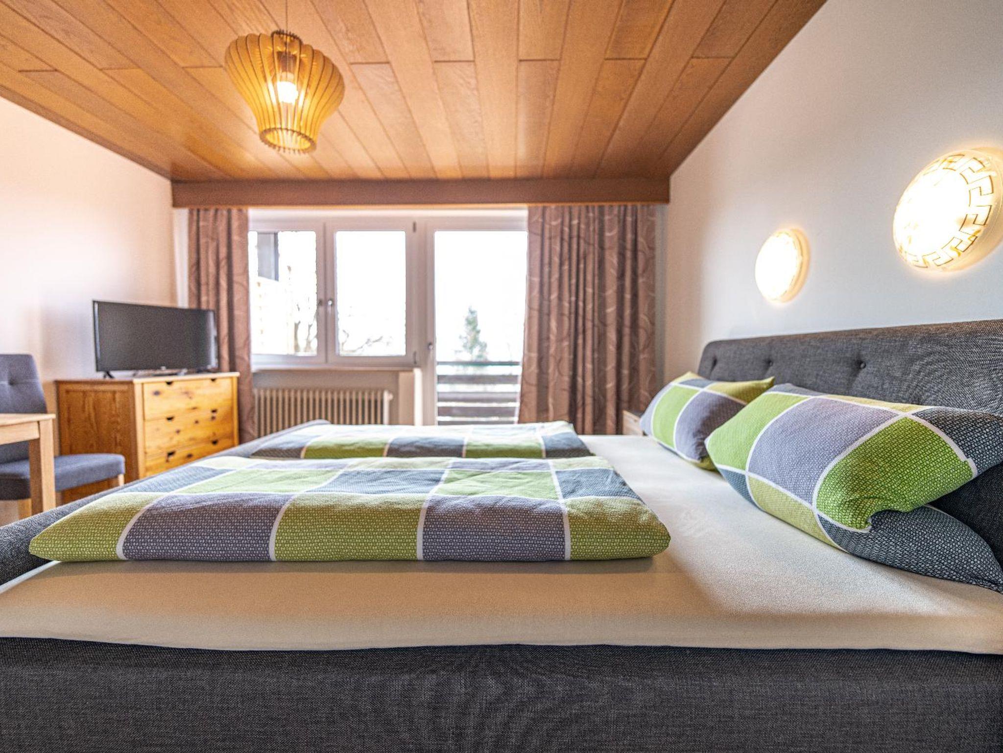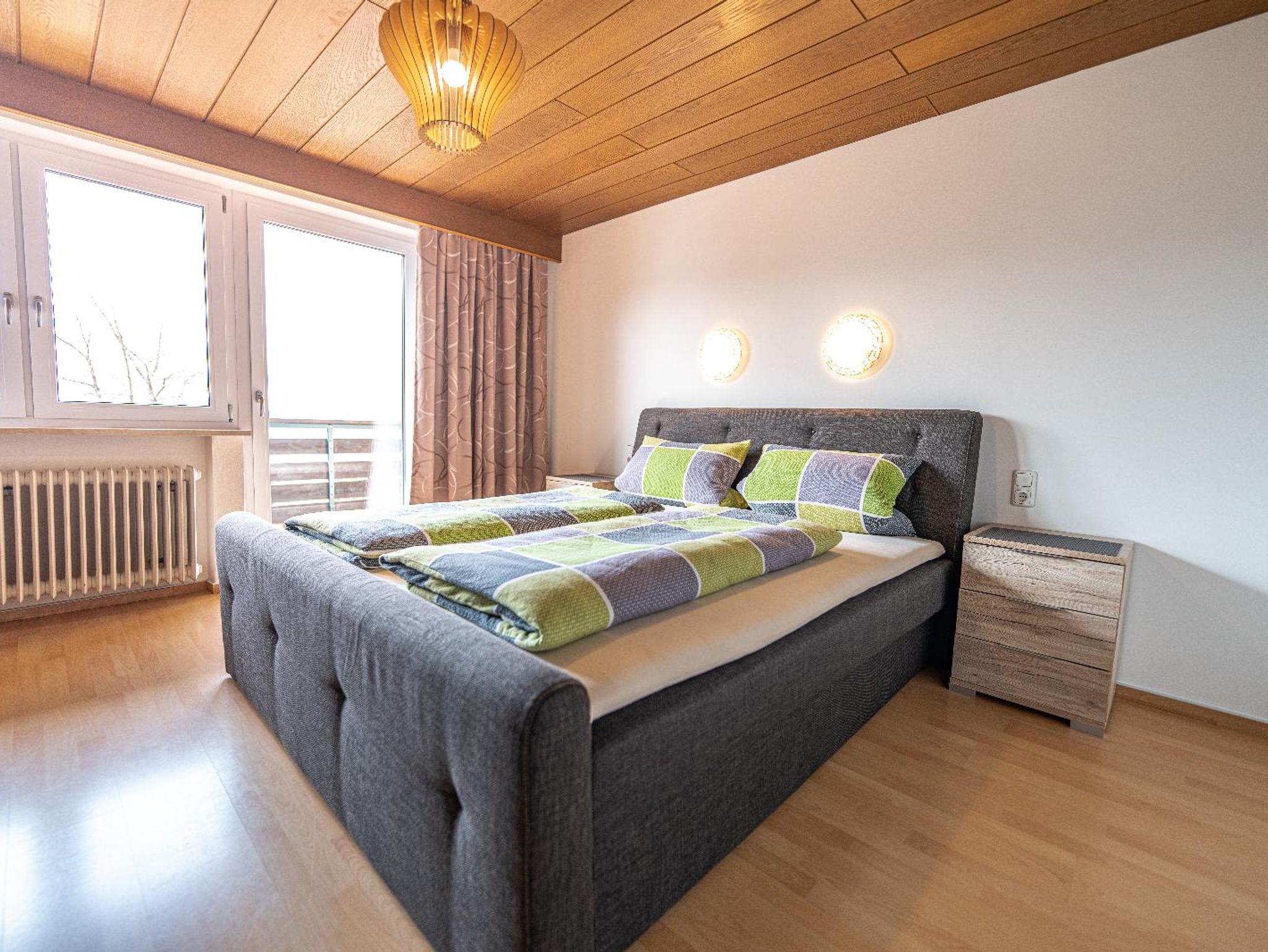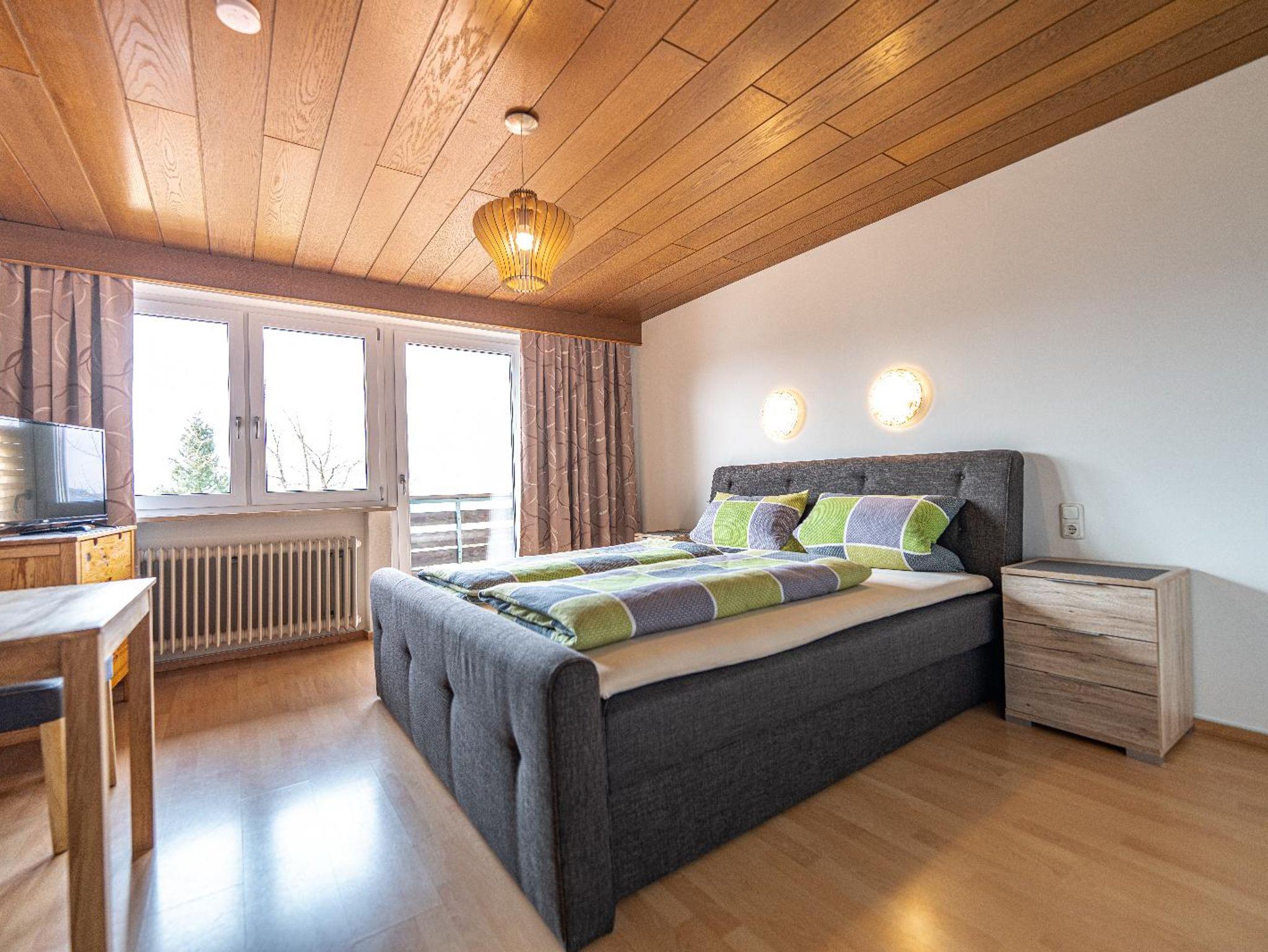 Lichtdurchflutetes Doppelzimmer mit Holzboden und gemütlichen Komfort Boxspringbett (180 cm x 200 cm). Westbalkon mit Blick auf die schönen bayrischen Berge. Helles Badezimmer mit begehbarer Dusche und WC.
