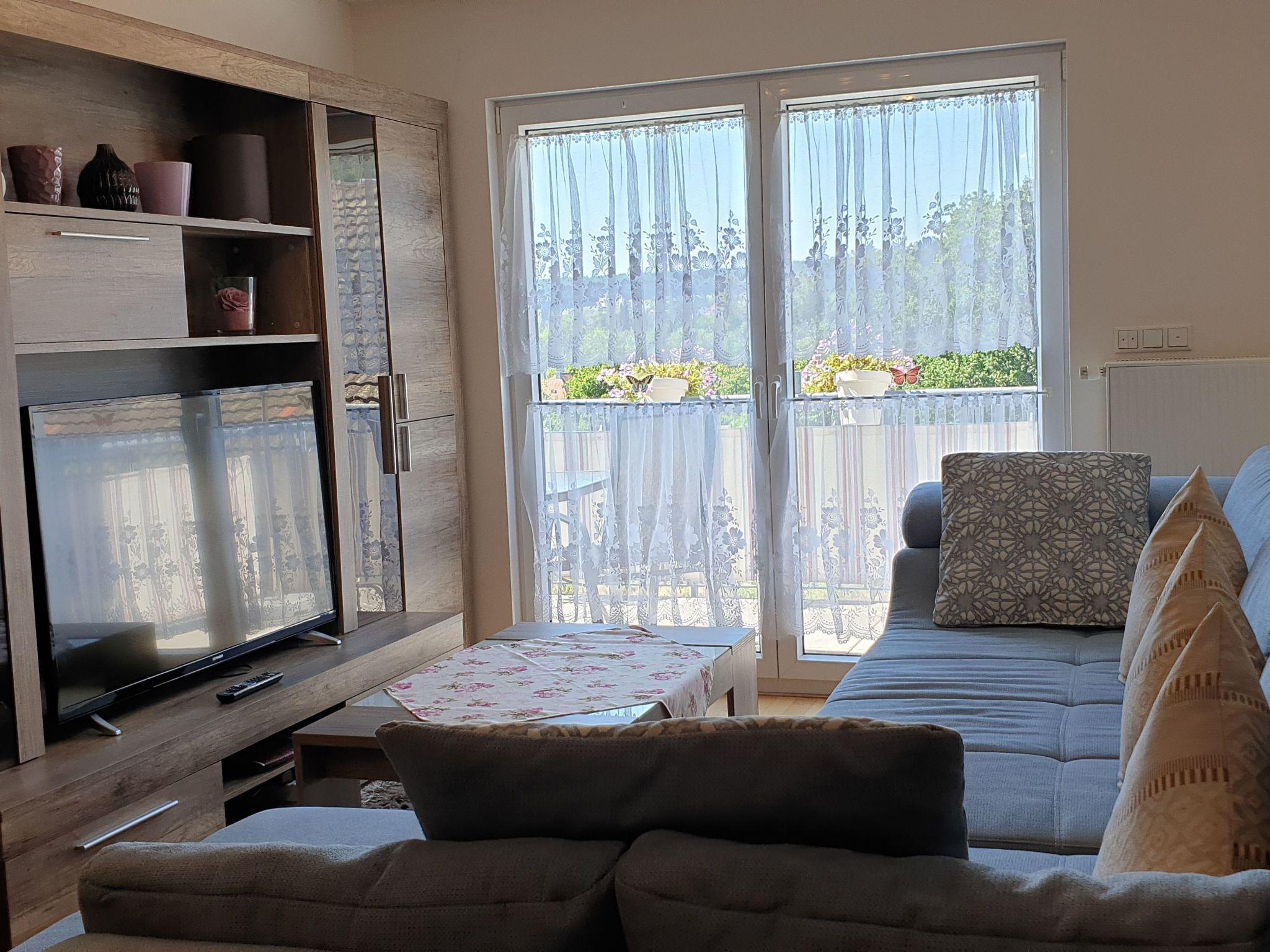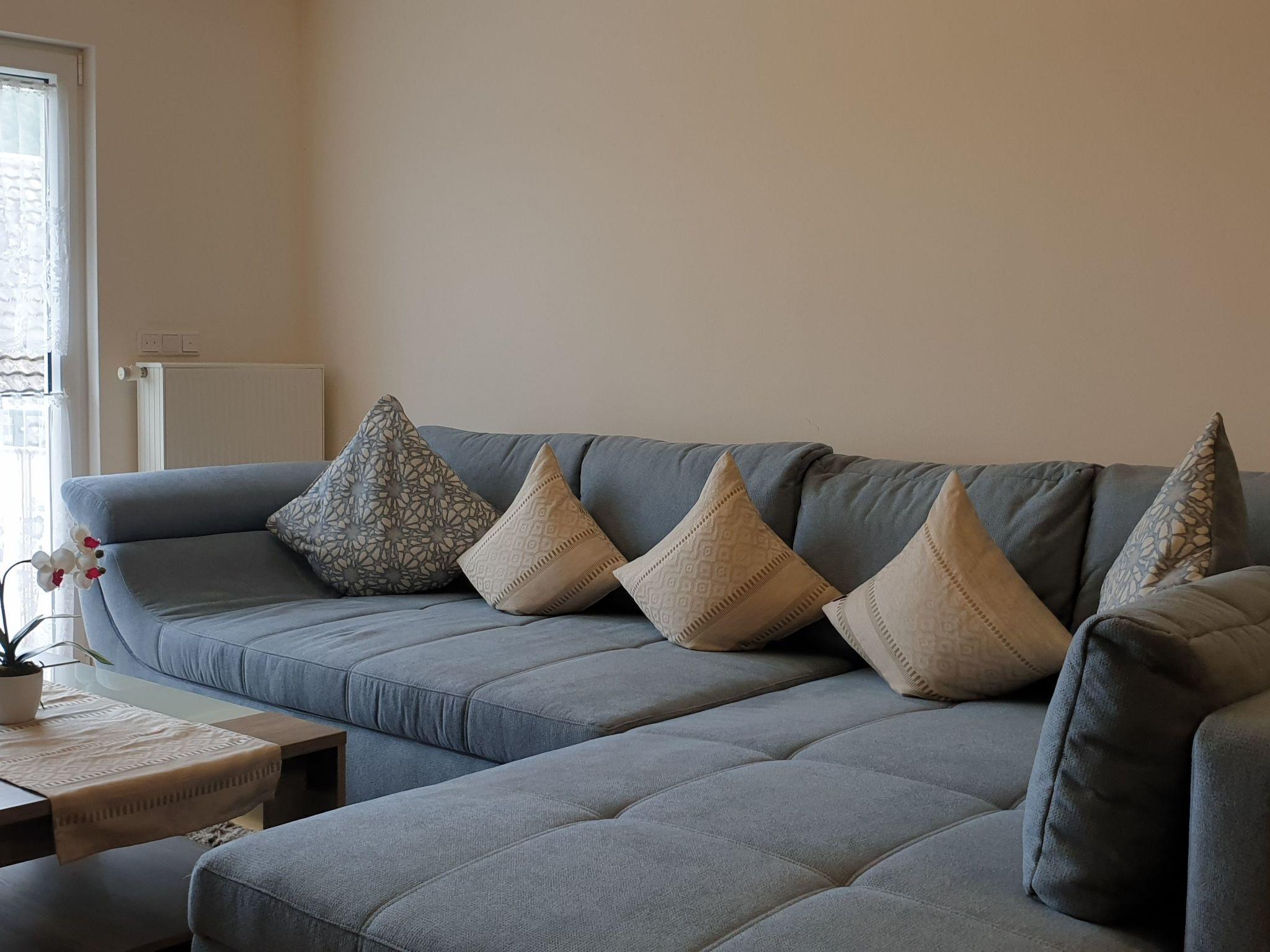 Inside, our 71 m² apartment is thoughtfully furnished to ensure your stay is as comfortable as possible. Suitable for up to three guests or a family with two children, the living quarters comprise a bedroom with a cozy double bed and a mirrored wardrobe closet for all your storage needs. Additional sleeping arrangements can be made with a sofa bed and foldable bed in the welcoming living room. The living space is paired with a modern dining area, making it ideal for meals and family time. Our separate, fully-equipped kitchen comes with a stove, oven, refrigerator, coffee machine, microwave, and dishwasher, catering to all your culinary needs. The bathroom adds to the comfort with its shower, raised toilet, and the convenience of a washing machine and dryer.