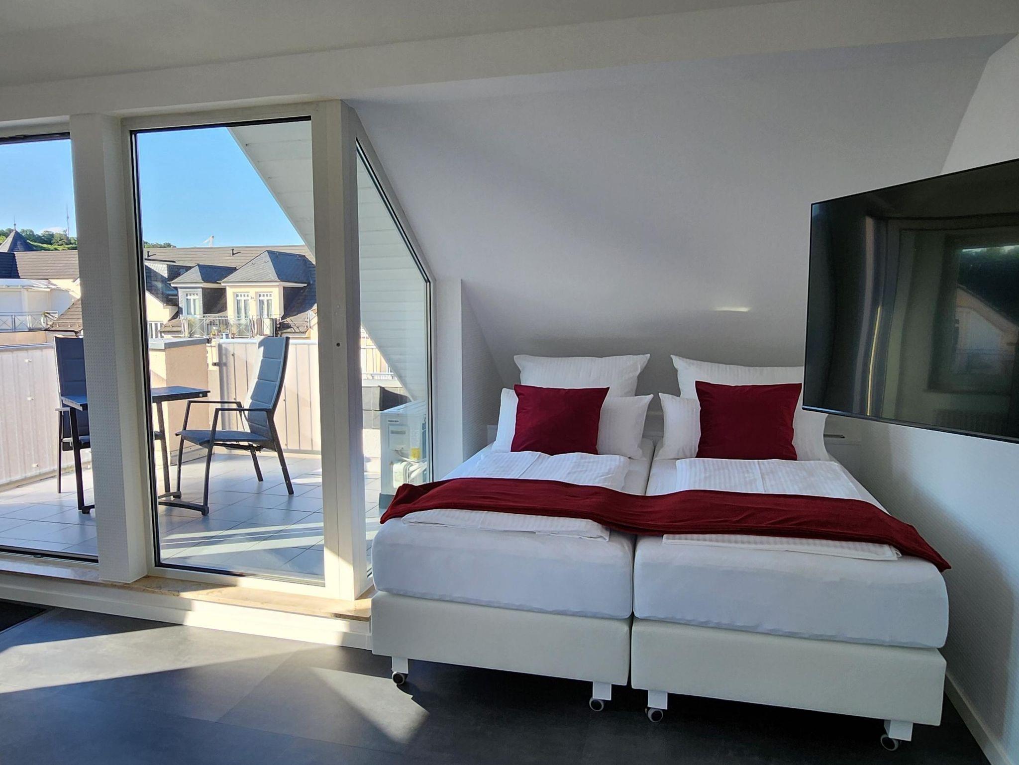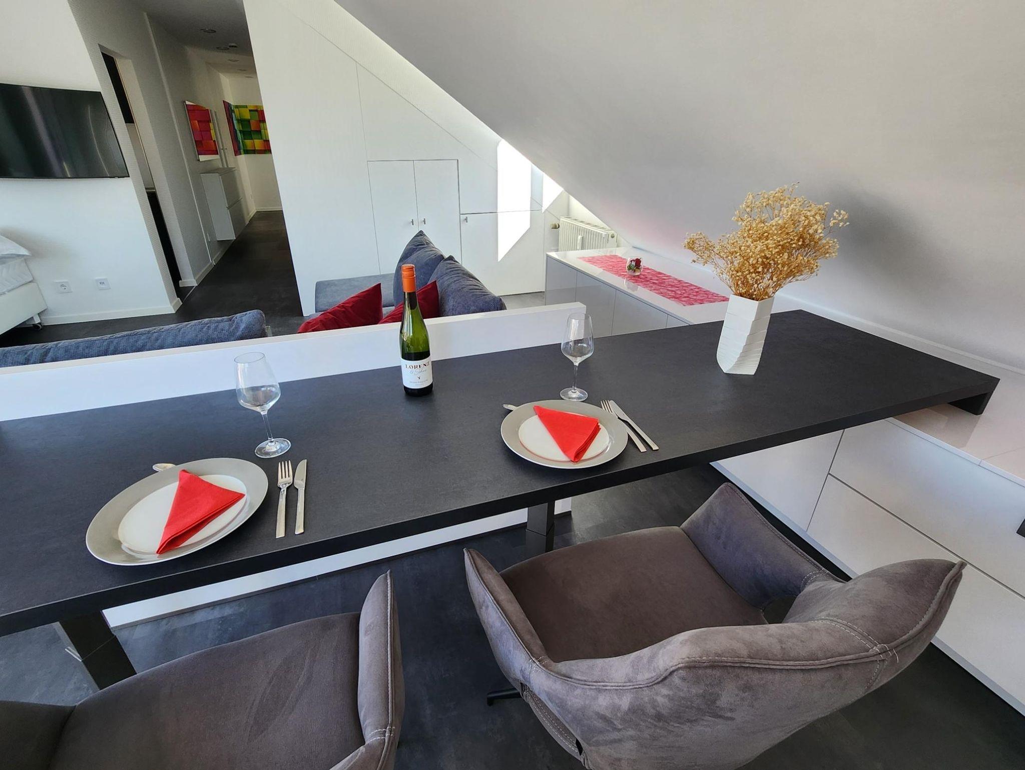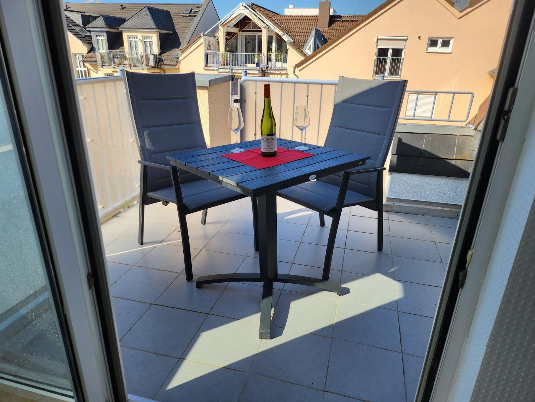Genießen Sie außergewöhnliche Urlaubstage in unserer komplett renovierten und klimatisierten 5-Sterne-Ferienwohnung im Kurviertel. Die freundliche, helle Einrichtung strahlt mit der Sonne um die Wette. Unser topmodernes, kompaktes Ein-Raum-Apartment mit separater Küche ist bestens geeignet für alle, die minimalistisch-praktischen Komfort und klare Linien bevorzugen. Die Wohnung liegt in der vierten Etage, hat einen separaten Eingang, ein Tageslichtbad mit Dusche und WC und eine geräumige Dachterrasse mit tollem Blick über die Dächer von Bad Kreuznach. Hier sind Sie richtig, wenn Sie Ruhe und Entspannung suchen.