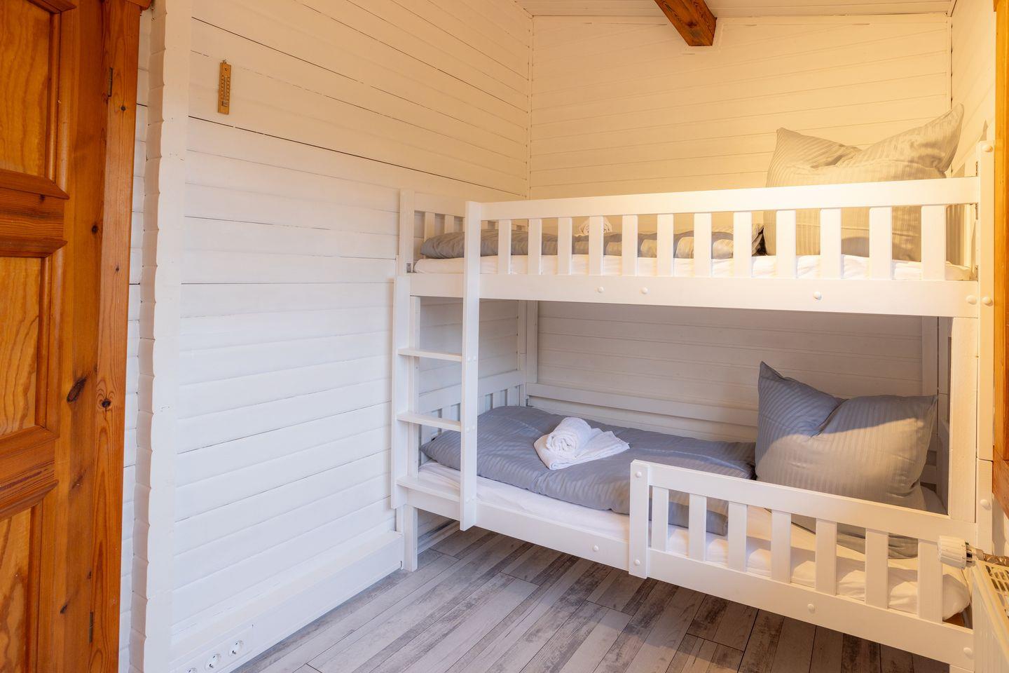 Die Casa Foresta ist ein uriges Blockhaus mit eigener Sauna, Innen- und Außenkamin. Das Schlafzimmer mit Doppelbett und das Kinderzimmer mit Etagenbett in Verbindung mit dem großen umzäunten Garten machen das Haus zum idealen Ort für Familien mit Kindern.