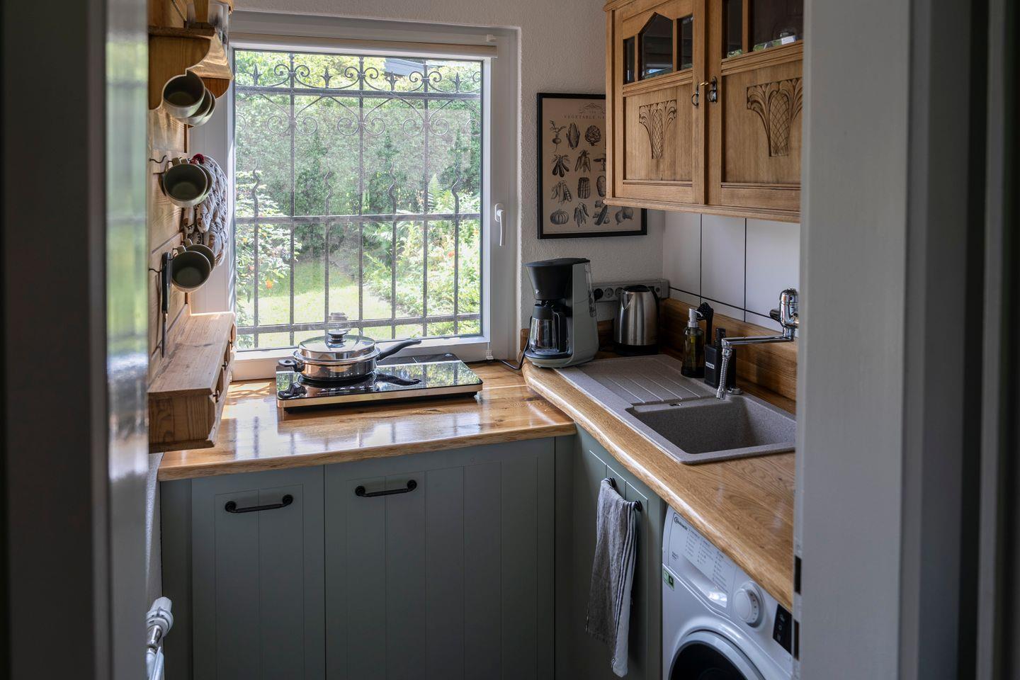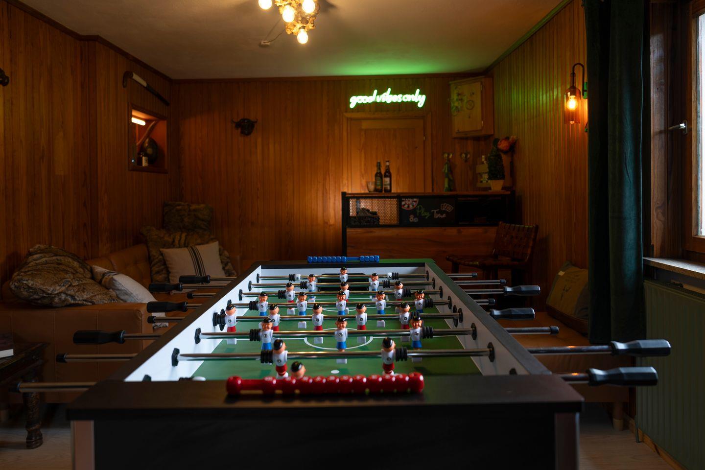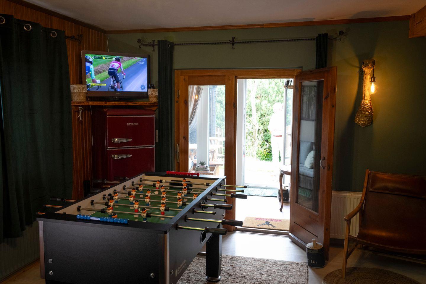 Alle drei Schlafzimmer befinden sich im unteren Bereich des Hauses. Du erreichst sie über eine Außentreppe!!! und einen separaten Eingang. Dort findest Du ein Schlafzimmer mit Doppelbett, eines mit zwei Einzelbetten sowie eines mit Etagenbett und ein weiteres Duschbad. Zusätzlich gibt es eine kleine Küche für den ersten Morgenkaffee oder gesellige Abendrunden; hier befindet sich auch der Waschtrockner. Ein 2. Wohnzimmer mit Kicker, Bar, Sofa, TV, Musikbox und vielen Gesellschaftsspielen läd zum Chillen oder gemeinsamen Spaß für Klein und Groß ein. Von dort geht es in den Wintergarten zum Lesen mit einer Tasse Tee.