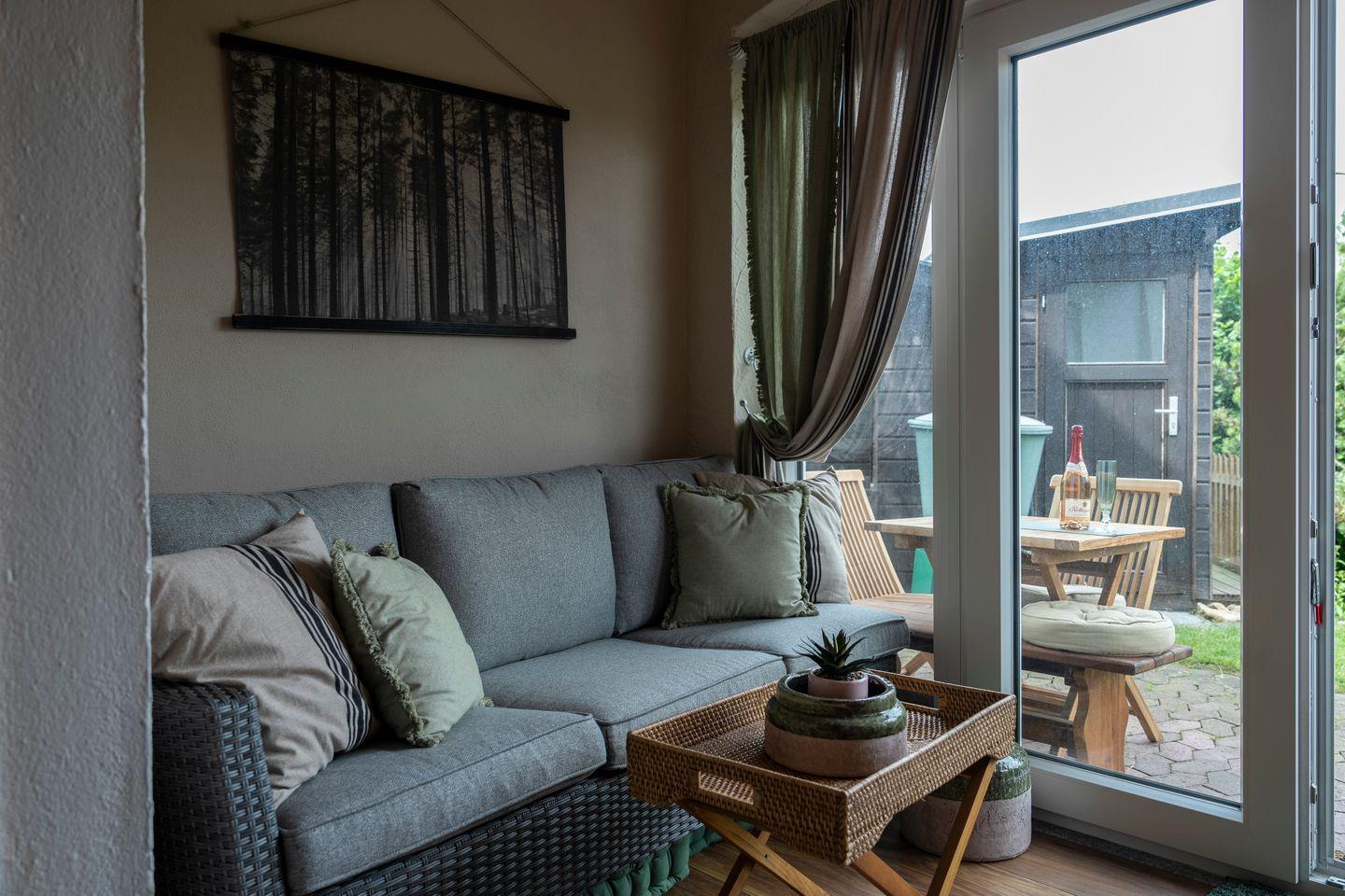 Draußen erwarten Dich ein eingezäunter Garten, eine Terrasse mit Sitzgruppe und Markise, ein Carport und eine abschließbare Gartenhütte für Deine Fahrräder.