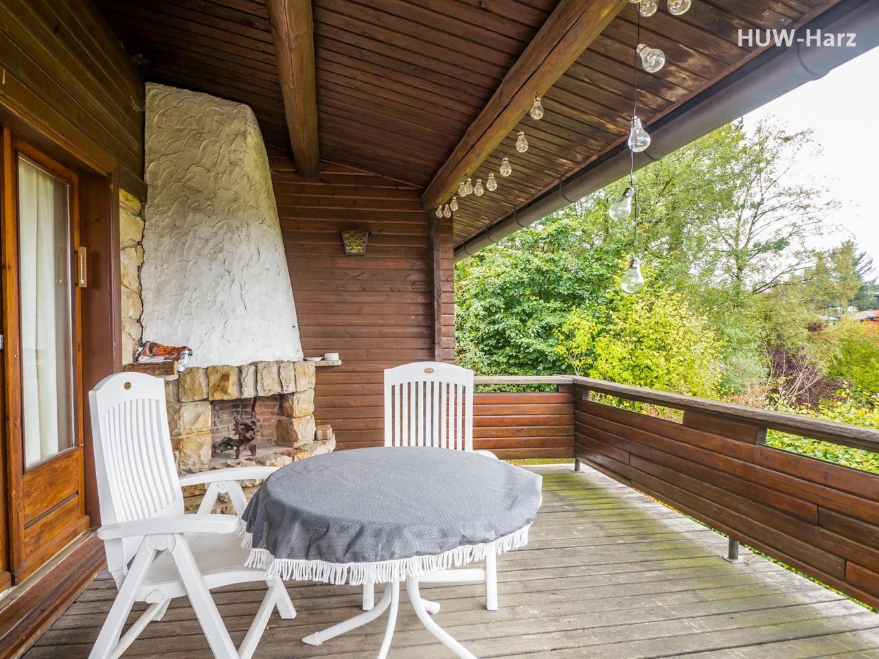Es gibt einen schönen Garten mit Gartenmöbeln, die für Sie bereit stehen. Auf der großen überdachten Terrasse mit Blick auf die Burgruine Scharzfels gibt es einen Esstisch mit Bank. Weiterhin gibt es einen großen, überdachten Balkon mit Außenkamin für herrliche Abende am Kaminfeuer.