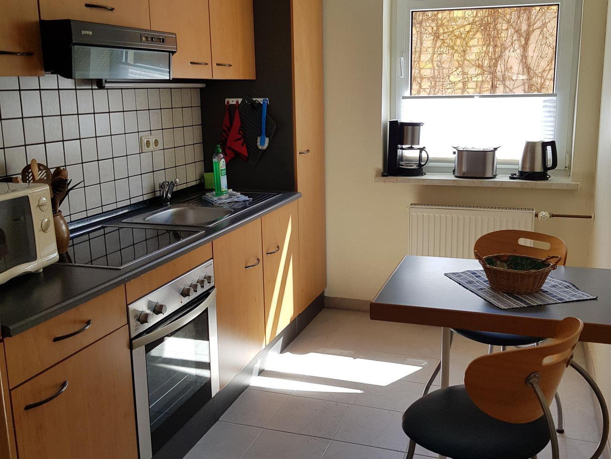 Küche voll ausgestattet, E-Geräte: Kühlschrank, Herd, Microwelle, Kaffeemaschine, Wasserkocher, Toaster