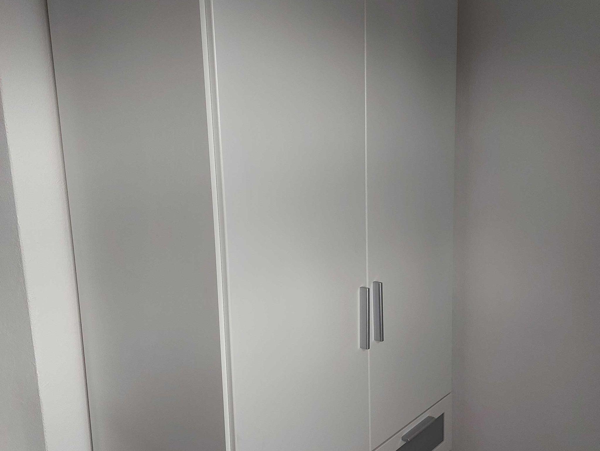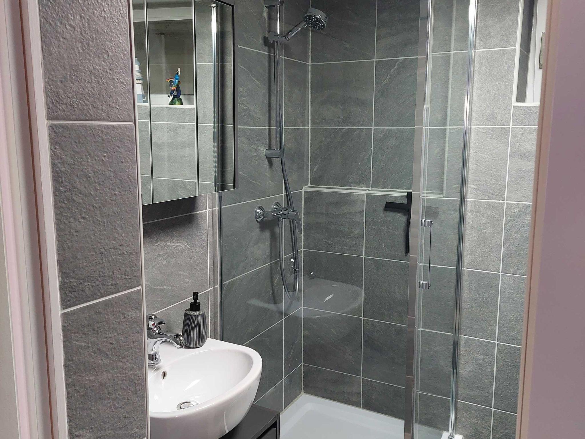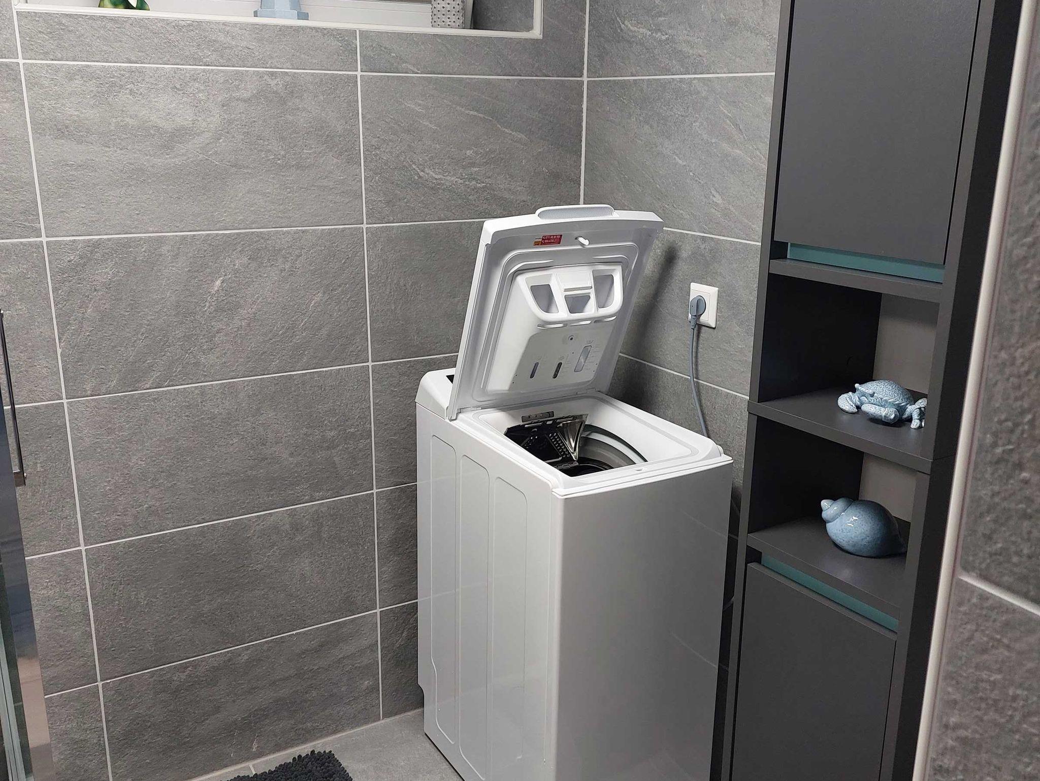 1 Küche mit Mikrowelle mit Back- und Grillfunktion, Induktionskochfeld, Filterkaffeemaschine (Filter vorhanden), Wasserkocher, Toaster, Kühlschrank mit Gefrierfach, Küchenuntensilien für 4 Personen (Gläser, Tassen, Teller, Besteck, Töpfe, Pfanne usw.)