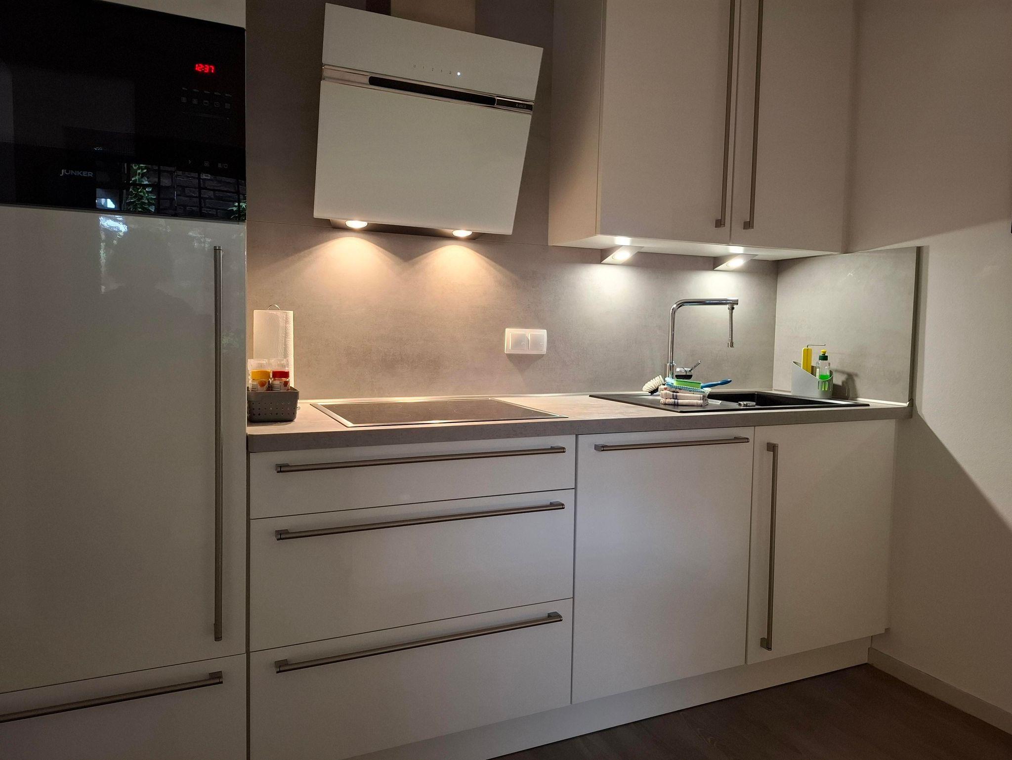 Der helle und modern eingerichtete Wohn-Schlafraum ist mit einem Doppelbett mit Taschenfederkernmatratzen, Esstisch, bequemem Sofa mit Relaxfunktion, SAT-LED-TV, Radio und WLAN ausgestattet. Die hochwertige Einbauküche verfügt über Geschirrspüler, Ceranfeld, Abzugshaube, Mikrowelle, Heißluftfritteuse, Kaffeepadmaschine, kleine Filterkaffeemaschine, Wasserkocher, Toaster sowie sämtliches Kochzubehör. Das geräumige Badezimmer mit ebenerdiger Dusche ist mit Fliesen in Natursteinoptik, Dusch-Thermostat, Handtuchtrockner und Föhn ausgestattet.