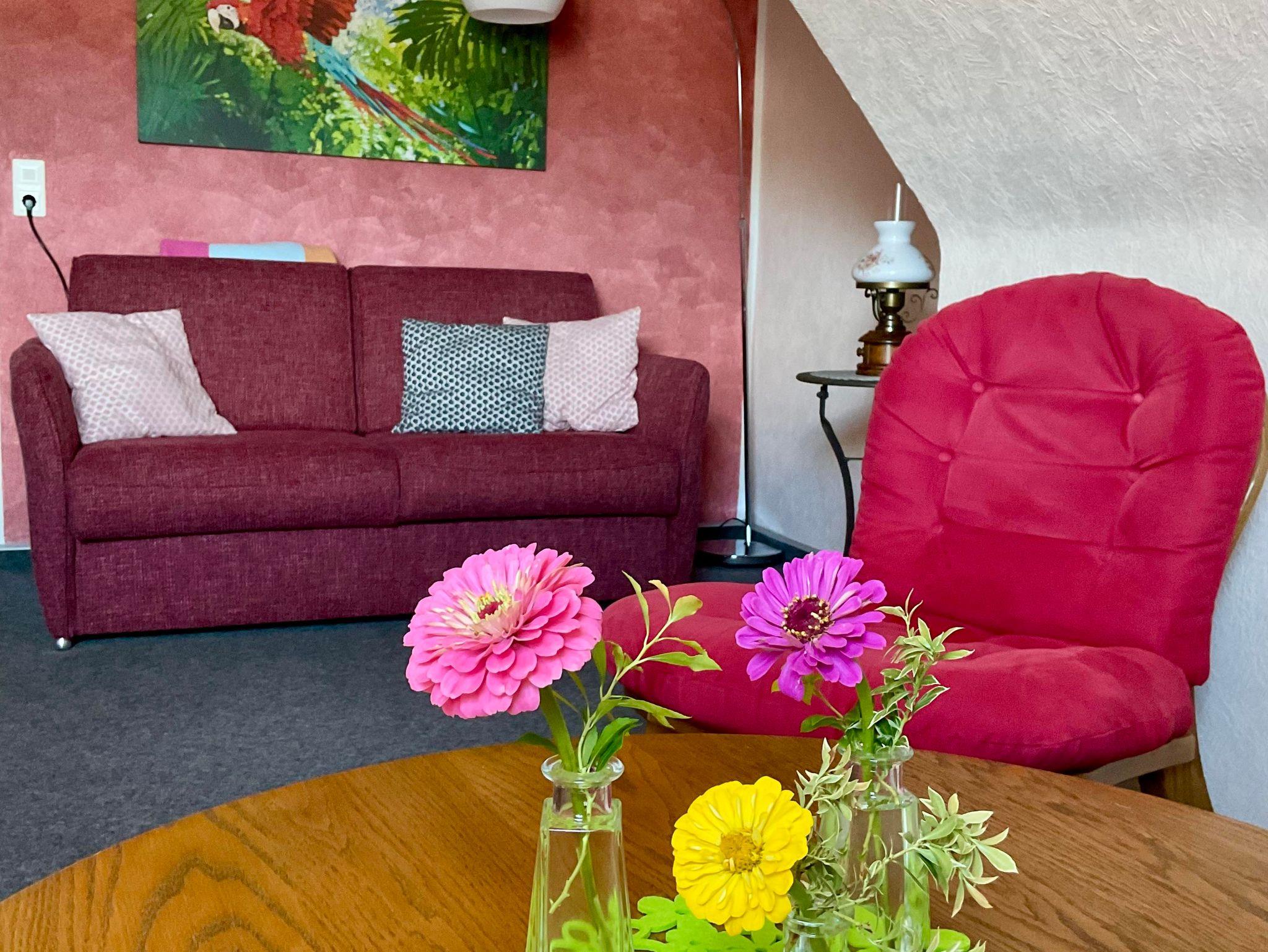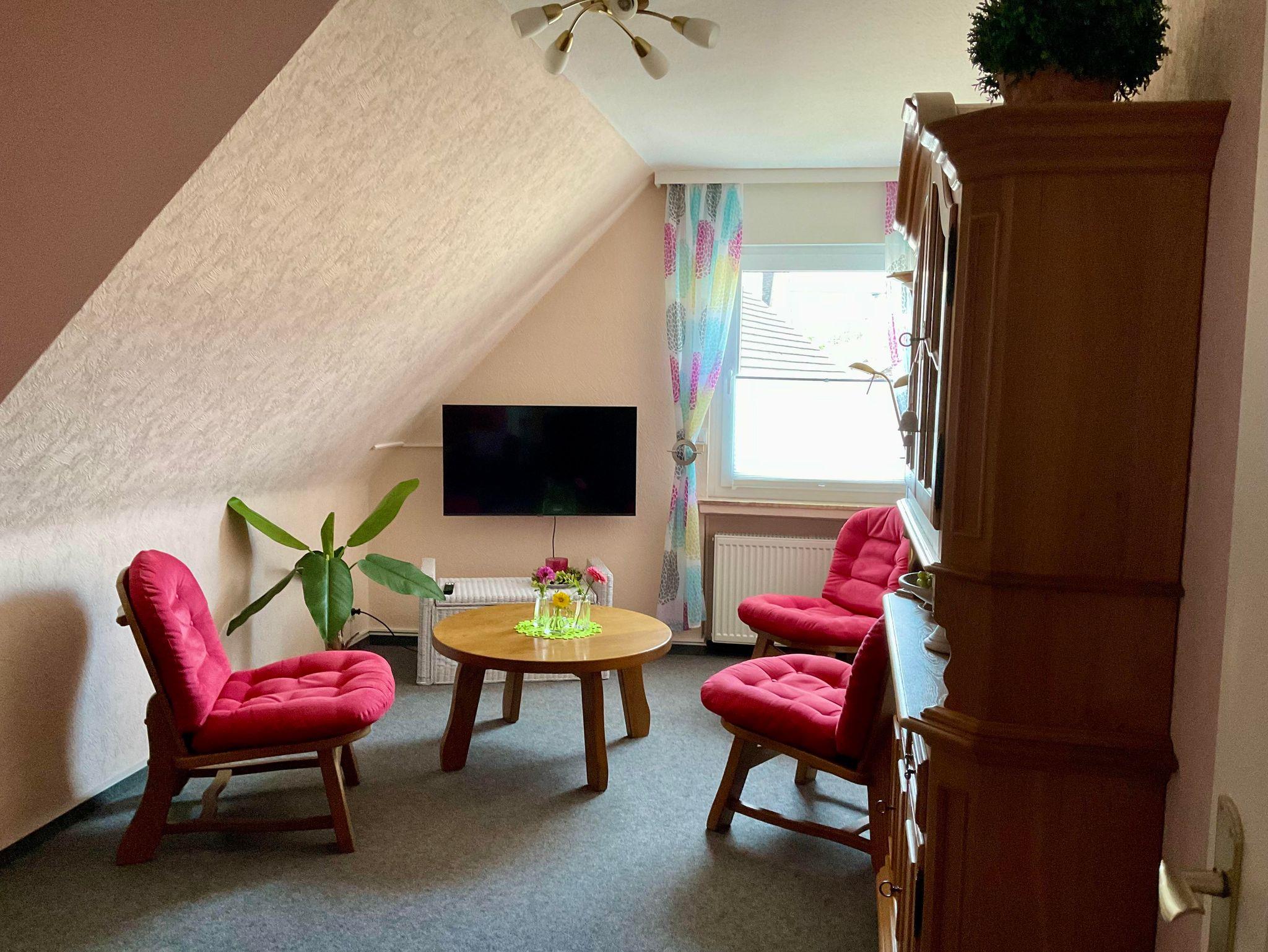 Im gemütlichen Wohnzimmer befindet sich eine hochwertige Schlaf-Couch ( Aufbettung für 3. Person möglich), Tisch mit drei Sesseln und Leselampe, Schrank, TV Flachbildschirm.