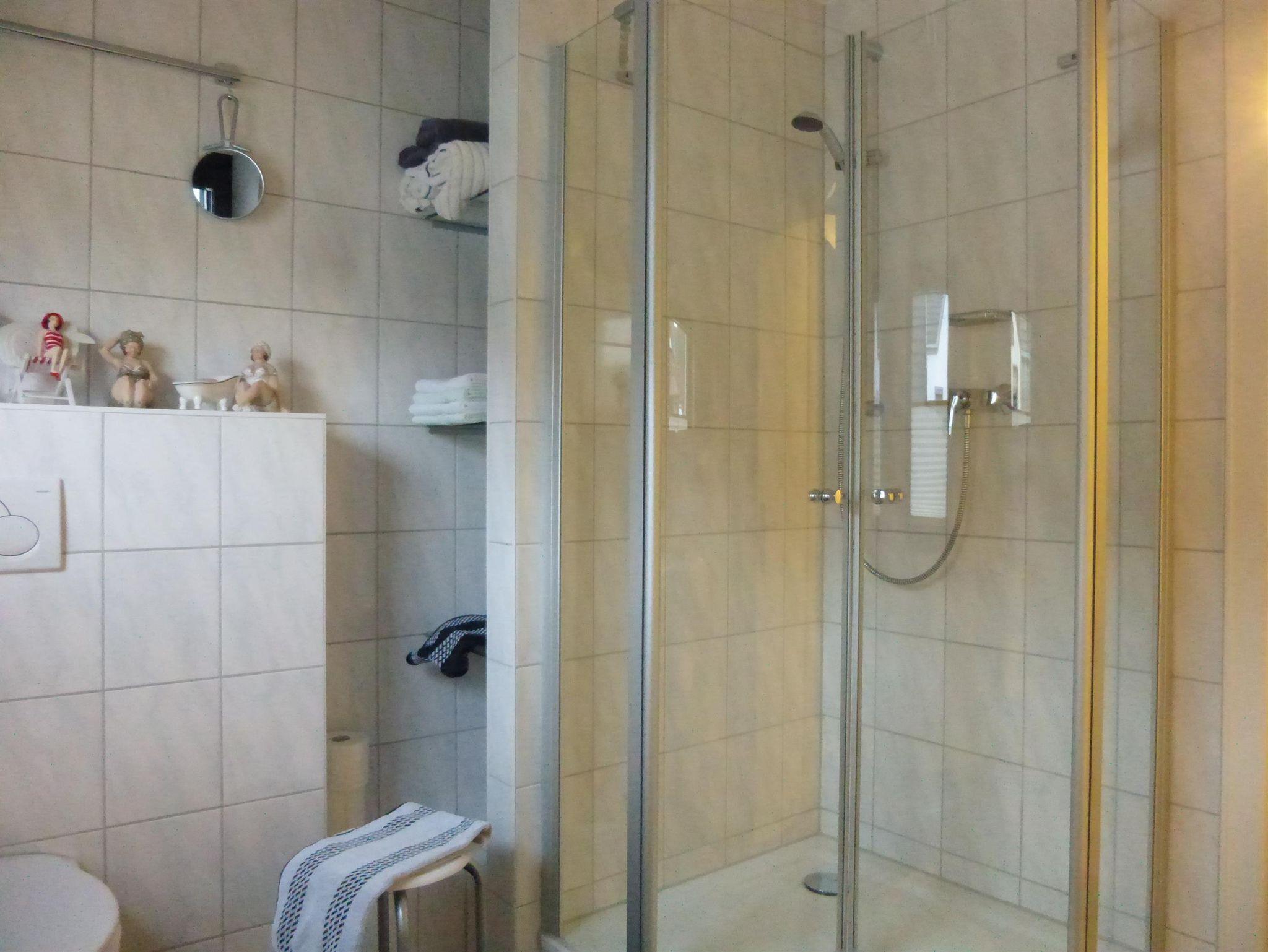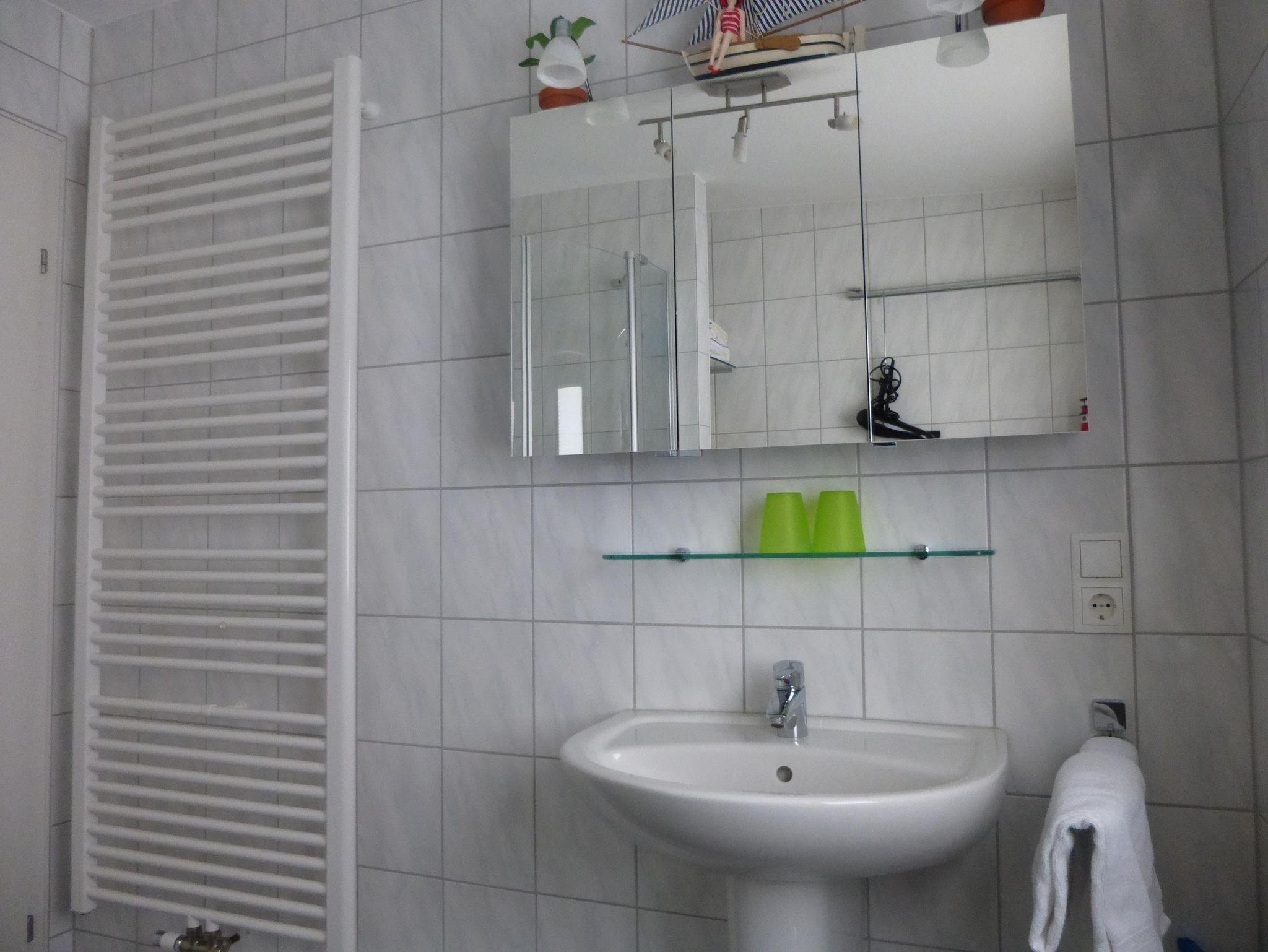 Das Tageslicht Bad ist hell gefliest, verfügt über Dusche, WC, Waschbecken , Spiegelschrank, Fön, diverse Ablagemöglichkeiten, Heizung als Handtuchtrockner.
