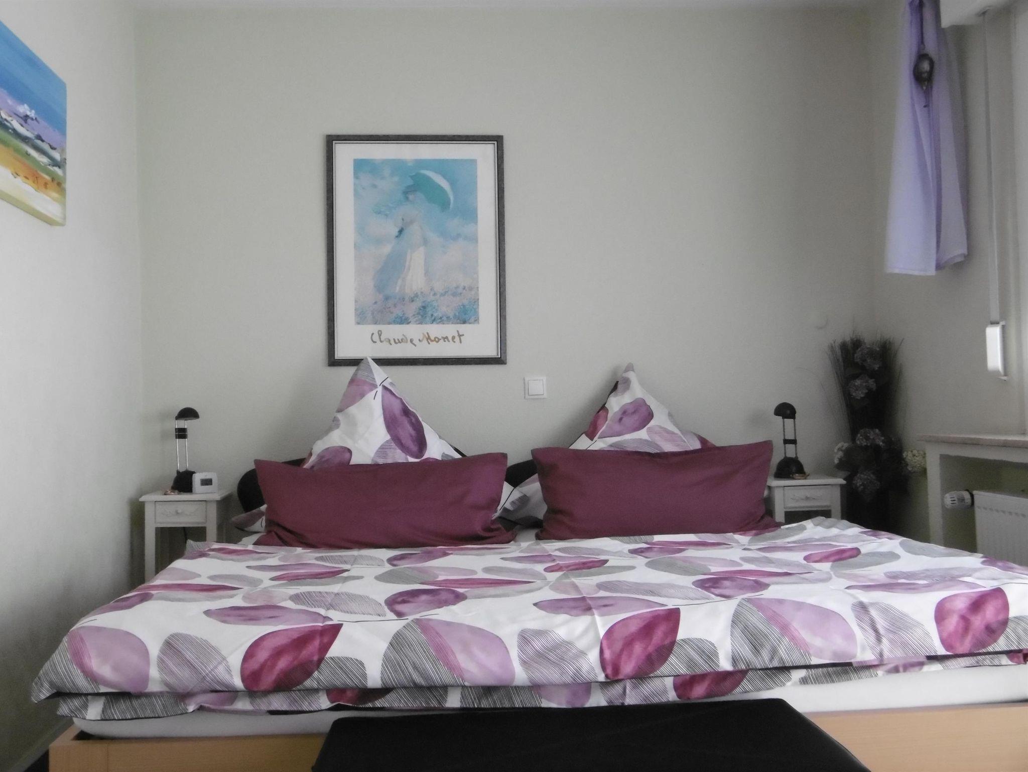 Unsere helle 65 m² große Ferienwohnung in der 2.Etage erreichen Sie über eine bequeme Treppe. In der Diele befindet sich ein Ganzkörperspiegel, Gardarobe und Schuhablage. Das Schlafzimmer ist mit einem Kleiderschrank, Doppelbett (180x200cm), mit zwei Lattenrosten und getrennten Matratzen ( Bettende offen )und Sessel ausgestattet. Von dort haben Sie Zugang zu einem kleinen Balkon, Süd-Seite, mit Sonnenschirm und Bestuhlung.