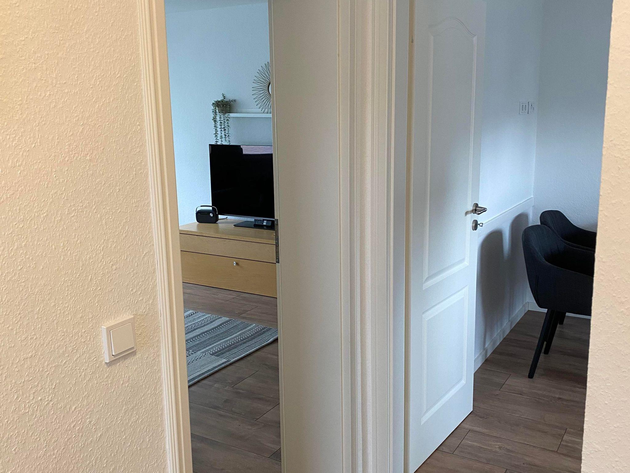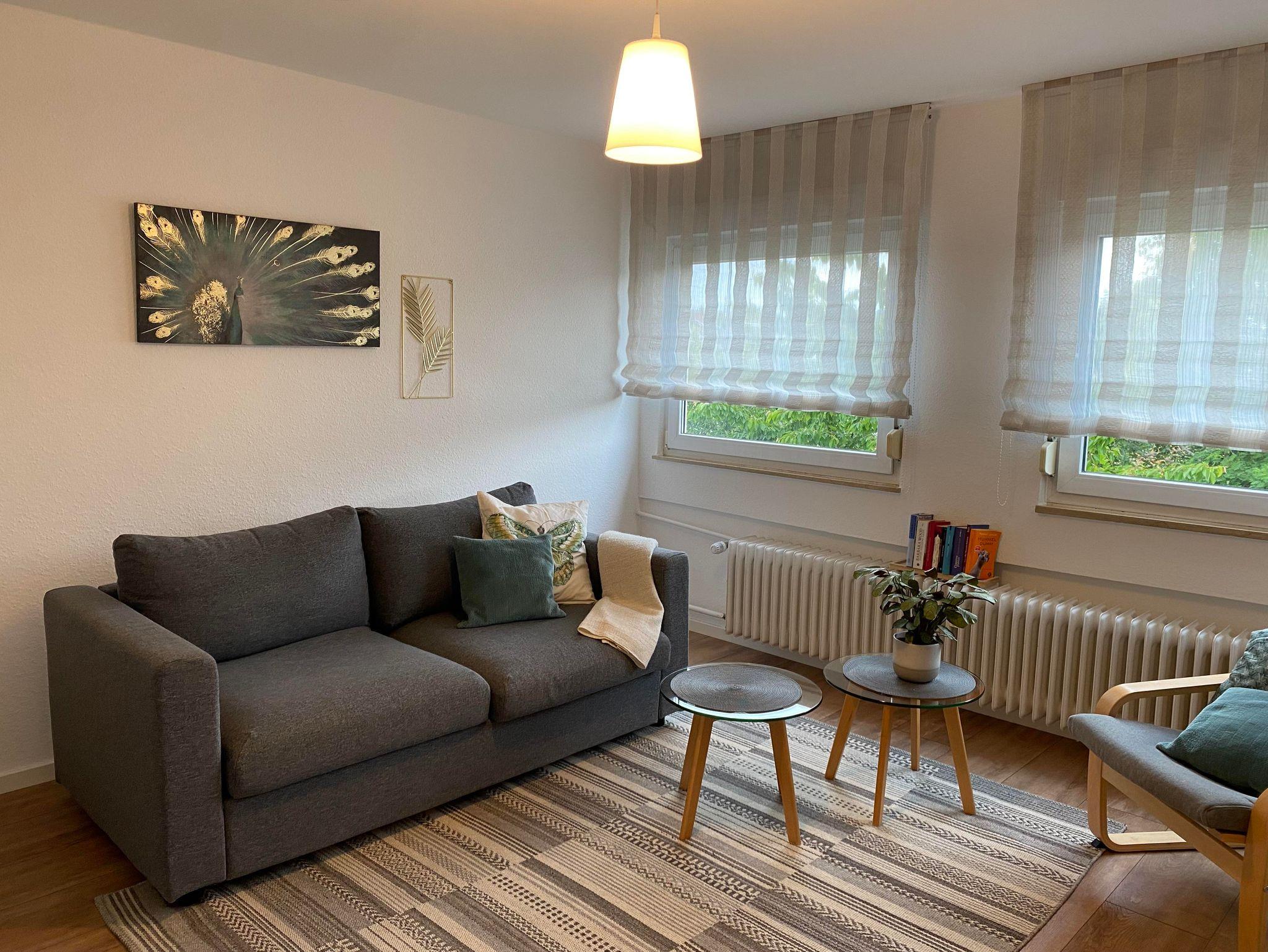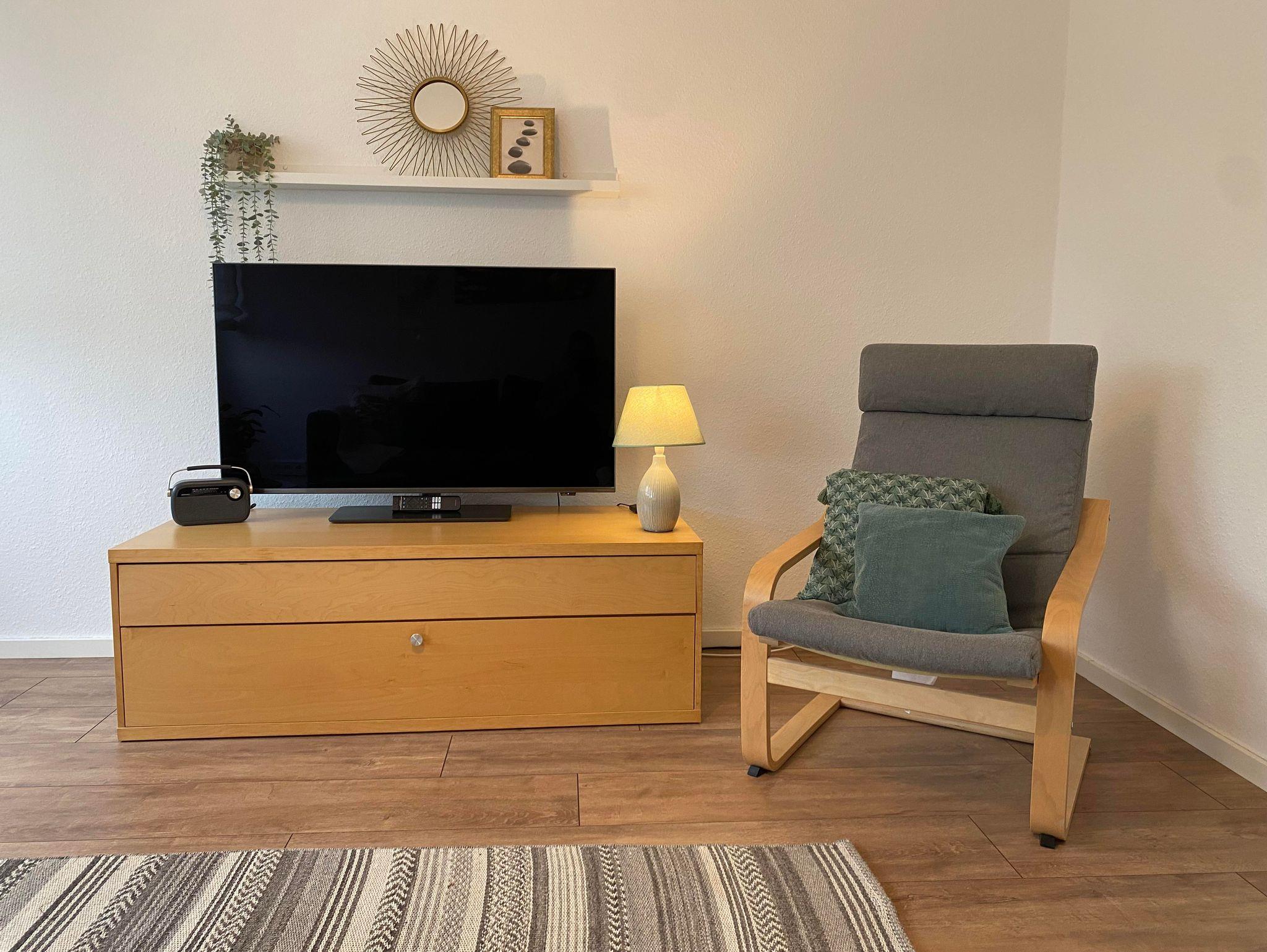 Im Wohnzimmer kann man nach einem langen Tag wunderbar den Tag ausklingen lassen und auf der komfortablen Schlafcouch oder dem dazugehörigen Sessel die Beine baumeln lassen, um gemeinsam die Eindrücke des Tages Revue passieren lassen . Ein Smart TV steht für Ihre eigene Zugänge bereit. Die ausziehbare Schlafcouch bietet darüber hinaus ein bequemes zweites Nachlager für weitere 1-2 Personen. Die Couch ist 1,40m x 2 m und hat eine durchgängige Matraze. Dadurch kann ein seperates Wohn-Schlafzimmer entstehen. Zum Streamen steht kostenlos ein Wlan zur Verfügung. Gerne können Sie auf Nachfrage ein zusätzliches, separates Zimmer buchen, wenn Sie lieber ein weiteres Schlafzimmer möchten statt der Schlafmöglicherkeit auf der Couch. Fragen Sie bitte unser Jokerzimmer gezielt an. Dieses befindet sich auf der 1. Etage als Zusatzraum.