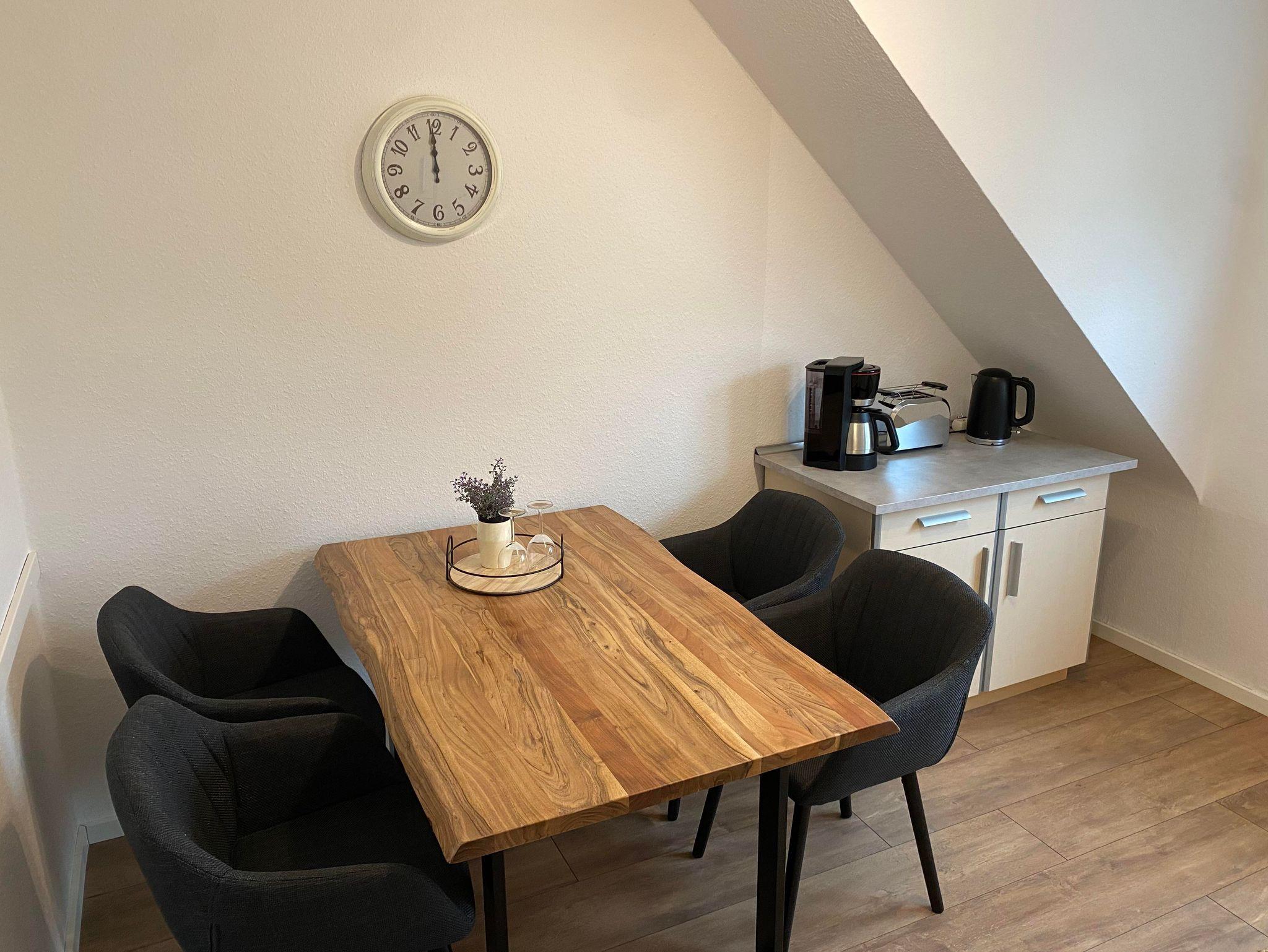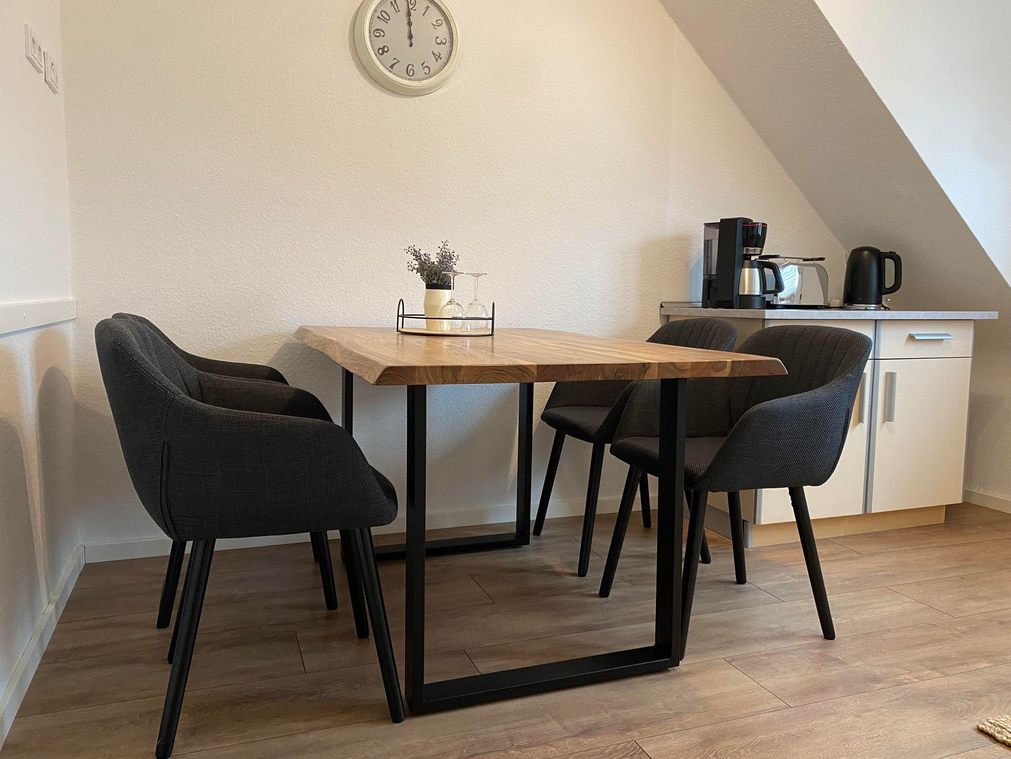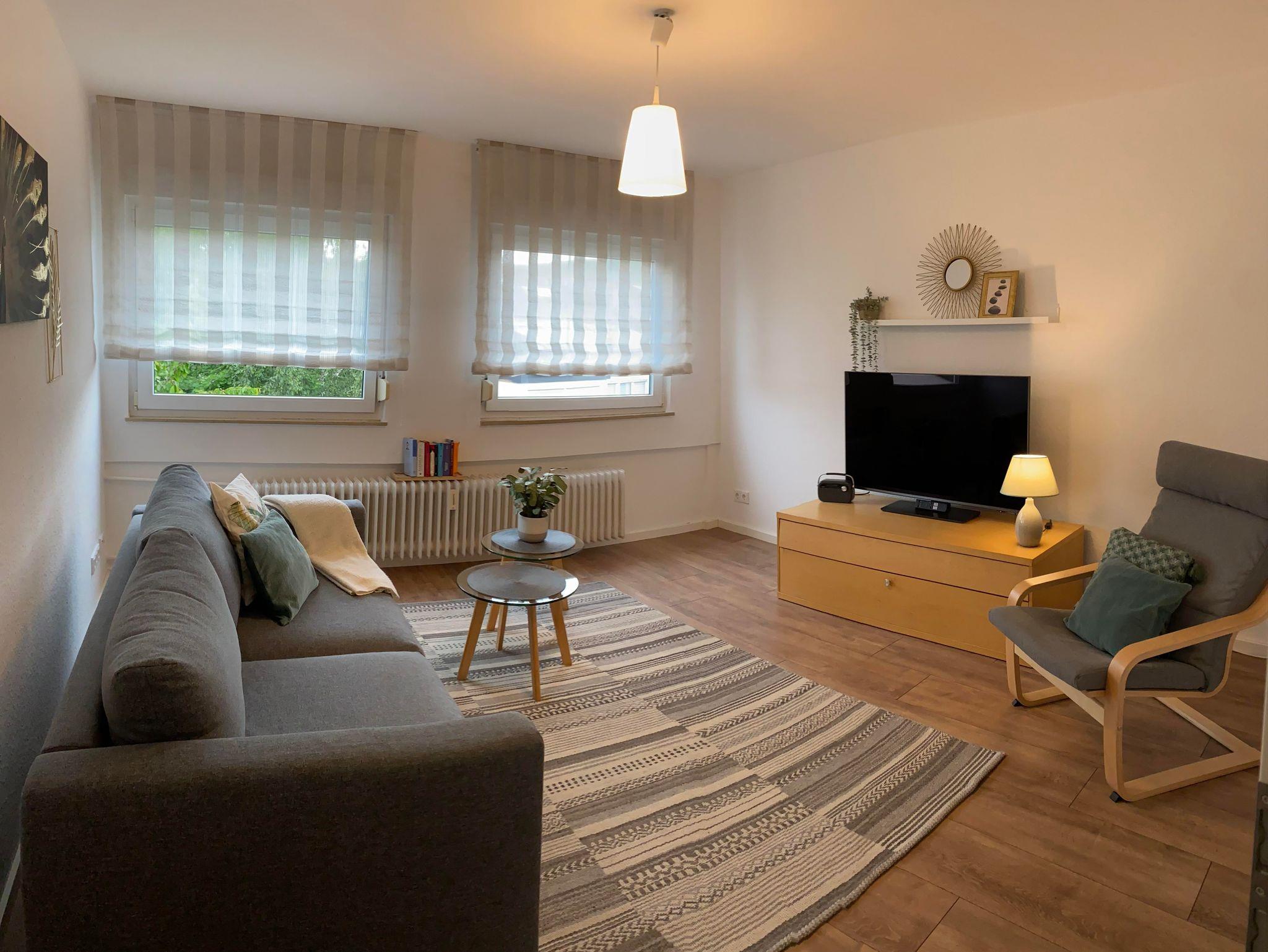 Im Wohnzimmer kann man nach einem langen Tag wunderbar den Tag ausklingen lassen und auf der komfortablen Schlafcouch oder dem dazugehörigen Sessel die Beine baumeln lassen, um gemeinsam die Eindrücke des Tages Revue passieren lassen . Ein Smart TV steht für Ihre eigene Zugänge bereit. Die ausziehbare Schlafcouch bietet darüber hinaus ein bequemes zweites Nachlager für weitere 1-2 Personen. Die Couch ist 1,40m x 2 m und hat eine durchgängige Matraze. Dadurch kann ein seperates Wohn-Schlafzimmer entstehen. Zum Streamen steht kostenlos ein Wlan zur Verfügung. Gerne können Sie auf Nachfrage ein zusätzliches, separates Zimmer buchen, wenn Sie lieber ein weiteres Schlafzimmer möchten statt der Schlafmöglicherkeit auf der Couch. Fragen Sie bitte unser Jokerzimmer gezielt an. Dieses befindet sich auf der 1. Etage als Zusatzraum.