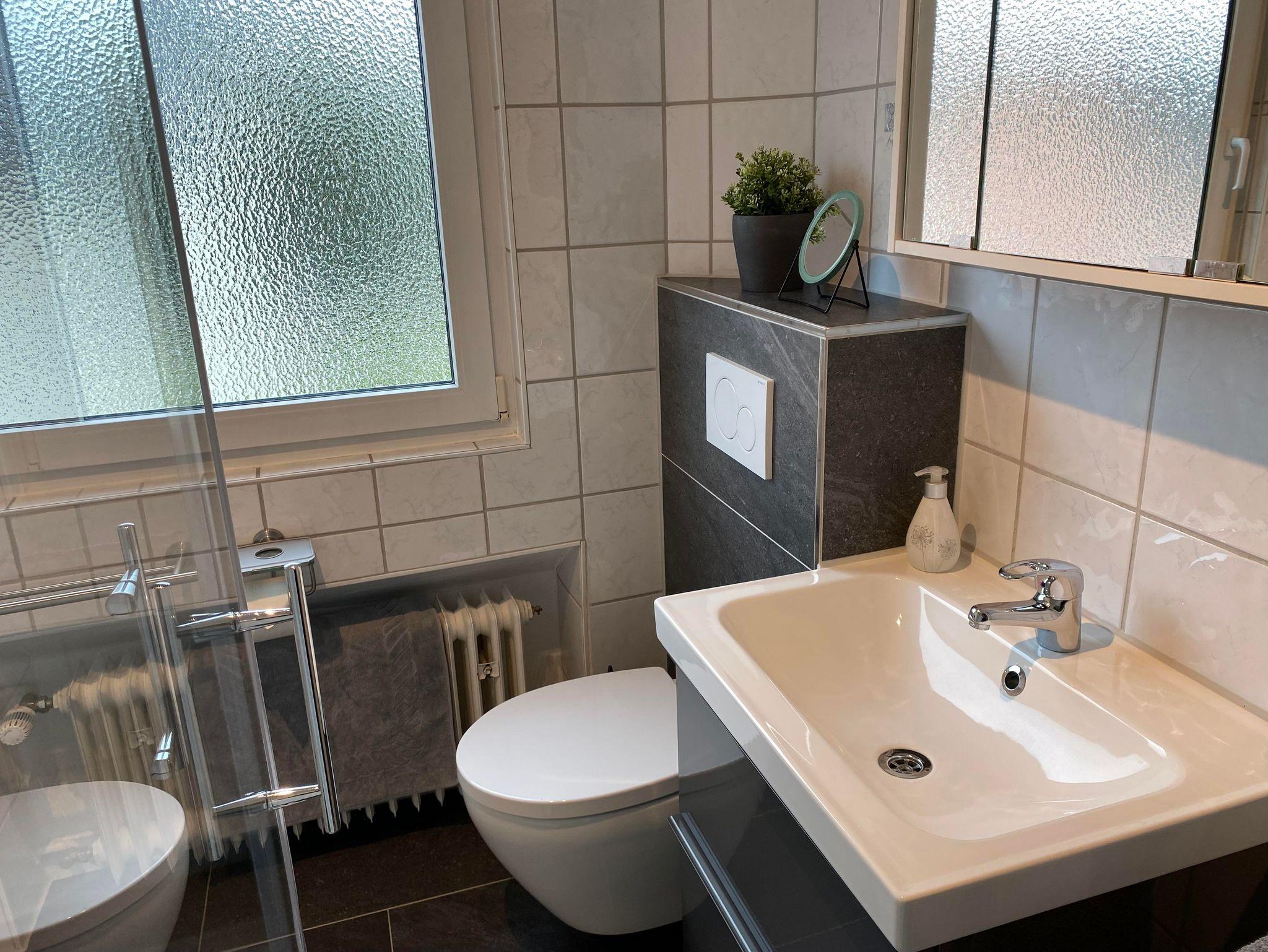 Das Badezimmer mit Tageslicht bietet neben WC und Waschbecken auch eine Dusche, um sich den Staub von Anreise und Ausflügen bei ihrem Aufenthalt in Bad Neuenahr abzuwaschen und sich für den kommenden Tag wieder frisch zu machen. Alle sanitären Elemente in unserer Ferienwohnung in Bad Neuenahr sind modernisiert.