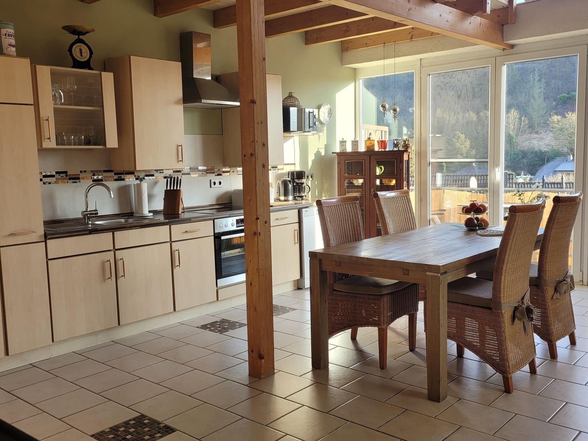 Die offene Wohnküche ist mit Spülmaschine, Mikrowelle, Herd mit Ceranfeld und Kühl-Gefrierschrank ausgestattet, zudem kann ein Thermomix ausgeliehen werden.