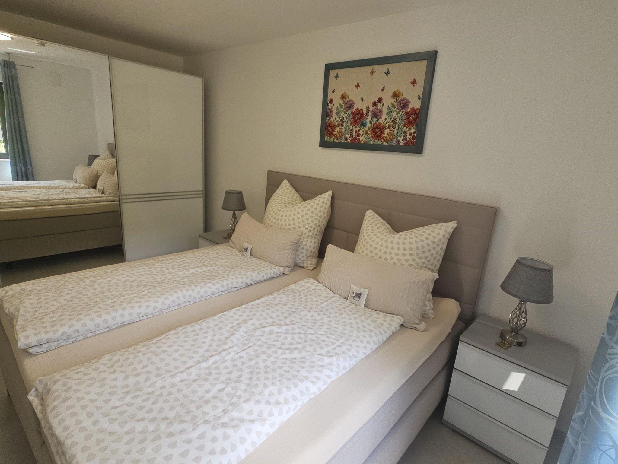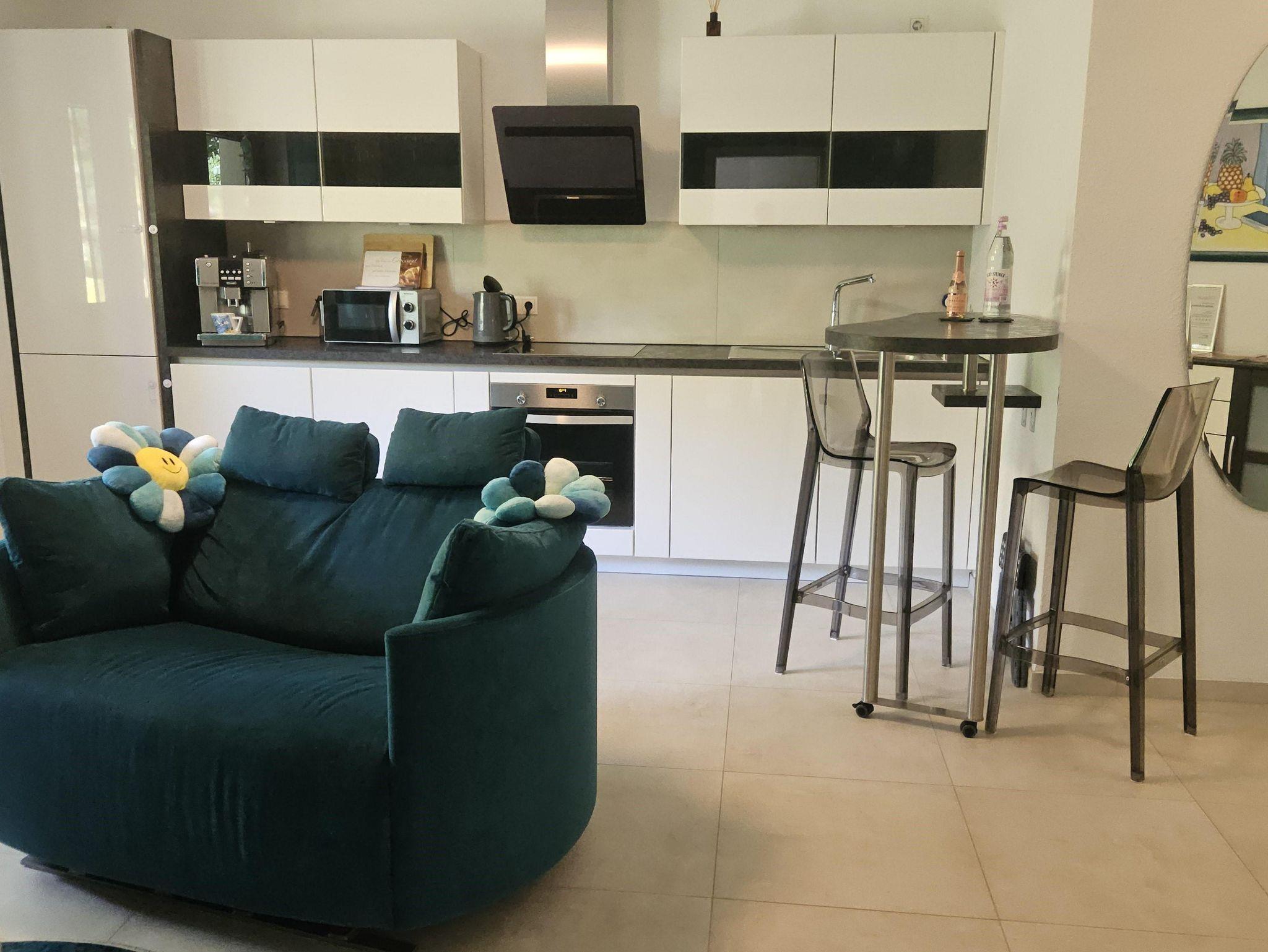 Die 45 qm große Wohnung verfügt über ein Wohn-Esszimmer mit voll ausgestatteter Küche, ein gemütliches Schlafzimmer mit Kingsize-Bett und ein exklusives, ebenerdiges Duschbad. Zwei Außensitzmöglichkeiten laden zum Verweilen inmitten von Kräutern, Bäumen und Sträuchern ein. WLAN und ein kostenloser Parkplatz stehen zur Verfügung.