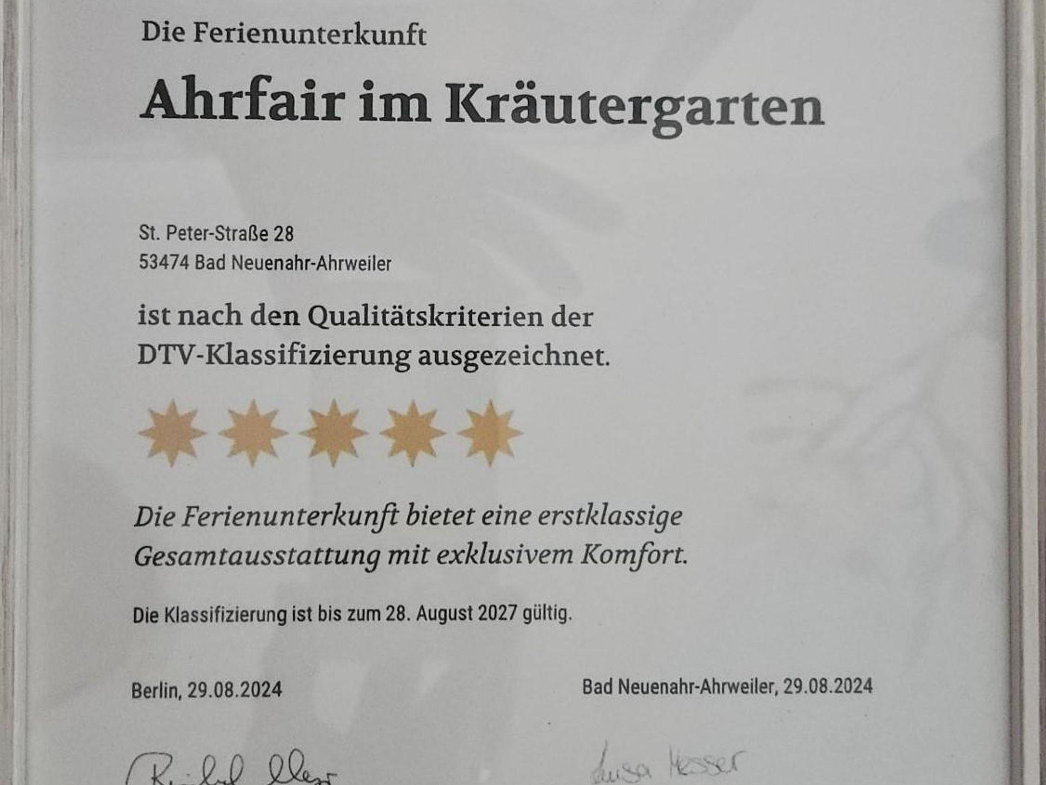 Die 5 Sterne- Ferienwohnung Ahrfair im Kräutergarten befindet sich in Bad Neuenahr-Ahrweiler, direkt an der Ahr und eingebettet in einen idyllischen Kräutergarten. Gäste sind eingeladen, die vielfältigen Kräuter für die Zubereitung ihrer Speisen zu nutzen oder aromatische Kräutertees daraus zu bereiten. Bei Sonnenschein erfüllt der Duft ätherischer Öle der Kräuter und Zitrusblüten die Luft.