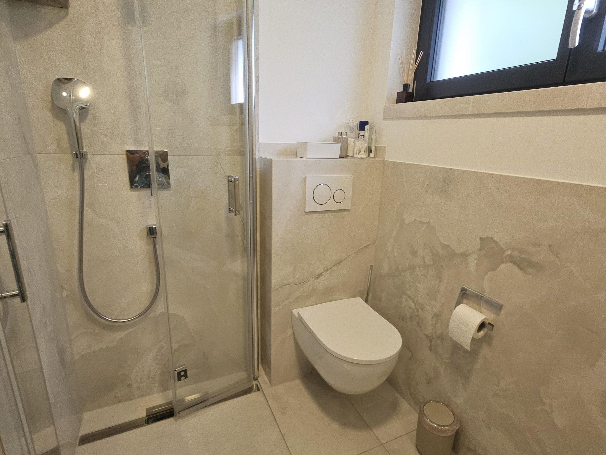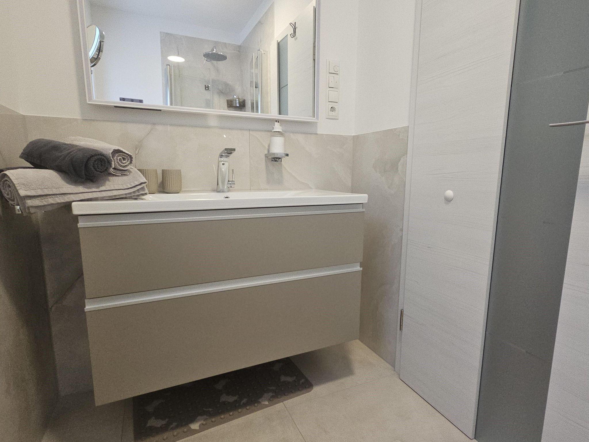 Das stilvolle Schlafzimmer ist ein echter Rückzugsort und verwöhnt Sie mit hochwertiger Kingsize-Bettwäsche, einem großzügigen Spiegelschrank, zwei eleganten Nachtkonsolen mit Touchscreen-Lampen und einem zusätzlichen LCD-Fernseher. Das moderne Duschbad mit ebenerdiger Dusche und zwei Spiegeln wurde exklusiv gestaltet und bietet höchsten Komfort.