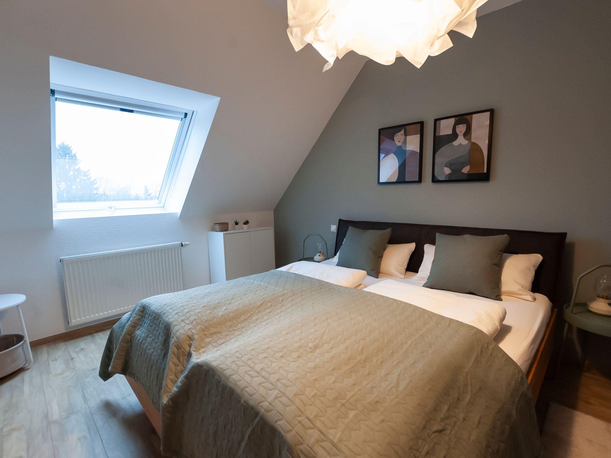 Zwei Schlafzimmer und ein Badezimmer mit Wanne und Waschmaschine befinden sich auf der 2. Etage. Ein Schlafzimmer ist mit einem Vollholzbett 180×200 und Smart-TV ausgestattet. Das zweite Schlafzimmer ebenfalls mit einem Vollholzbett 160×200 sowie einer Schlafcouch (für eine Person).