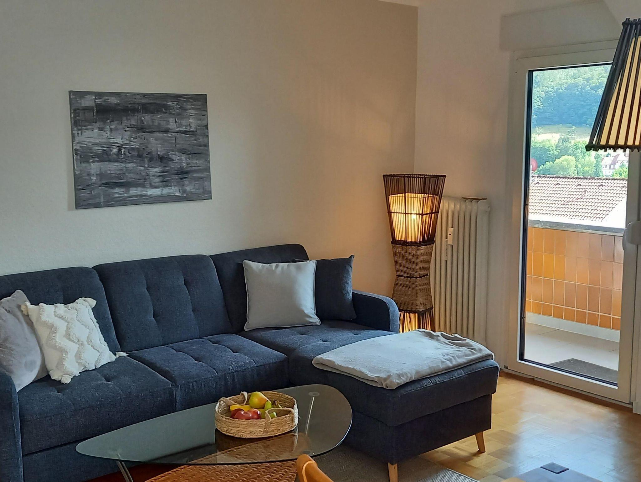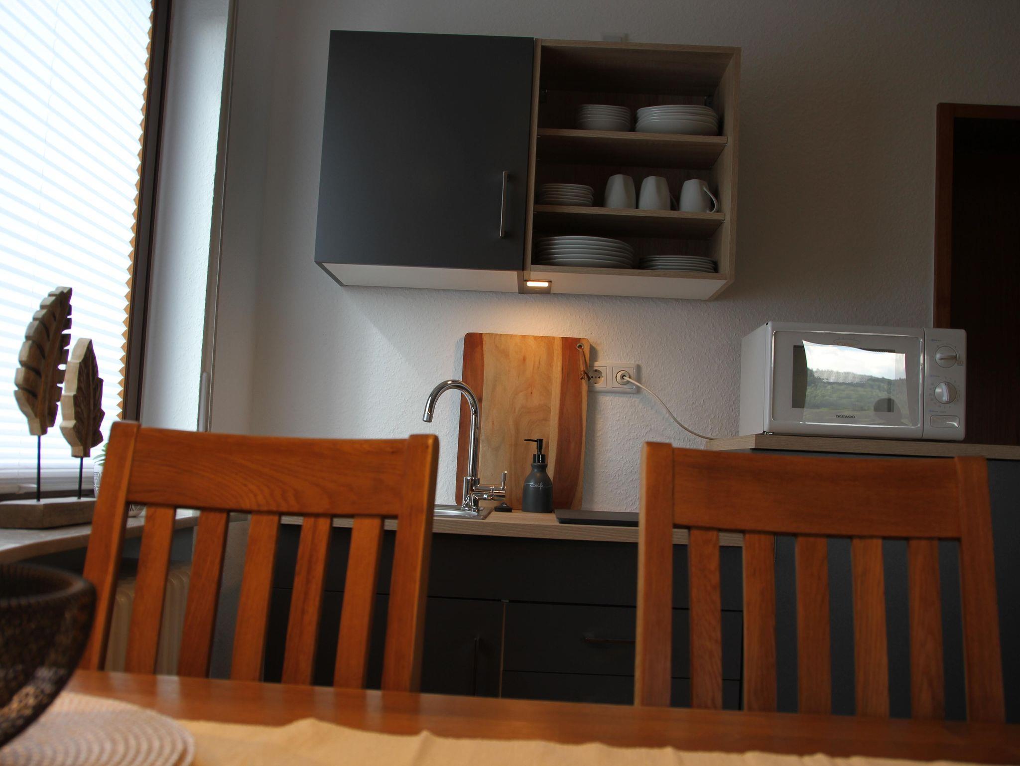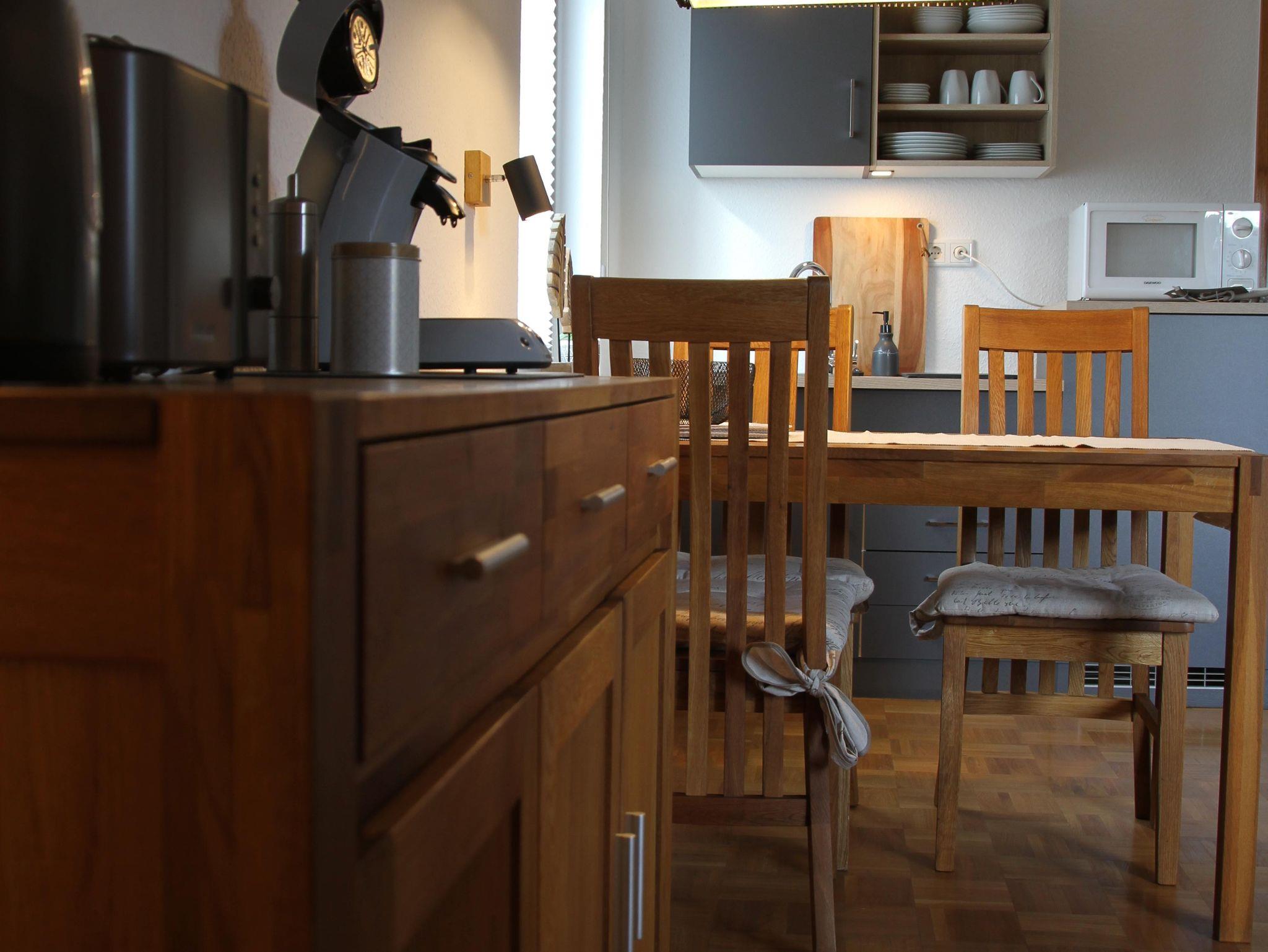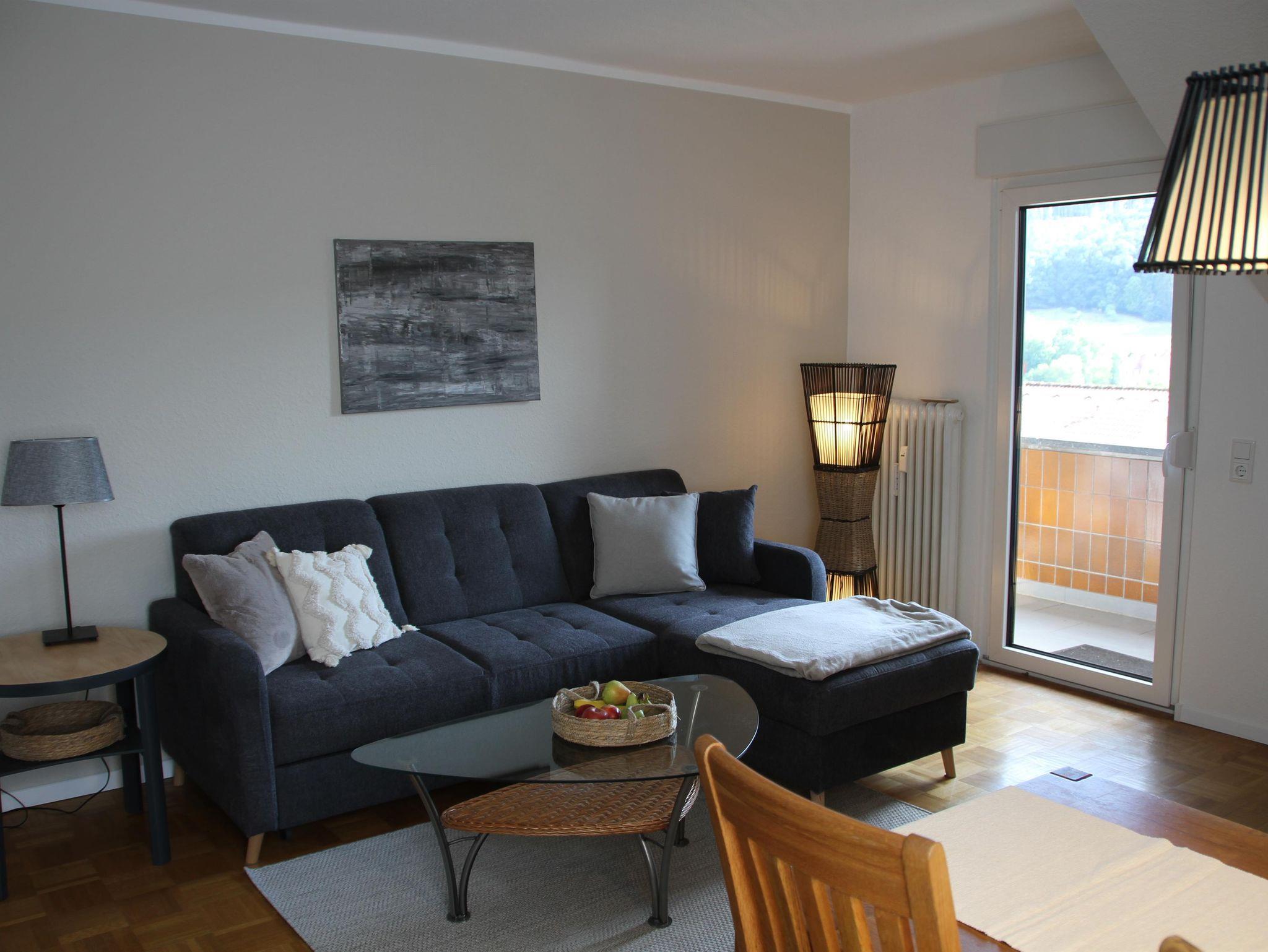 The apartment is 50 square meters and consists of a hallway, a large bedroom with a double bed (180x200 cm), a make-up table, a wardrobe and a cozy little seating area by the window. Living room, dining area and kitchenette are housed in a separate large room. The sofa is extendable (130 x 200 cm). From there it goes into the bathroom with sink, toilet and shower including hair dryer. You will find everything you need for your holiday in the small kitchen. A large refrigerator with freezer compartment, a 2-ring ceramic hob, a microwave, a toaster, a kettle and a coffee machine (Senseo) are also available. Tea, some coffee pats, canned milk and a bottle of water are ready for you. From the south-facing living room you can access a small balcony with a wonderful view of nature and the spa park/the town of Bad Orb. The price includes bed linen, towels, 2 bathrobes and laundry for the kitchen. You can park your vehicle free of charge in the courtyard (depending on the size, please ask when booking) directly in front of the front door. Smoking in the apartment is not permitted.