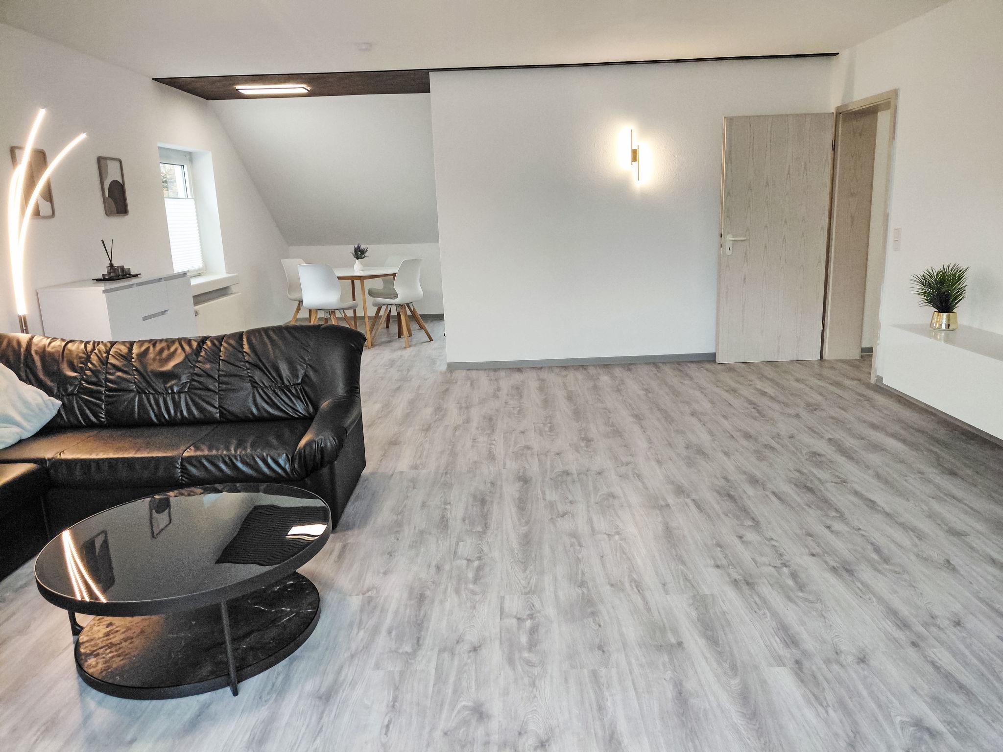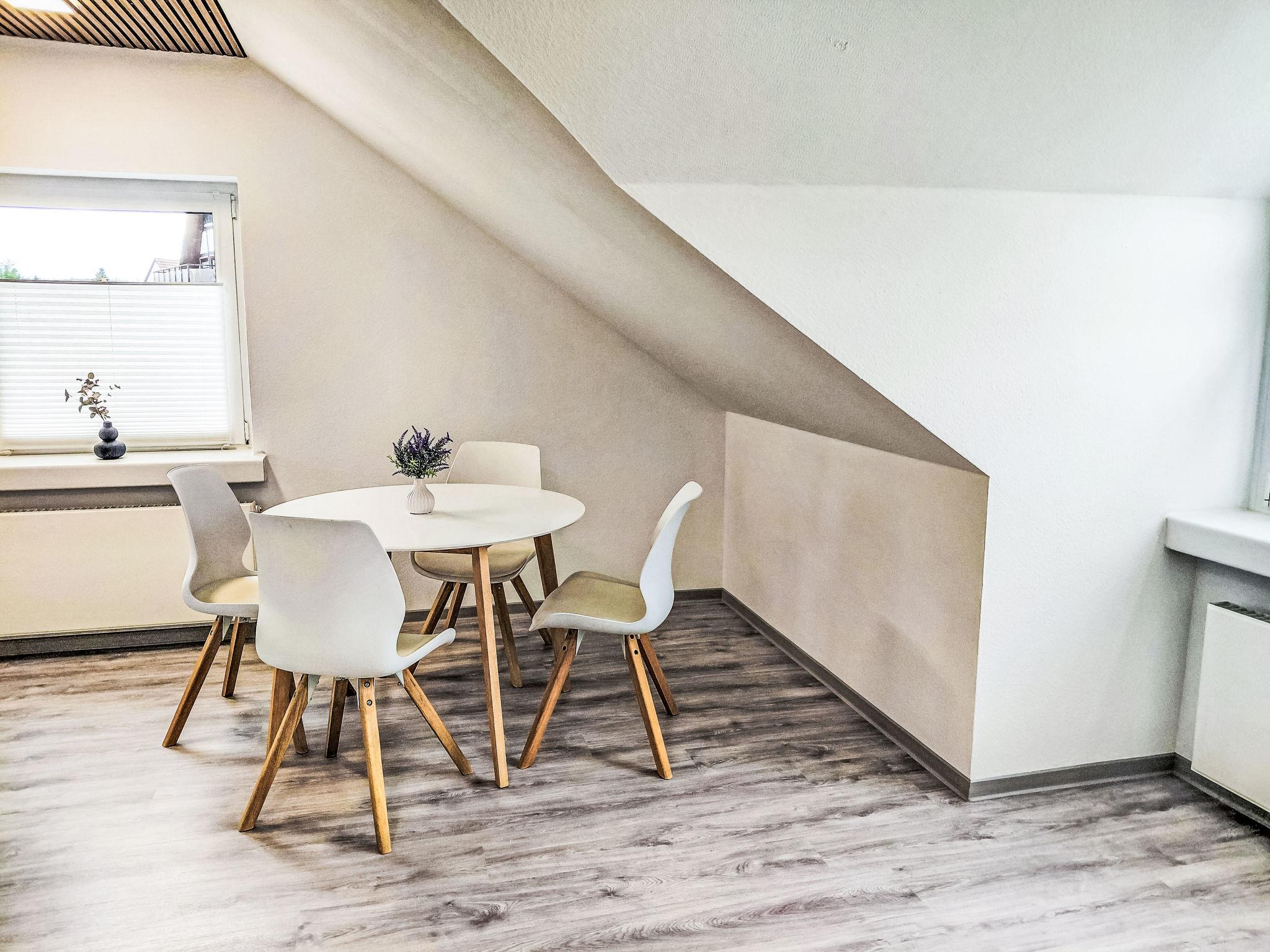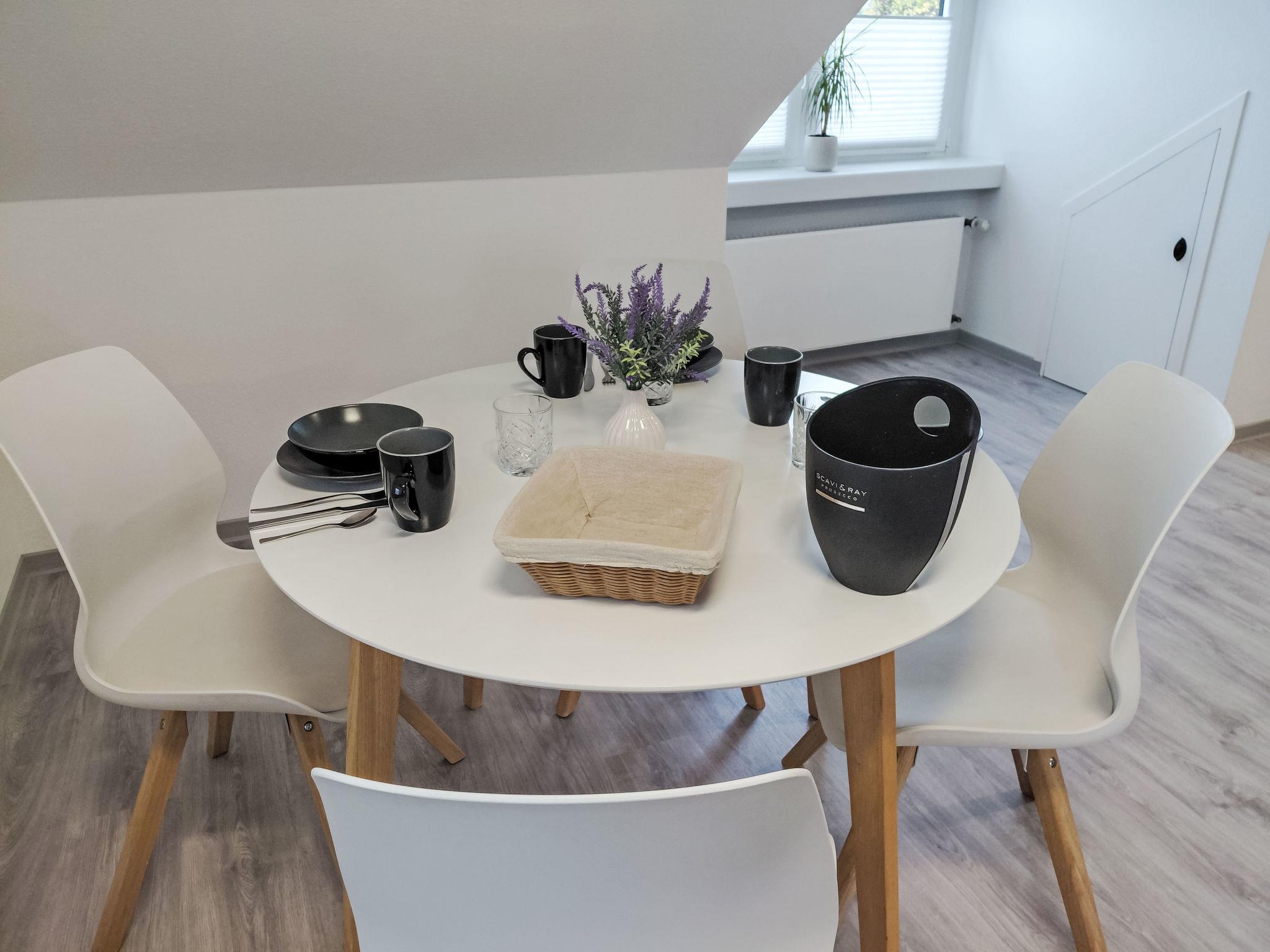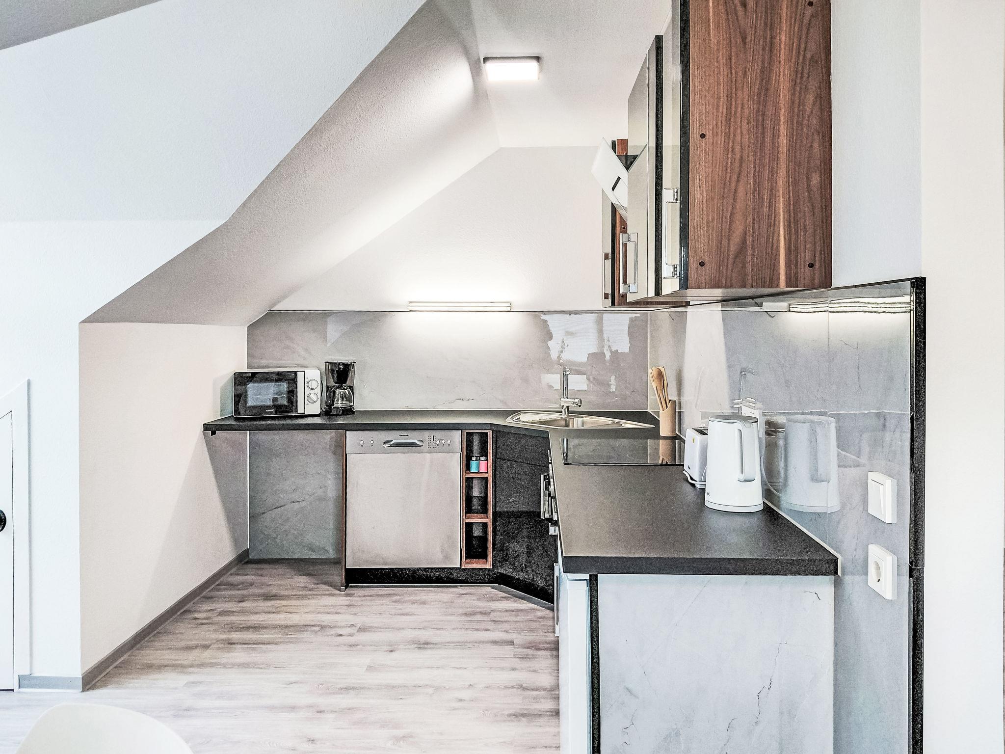 "Sonnenschein", 2-room apartment 80 m2, on the top floor. With sloping ceilings, renovated in 2025, practical and modern furnishings: living/sleeping room with 1 sofabed (110 cm, length 200 cm), dining table and cable TV (flat screen). 1 room with 1 double bed. Open kitchen (oven, dishwasher, 4 ceramic glass hob hotplates, toaster, kettle, microwave, freezer, electric coffee machine). Shower/WC. Gas heating. Facilities: washing machine, children's high chair, baby cot, hair dryer. Internet (WiFi, free). Please note: non-smokers only. Smoke alarm, fire extinguisher.