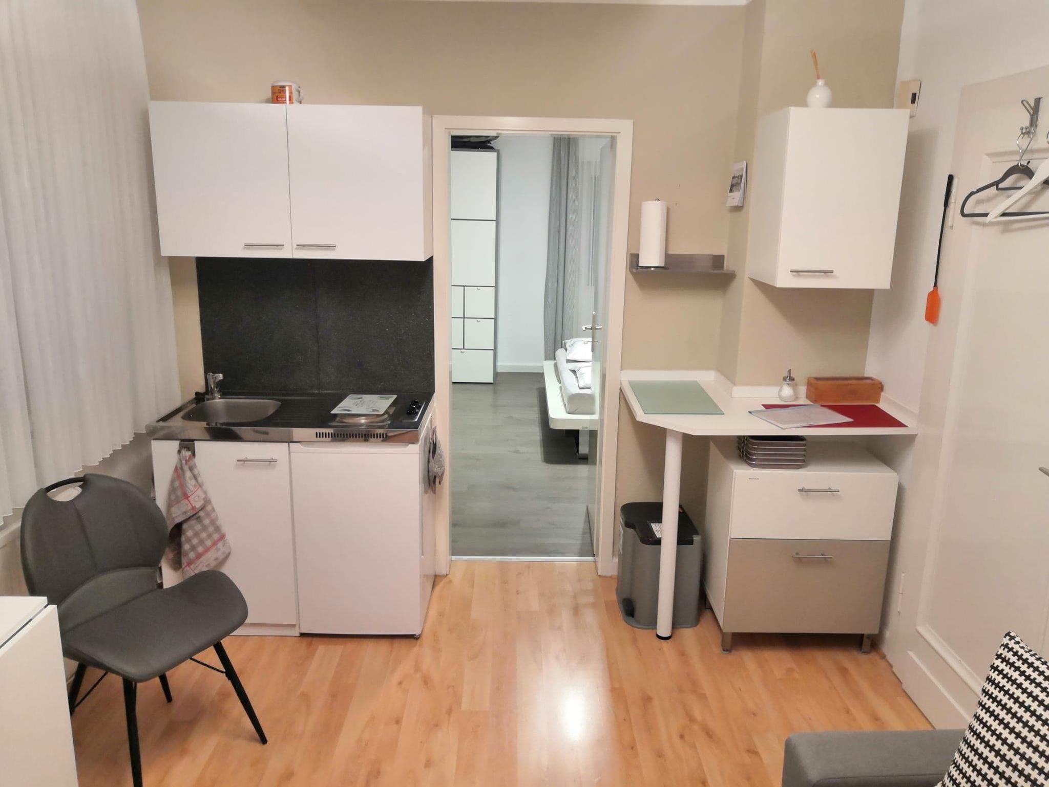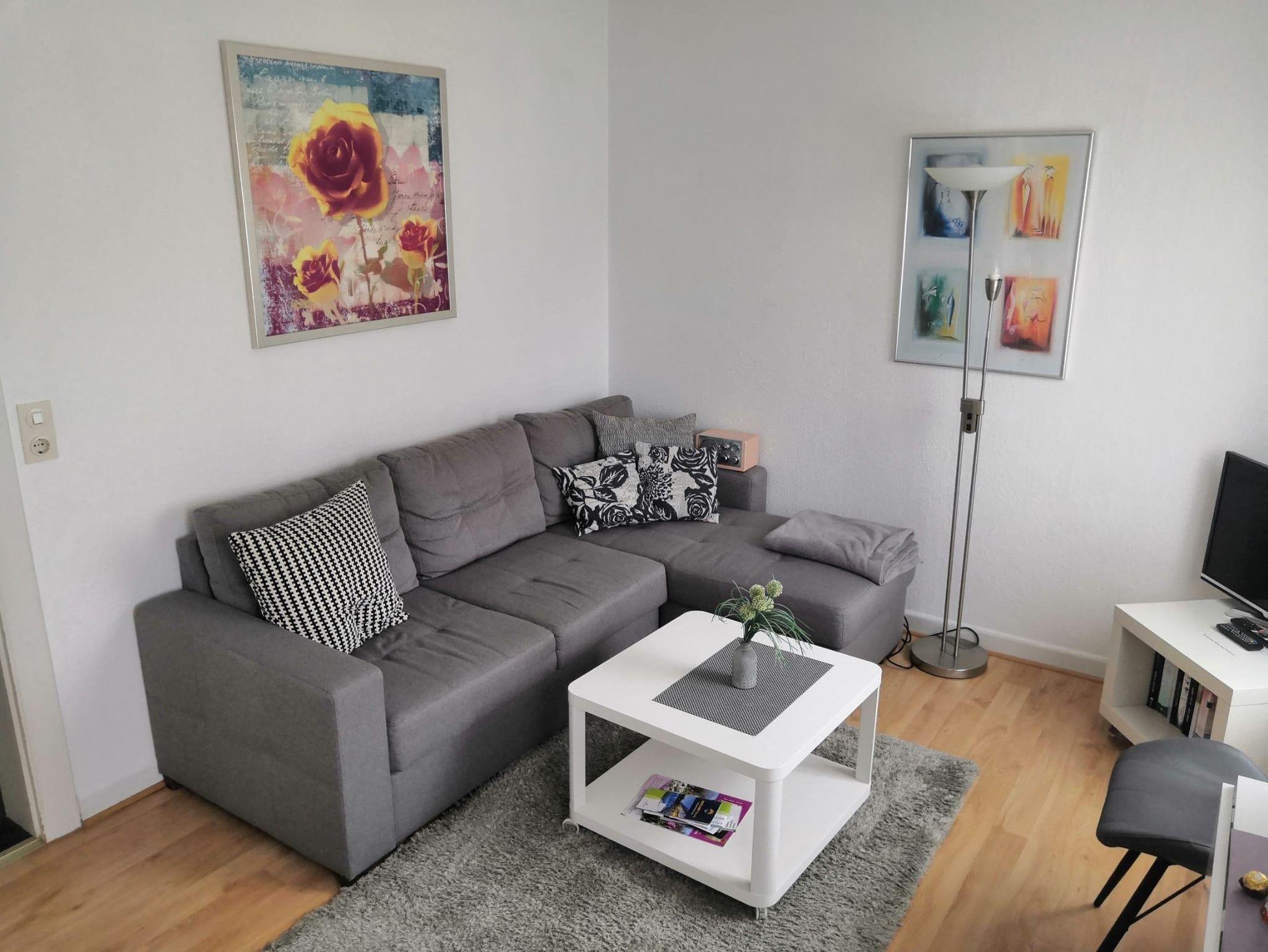 Appartement 2 Diese helle und freundliche 2 Zimmer Ferienwohnung (34 qm) liegt im 1. OG links auf der Westseite und ist mit dem gut gelegenen überdachten Balkon (West-Nord) bei den Paaren und kleinen Familien, oder kleinen Gästegruppen sehr beliebt. Sie kommen direkt in das Wohnzimmer mit einem modernen Ecksofa (auch als Schlafsofa nutzbar) und einer kleinen Singleküche mit kleinem Essplatz. Es ist mit einem Fernseher (Kabel-TV), sowie schneller Internetverbindung (WiFI) ausgestattet. Die Küchennische ist allem Notwendigen und folgenden Geräten ausgestattet: Spüle, 2-Kochplatten, Kühlschrank mit Gefrierfach, Toaster, Kaffeemaschine und Wasserkocher. Eine Mikrowelle und ein Backofen können bei Bedarf in der gemeinsamen größeren Küche im EG genutzt werden.