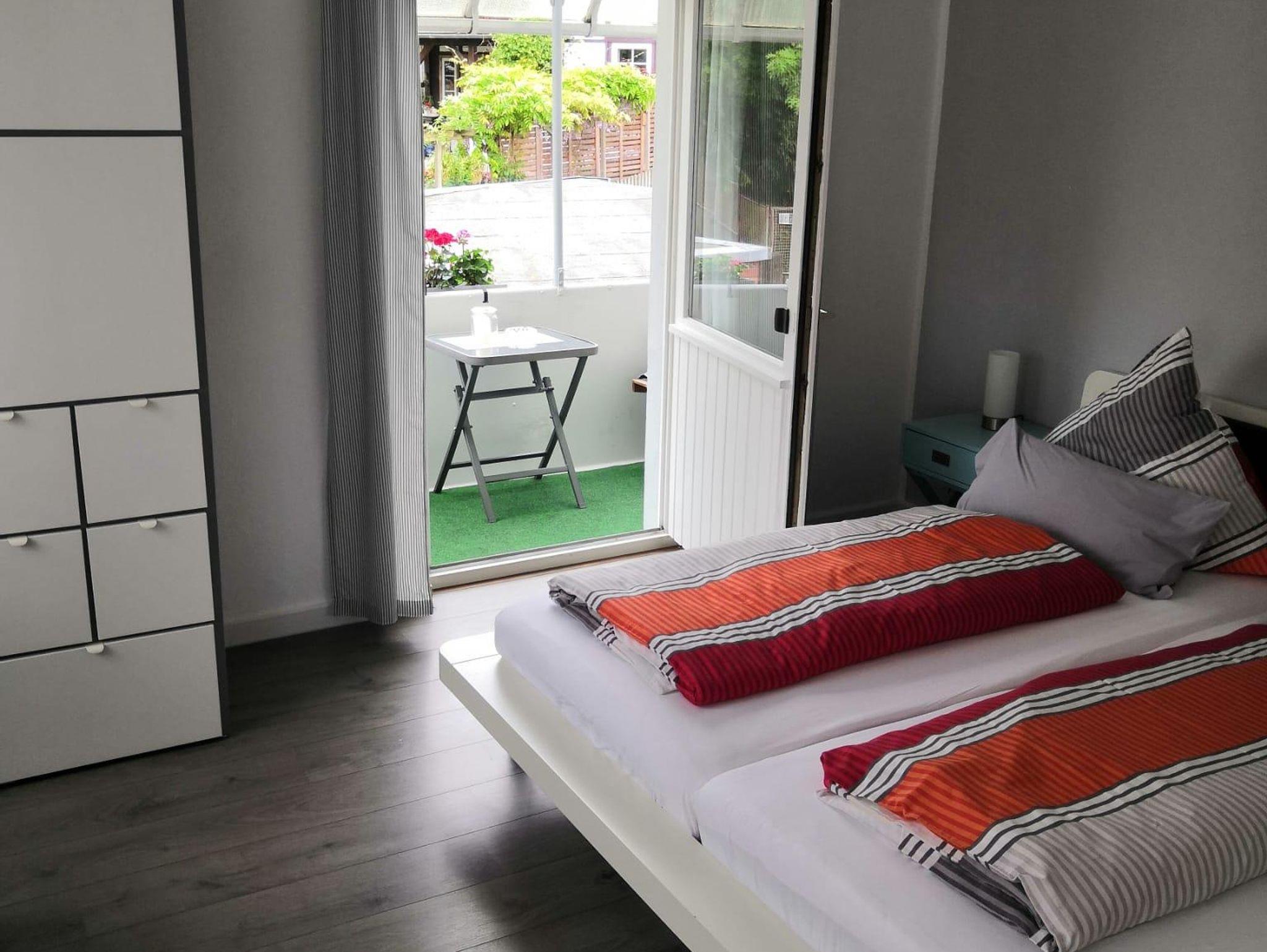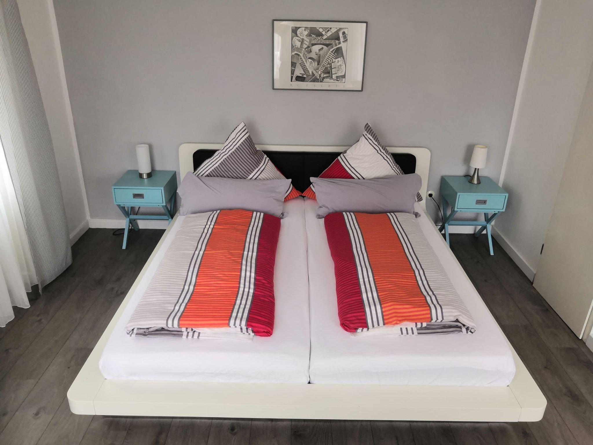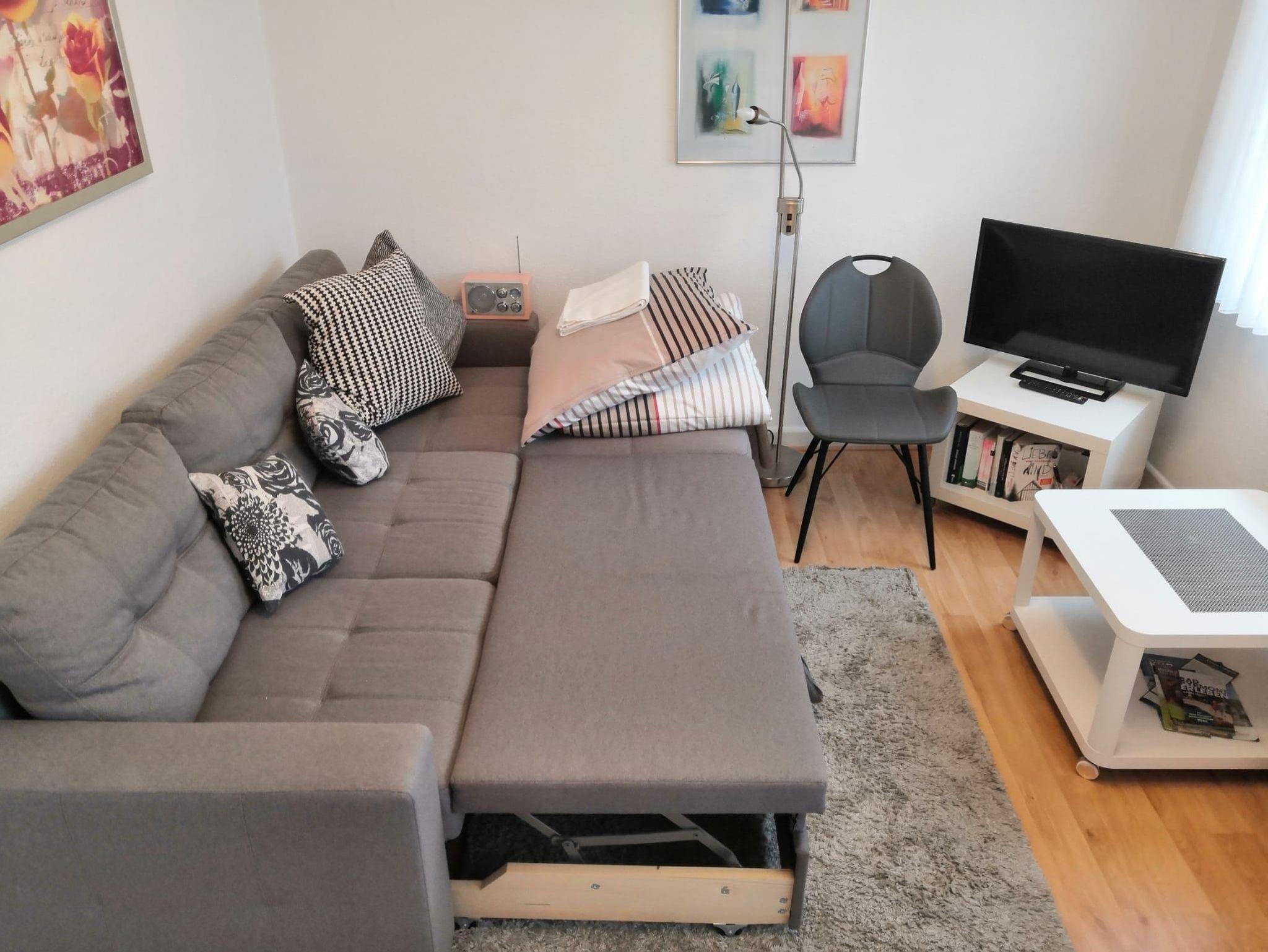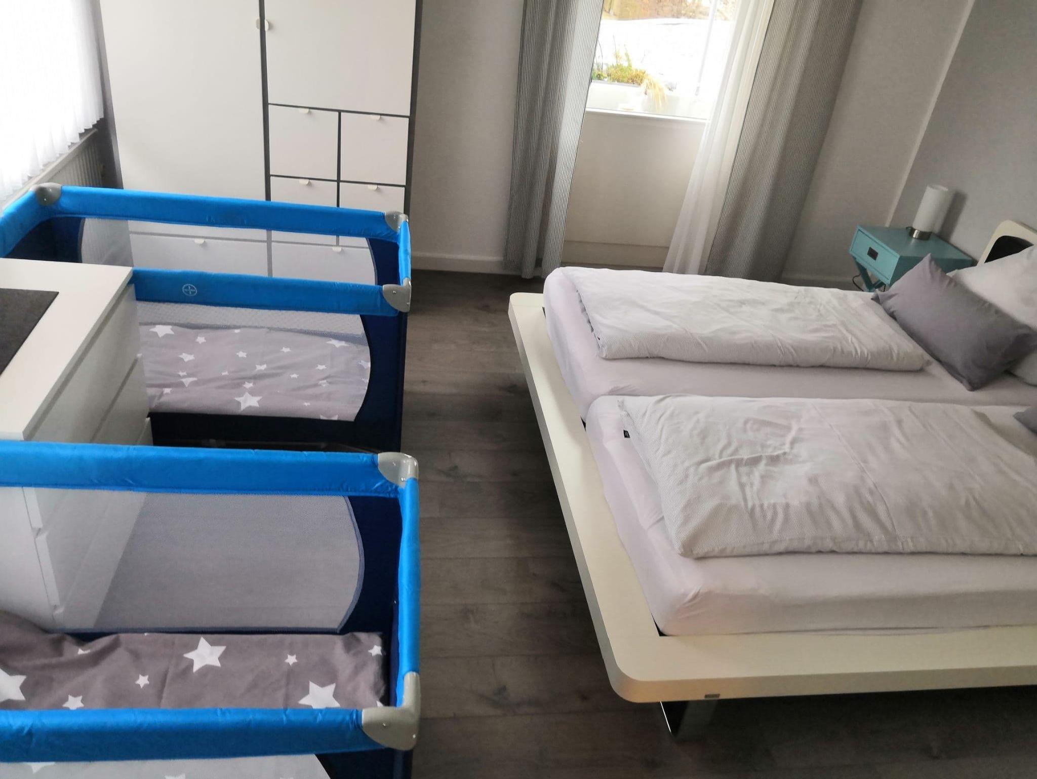 Betten für 3 Personen: ein Doppelbett im Schlafzimmer und ein Schlafsofa (140x200) im Wohnzimmer. Beim Bedarf kann auf Nachfrage 1 Babyreisebett mit Decke, Kissen und Bettwäsche (0-3 Jahre) mit einmaligem Aufpreis von 15€ zur Verfügung gestellt werden.