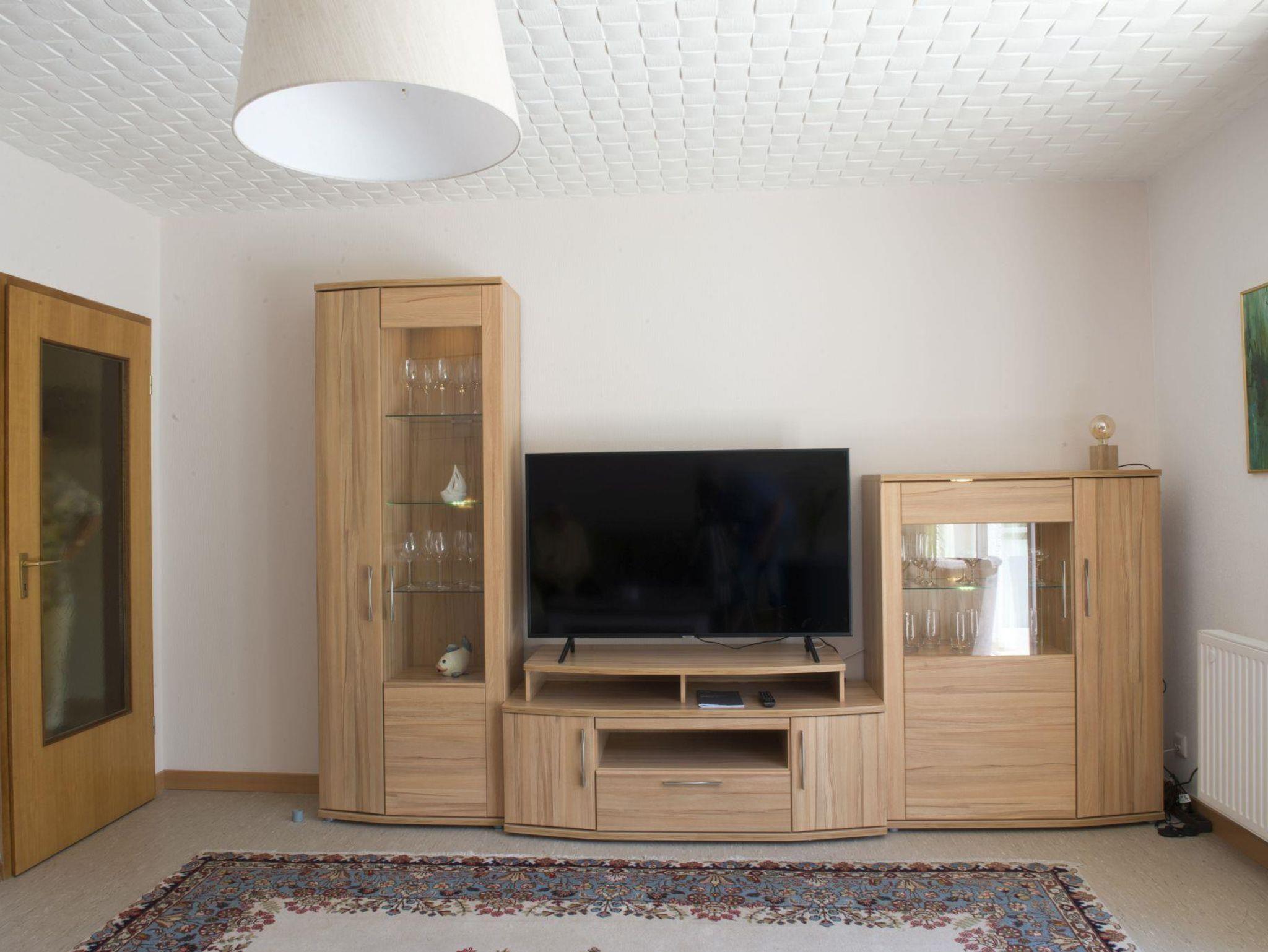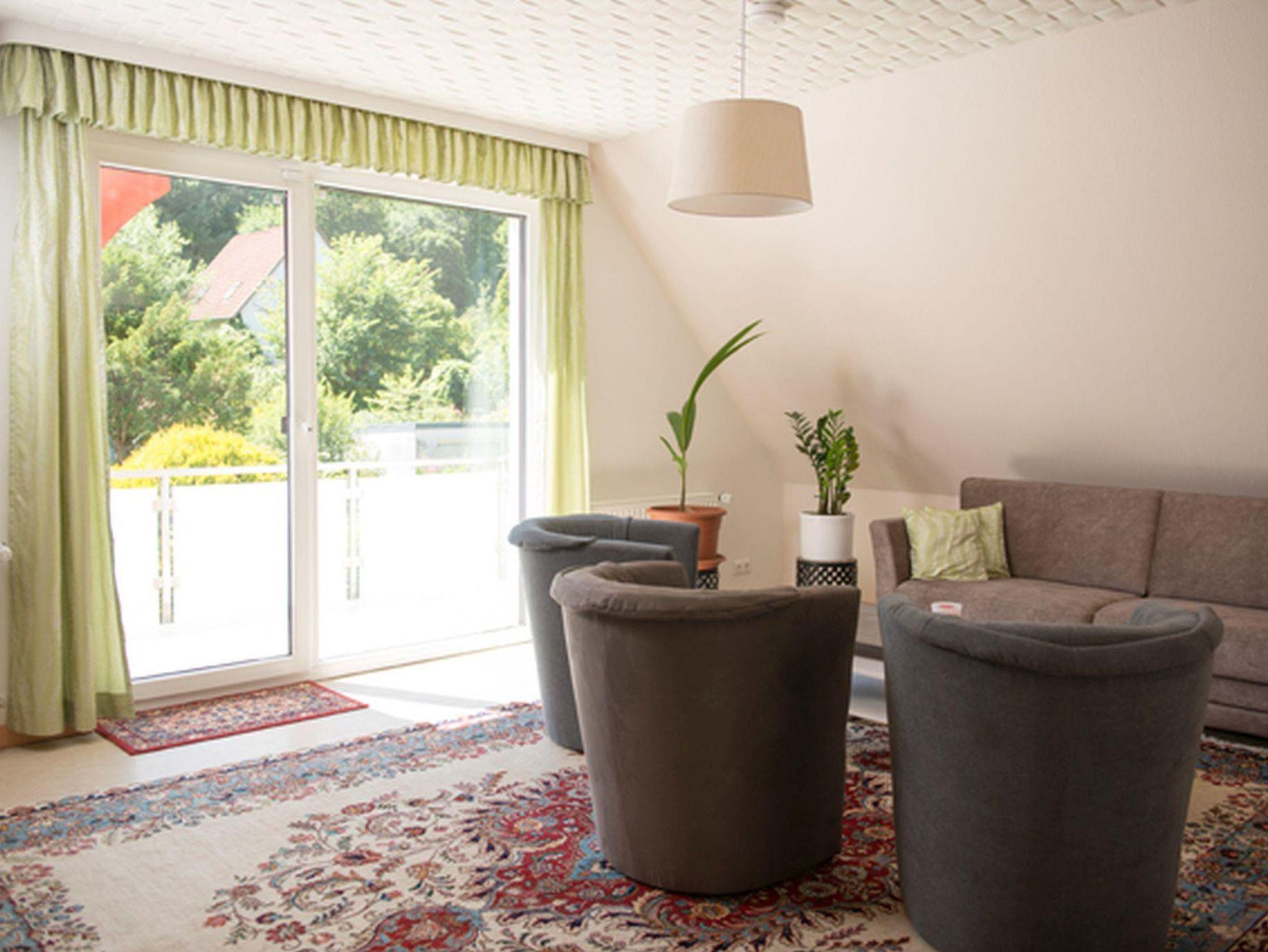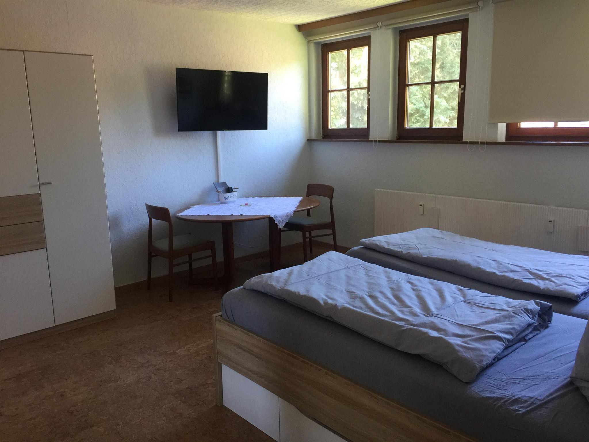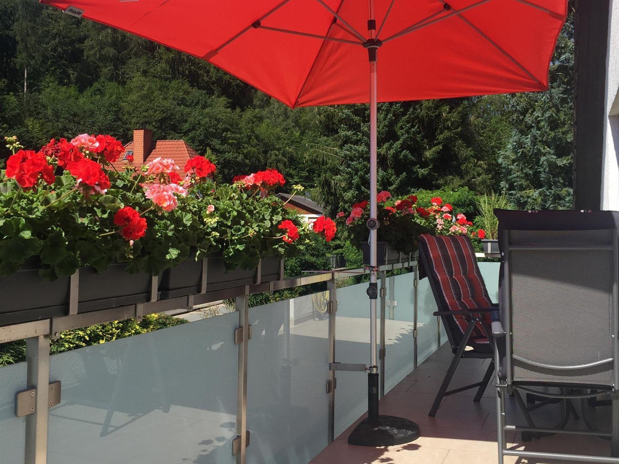 2 x TV, Radio. Waldnähe, Blick auf den Königsberg vom großen Balkon (1,50 m x 9 m).