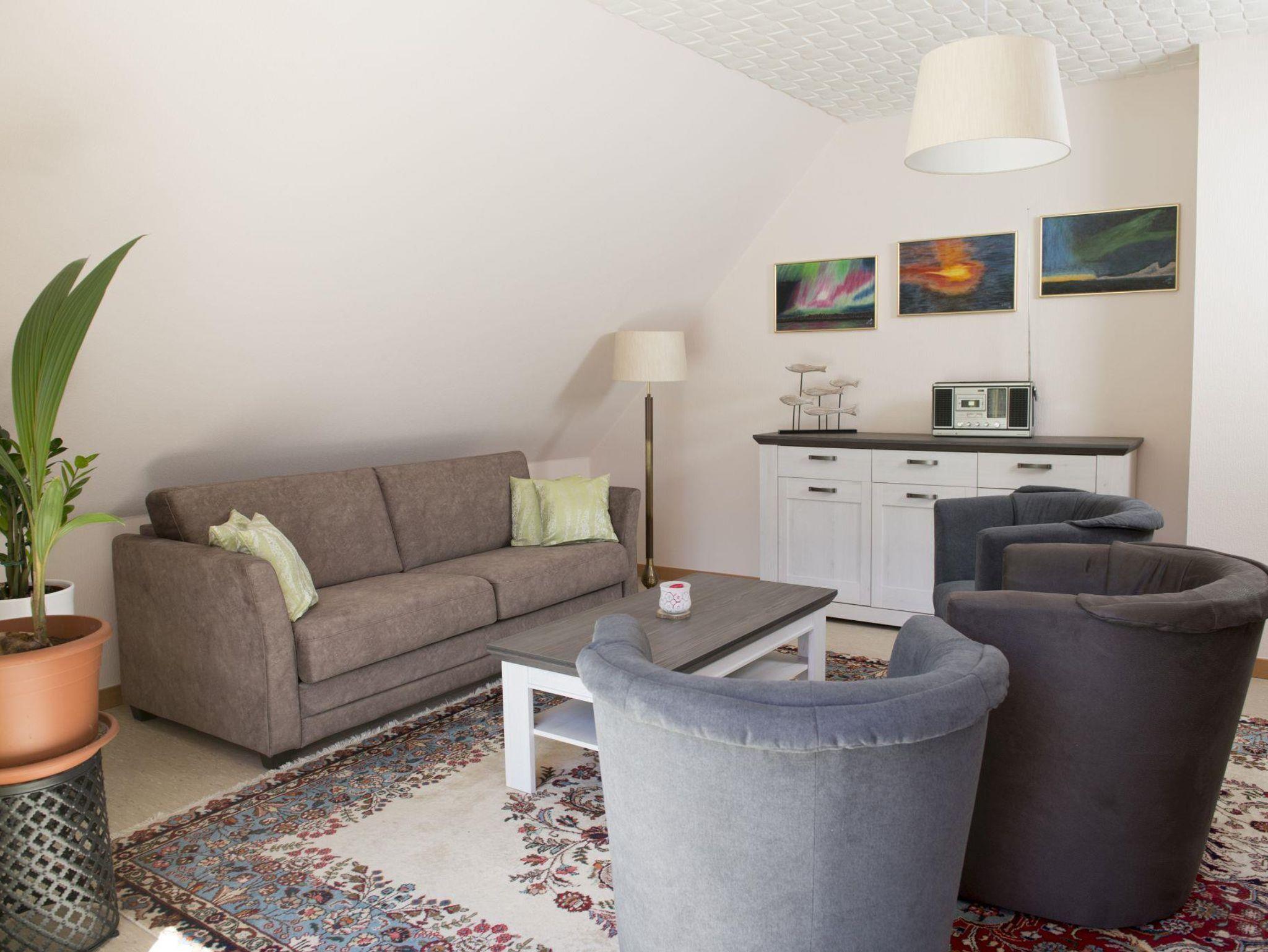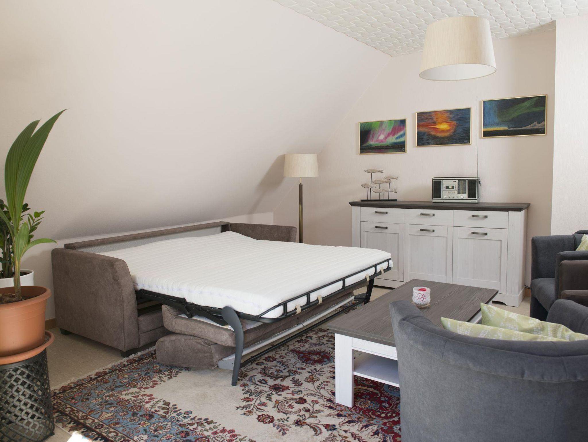 ABRACADABRA- unsere zauberhafte Ferienwohnung im 1. Obergeschoss ist durch Umwandlung der Doppel-Schlafcouch (Betthöhe) im großen Wohnzimmer und 1 Zustellbett im Schlafzimmer für 2-5 Personen nutzbar.