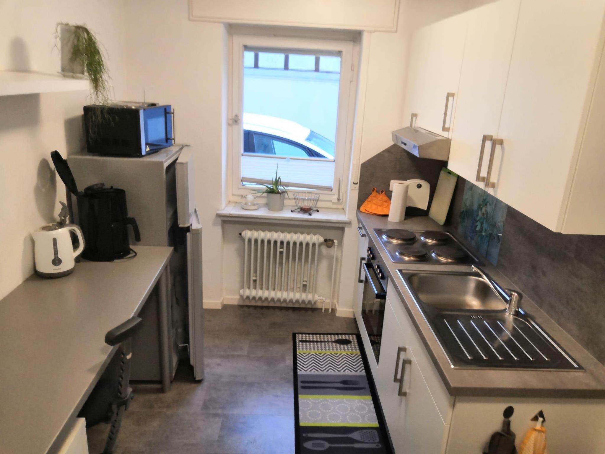 Eigene Küche hat eine gute Ausstattung und folgende Küchengräte: Wasserspüle, 4-Platten-Herd, Backofen, Mikrowelle, großen Kühlschrank mit Gefrierfach, Wasserkocher, Toaster, Kaffeemaschine, Eierkocher u.v.m.)