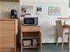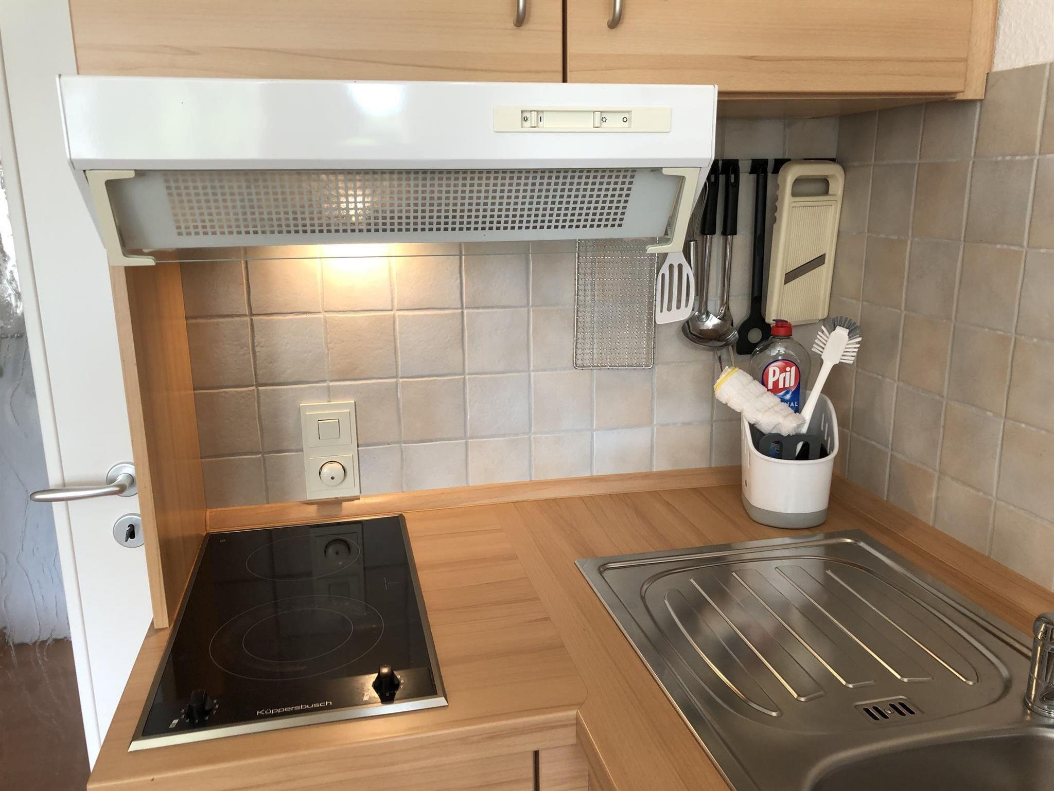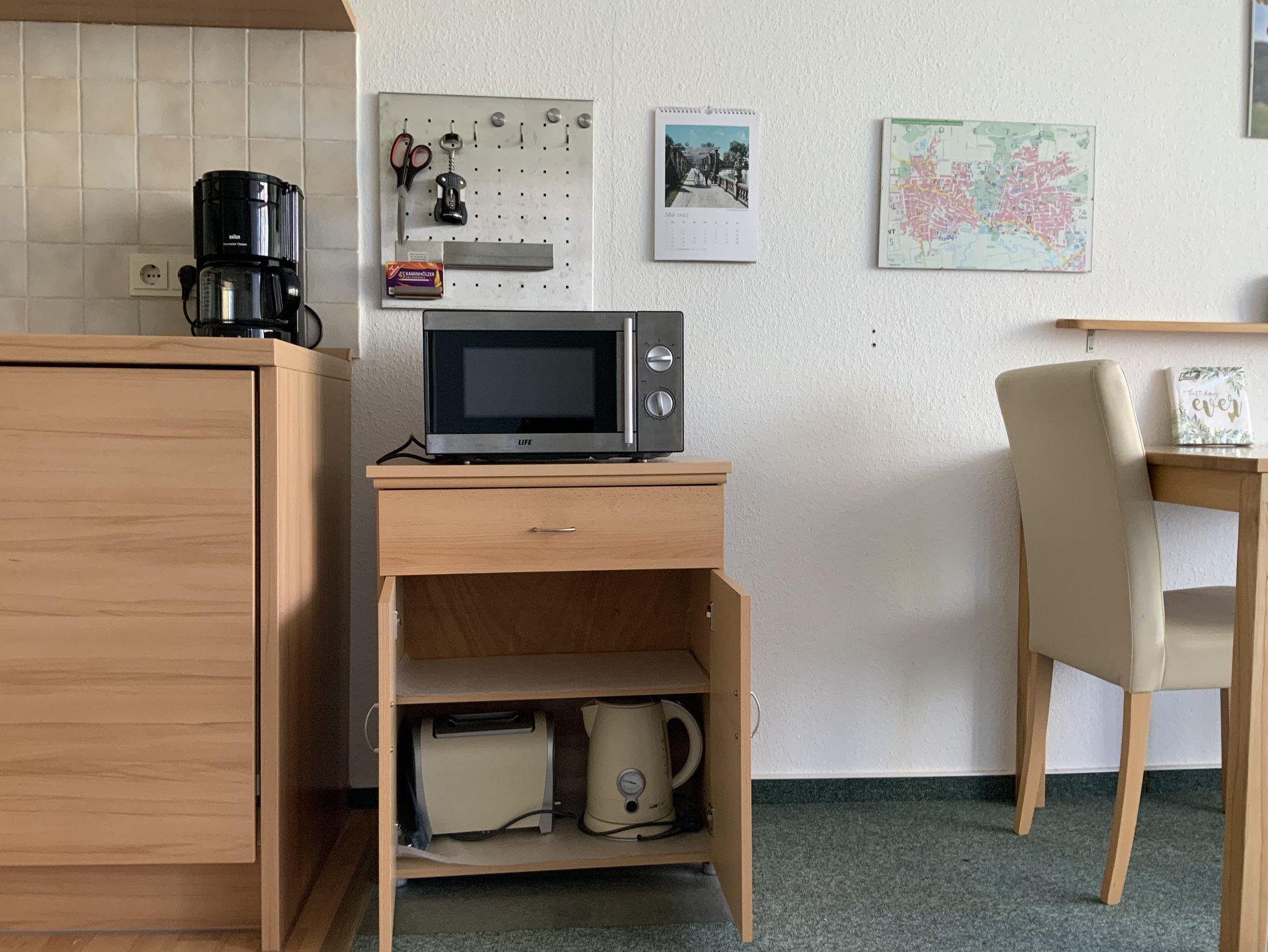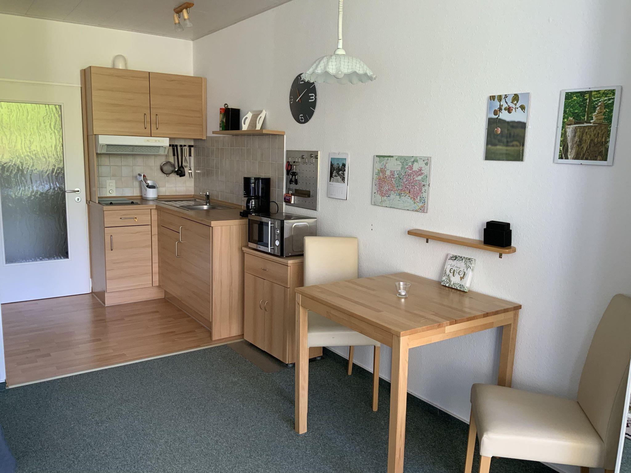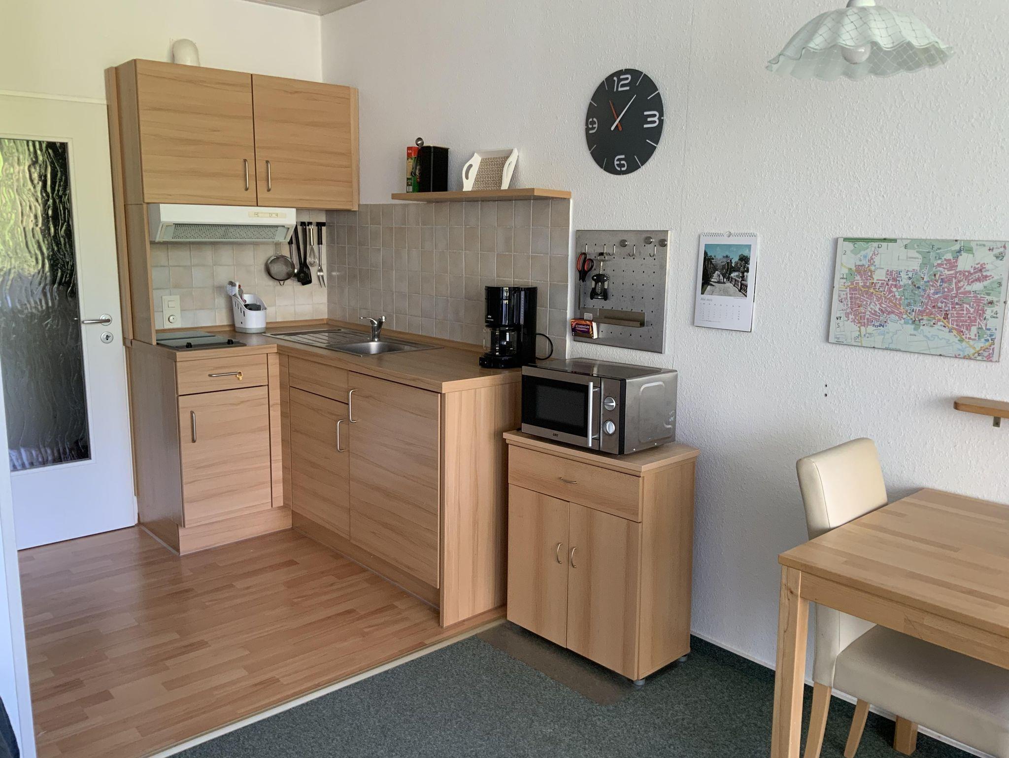 Das Appartement (35 qm) verfügt über eine Diele, Badezimmer mit WC und Badewanne/ Duschvorrichtung und Föhn. Die Küchenzeile hat 2 Cerankochplatten, Toaster, (Filter-) Kaffeemaschine, Wasserkocher, Mikrowelle, Esstisch und Stühle.