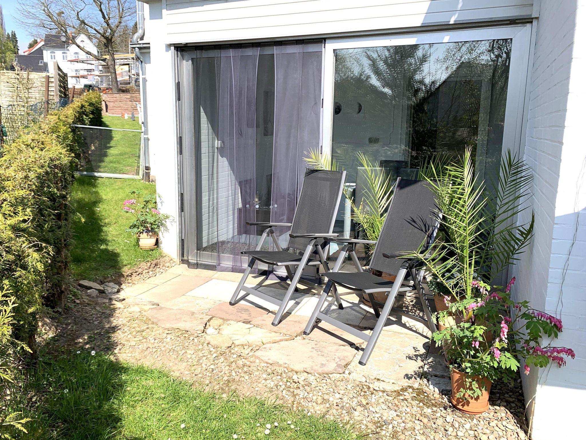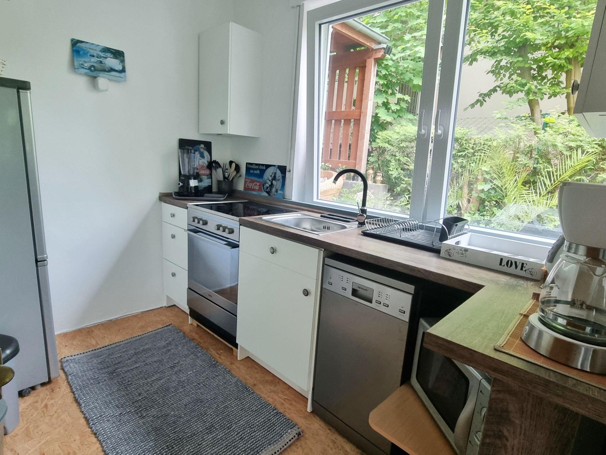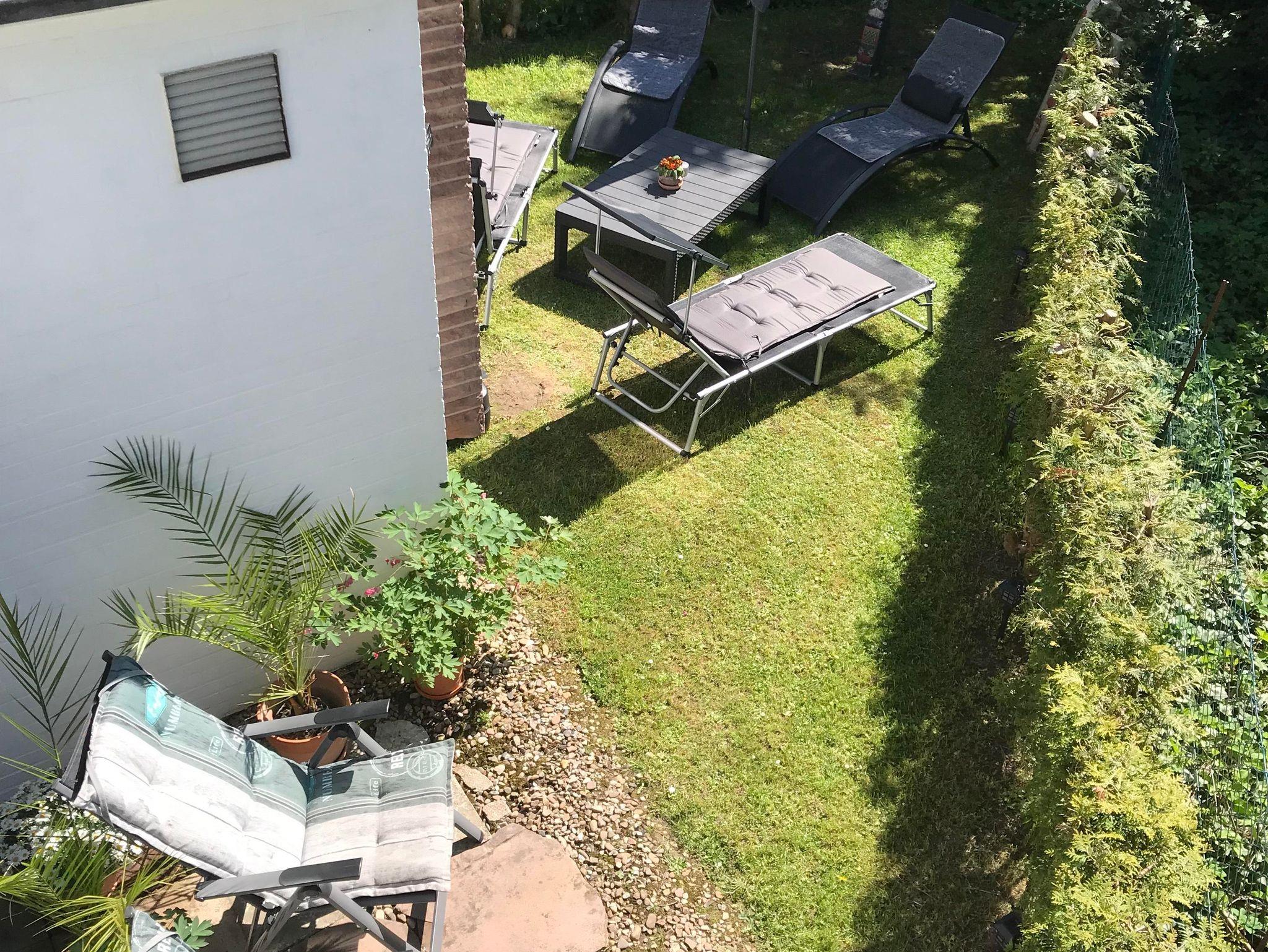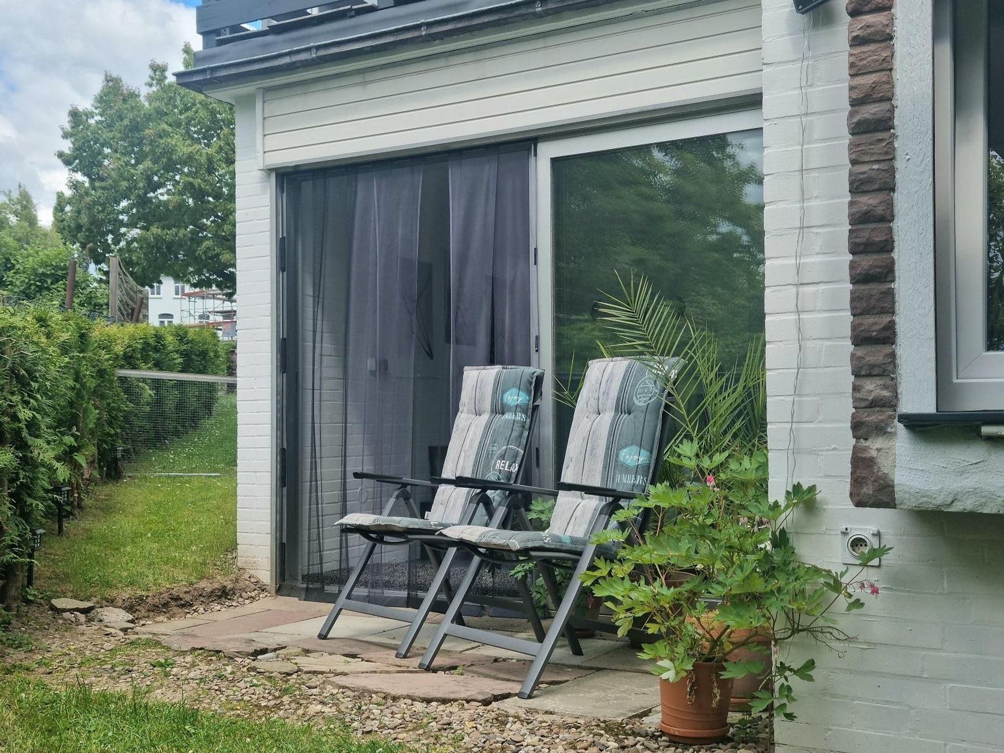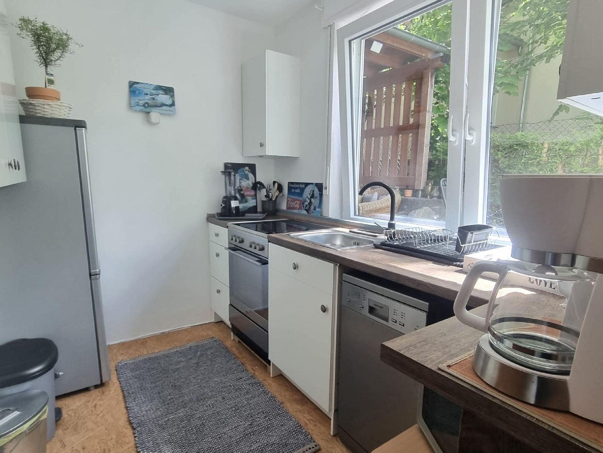 Die liebevoll und modern eingerichtete Parterrewohnung empfängt Sie mit einem separaten Eingang, den Sie über einige Treppenstufen erreichen. Beim Betreten gelangen Sie in den Eingangsbereich mit Garderobe, wo auch Reinigungsmittel, ein LAN-Anschluss für Ihren Laptop, ein Kinderhochstuhl sowie zwei mobile Zustellbetten für den 3. und 4. Gast bereitstehen. Direkt anschließend befindet sich das Badezimmer mit Dusche. Über eine Treppenstufe führt der Weg in das helle Schlafzimmer mit großem Fenster. Hier sorgt ein hochwertiges 1,40 x 2 m Boxspringbett für erholsamen Schlaf. Die Betten sind frisch bezogen, Hand- und Geschirrtücher liegen für Sie bereit. Vom Schlafzimmer aus gelangen Sie entweder in die maßgefertigte, voll ausgestattete Küche mit großem Fenster oder in das lichtdurchflutete Wohn-/Esszimmer.Die Küche bietet alles, was Sie zum Kochen brauchen: Spülmaschine, Herd, Mikrowelle, Kühl-Gefrier-Kombi, zahlreiche Küchenutensilien sowie Kaffeemaschine, Wasserkocher, Standmixer und Toaster. Ein Mülltrennungssystem, Handstaubsauger und Feuerlöscher sind ebenfalls vorhanden. Das großzügige Wohn-/Esszimmer ist der hellste Raum der Wohnung. Ein doppelflügeliges Fenster und eine bodentiefe Glasschiebetür zur Sonnenseite lassen viel Licht herein. Die mobilen Zustellbetten können flexibel platziert werden – im Esszimmer, im Vorraum oder zusätzlich im Schlafzimmer. Im Wohnzimmer laden zwei bequeme Ledersofas mit weichen Auflagen zum Entspannen ein. Ein Couchtisch, ein TV , ein Radio, sowie ein Standventilator sorgen für zusätzlichen Komfort. Ein Essbereich mit großem Glastisch für alle Gäste ist auch vorhanden. Dank des ebenerdigen Zugangs zur eigenen Terrasse und dem angrenzenden Garten fühlt sich die Wohnung wie ein kleines Ferienhaus an. Von etwa 10:00 bis 17:00 Uhr genießen Sie hier auf den Gartenliegen entspannte Sonnenstunden. Die ruhige, nach hinten gelegene Lage garantiert Erholung inmitten der Natur.