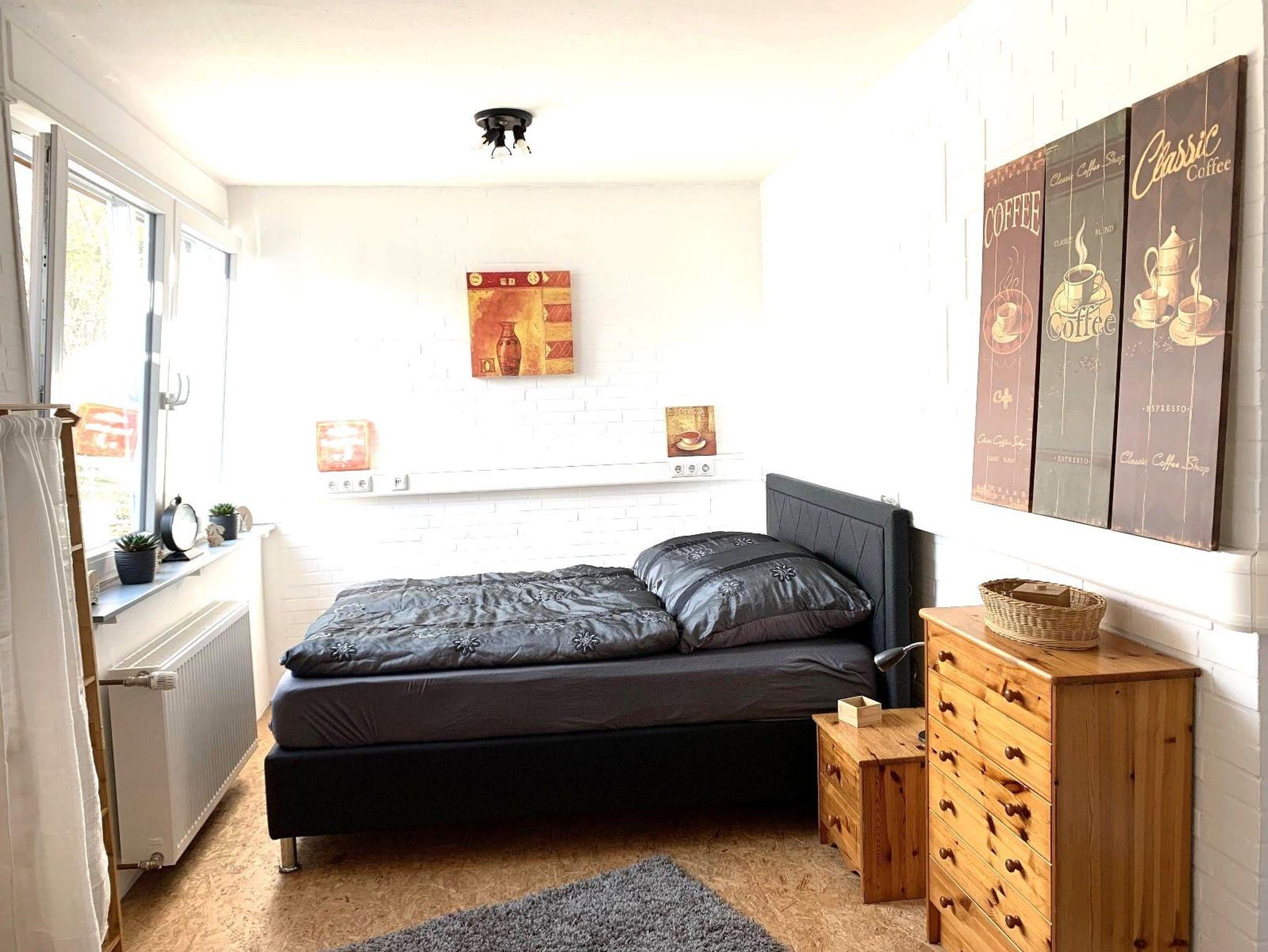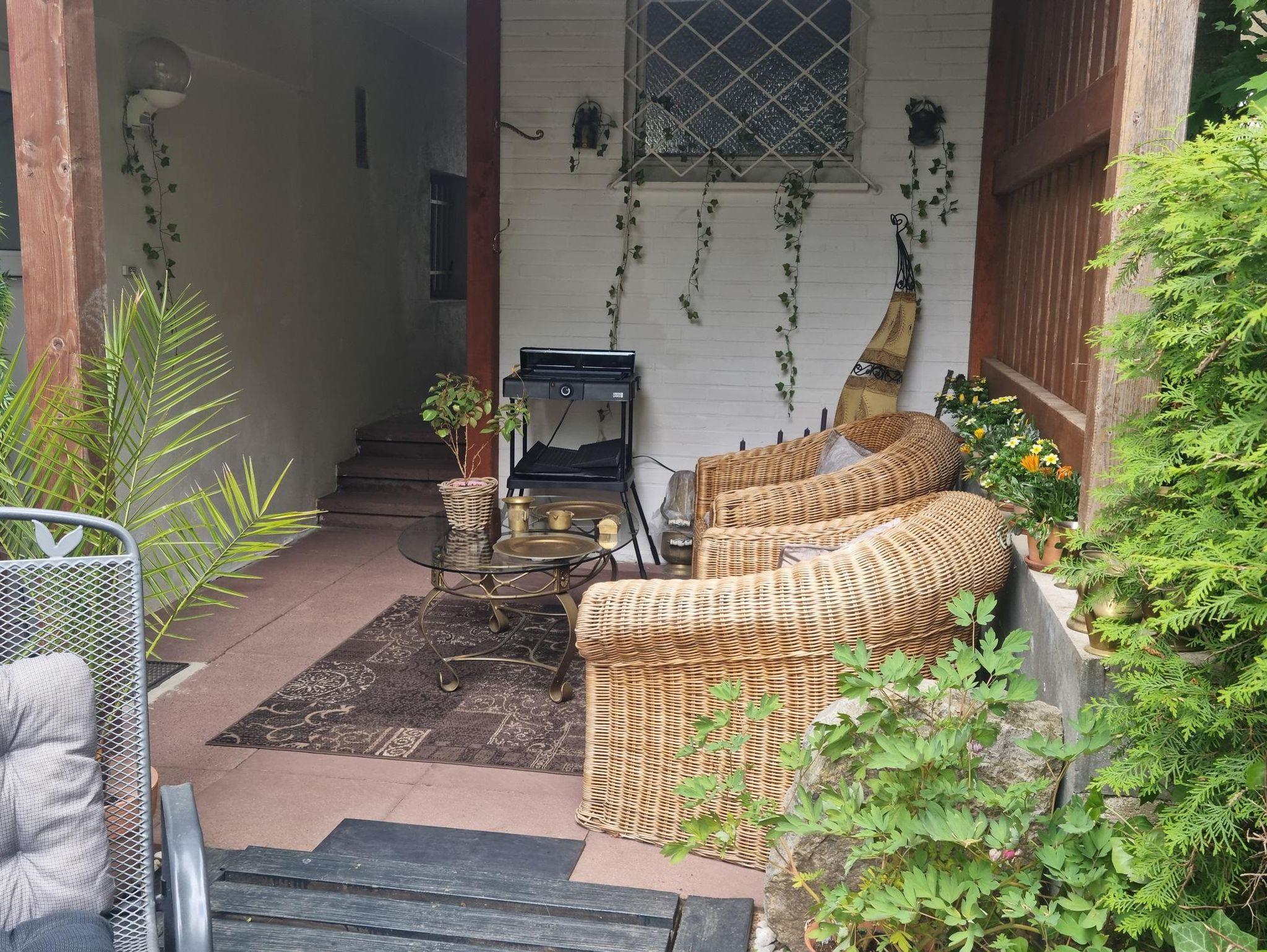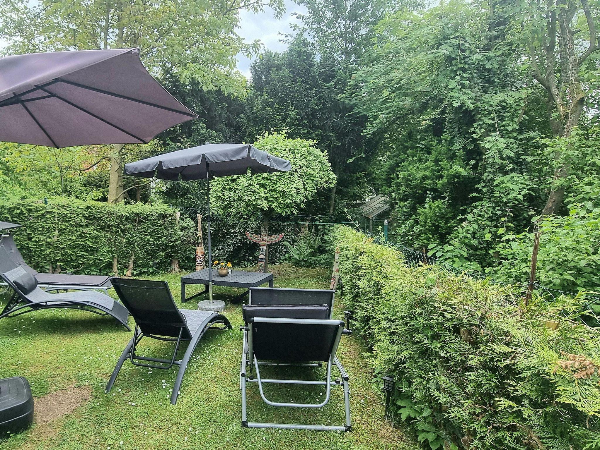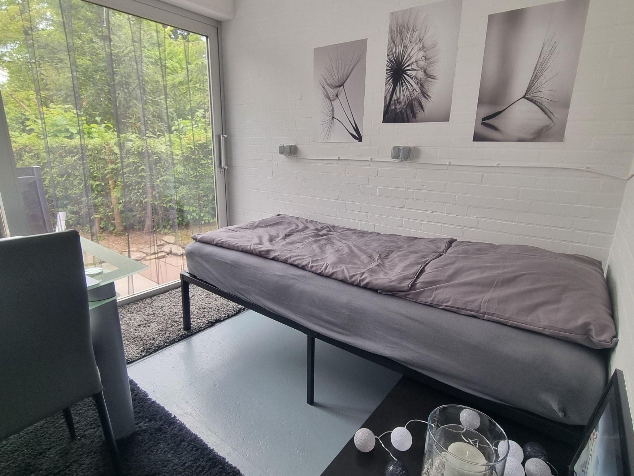 Die liebevoll und modern eingerichtete Parterrewohnung empfängt Sie mit einem separaten Eingang, den Sie über einige Treppenstufen erreichen. Beim Betreten gelangen Sie in den Eingangsbereich mit Garderobe, wo auch Reinigungsmittel, ein LAN-Anschluss für Ihren Laptop, ein Kinderhochstuhl sowie zwei mobile Zustellbetten für den 3. und 4. Gast bereitstehen. Direkt anschließend befindet sich das Badezimmer mit Dusche. Über eine Treppenstufe führt der Weg in das helle Schlafzimmer mit großem Fenster. Hier sorgt ein hochwertiges 1,40 x 2 m Boxspringbett für erholsamen Schlaf. Die Betten sind frisch bezogen, Hand- und Geschirrtücher liegen für Sie bereit. Vom Schlafzimmer aus gelangen Sie entweder in die maßgefertigte, voll ausgestattete Küche mit großem Fenster oder in das lichtdurchflutete Wohn-/Esszimmer.Die Küche bietet alles, was Sie zum Kochen brauchen: Spülmaschine, Herd, Mikrowelle, Kühl-Gefrier-Kombi, zahlreiche Küchenutensilien sowie Kaffeemaschine, Wasserkocher, Standmixer und Toaster. Ein Mülltrennungssystem, Handstaubsauger und Feuerlöscher sind ebenfalls vorhanden. Das großzügige Wohn-/Esszimmer ist der hellste Raum der Wohnung. Ein doppelflügeliges Fenster und eine bodentiefe Glasschiebetür zur Sonnenseite lassen viel Licht herein. Die mobilen Zustellbetten können flexibel platziert werden – im Esszimmer, im Vorraum oder zusätzlich im Schlafzimmer. Im Wohnzimmer laden zwei bequeme Ledersofas mit weichen Auflagen zum Entspannen ein. Ein Couchtisch, ein TV , ein Radio, sowie ein Standventilator sorgen für zusätzlichen Komfort. Ein Essbereich mit großem Glastisch für alle Gäste ist auch vorhanden. Dank des ebenerdigen Zugangs zur eigenen Terrasse und dem angrenzenden Garten fühlt sich die Wohnung wie ein kleines Ferienhaus an. Von etwa 10:00 bis 17:00 Uhr genießen Sie hier auf den Gartenliegen entspannte Sonnenstunden. Die ruhige, nach hinten gelegene Lage garantiert Erholung inmitten der Natur.