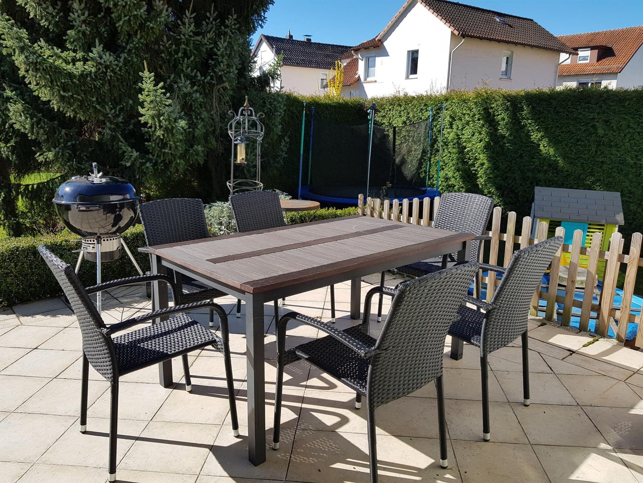 Im Garten befindet sich ein Sandkasten, ein Trampolin, Kleinkinderrutsche, Fussballtor und ein Spielhaus.